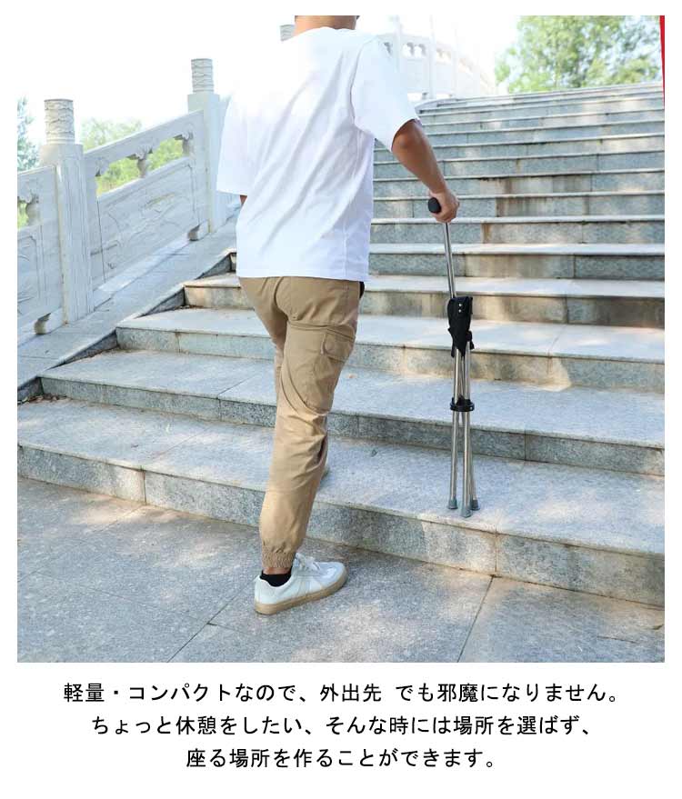| ステッキチェアは軽量で杖にも、折畳み式の三脚の椅子にもなるので便利です。 歩くときは折りたたんで杖として、休む時はイスとして使用できます。 しっかりと握りやすいグリップ形状の持ち手付きです。 軽量?コンパクトなので、外出先 でも邪魔になりません。 ちょっと休憩をしたい、そんな時には場所を選ばず、座る場所を作ることができます。 行楽、イベント、スポーツ観戦、釣り、アウトドア、野外イベント、行列待ちに便利です。 | |