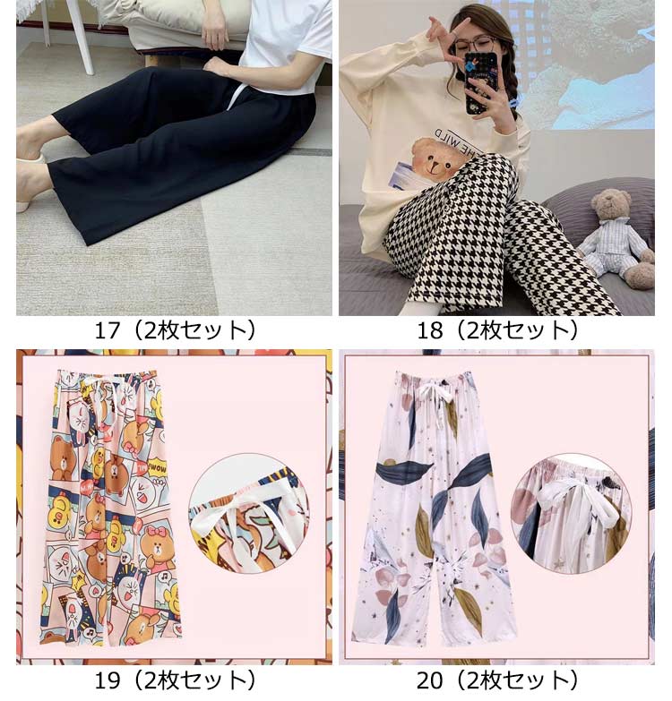 2枚セット!全20種類!ゆったりシルエットで、ひざが隠れる丈感のルームパンツです。春秋はもちろん、夏用のパジャマとしても活躍してくれます。リラックスタイムにぴったり♪通気性がよく涼しい。女性らしいカラフルなカラーと柄がオシャレ。