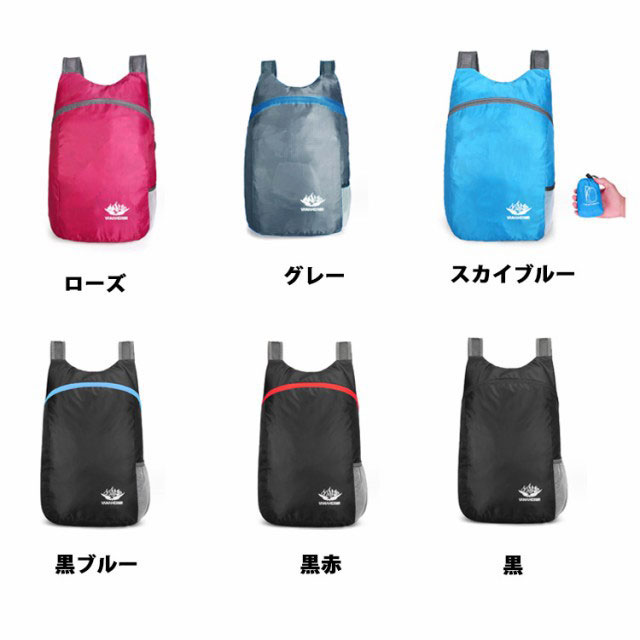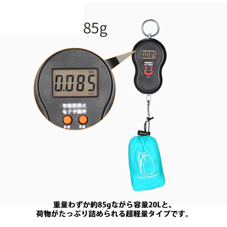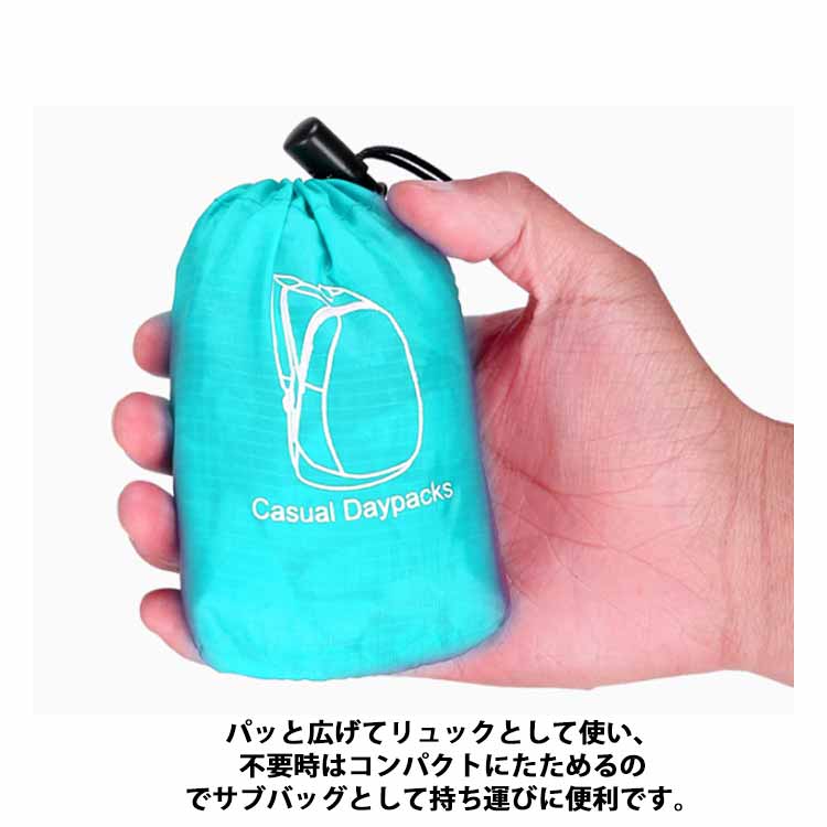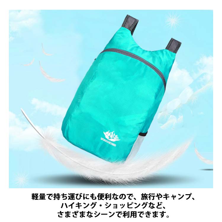 ・コンパクトに携帯できる折りたたみリュック・パッと広げてリュックとして使い、不要時はコンパクトにたためるのでサブバッグとして持ち運びに便利です。・重量わずか約85gながら容量20Lと、荷物がたっぷり詰められる超軽量タイプです。・軽量で持ち運びにも便利なので、旅行やキャンプ、ハイキング・ショッピングなど、さまざまなシーンで利用できます。・メッシュで蒸れにくいショルダーベルトを採用しています。・カラーバリエーションが豊富で、男女性問わず使えます。