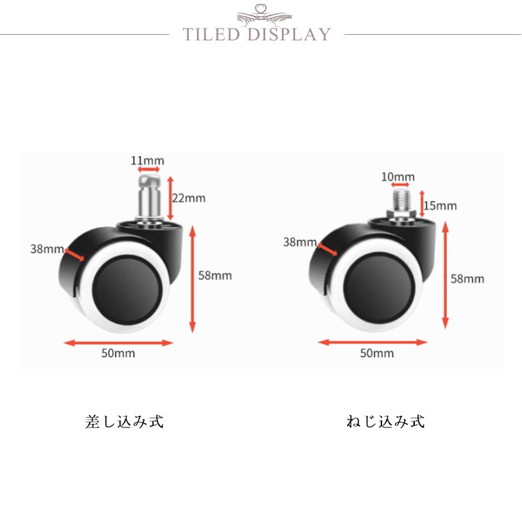 | 5個入り!差し込み式?ネジ込み式の2タイプ!オフィスチェア交換用キャスター。 フローリングの床にキズが付きにくいウレタン巻きの双輪キャスターです。 小型でシンプルなデザイン、取り付け簡単。 キャスターが破損した時の交換用に便利です。 オフィスチェア、パソコンチェア、学習チェアなど、ほとんどのイスに対応することが可能です。 | |