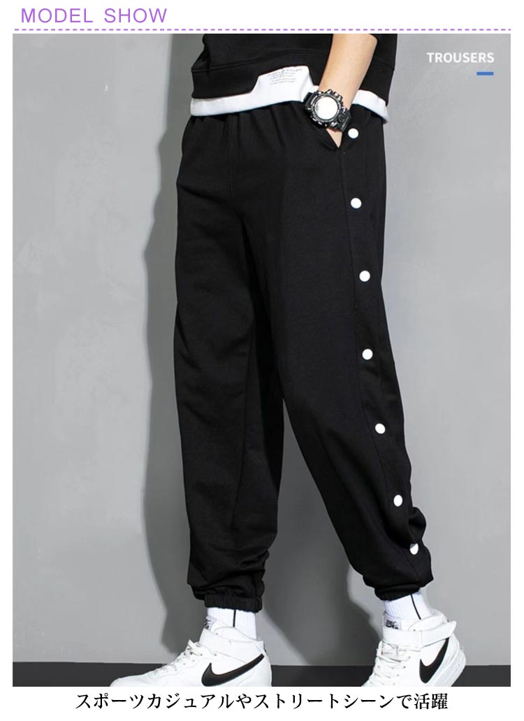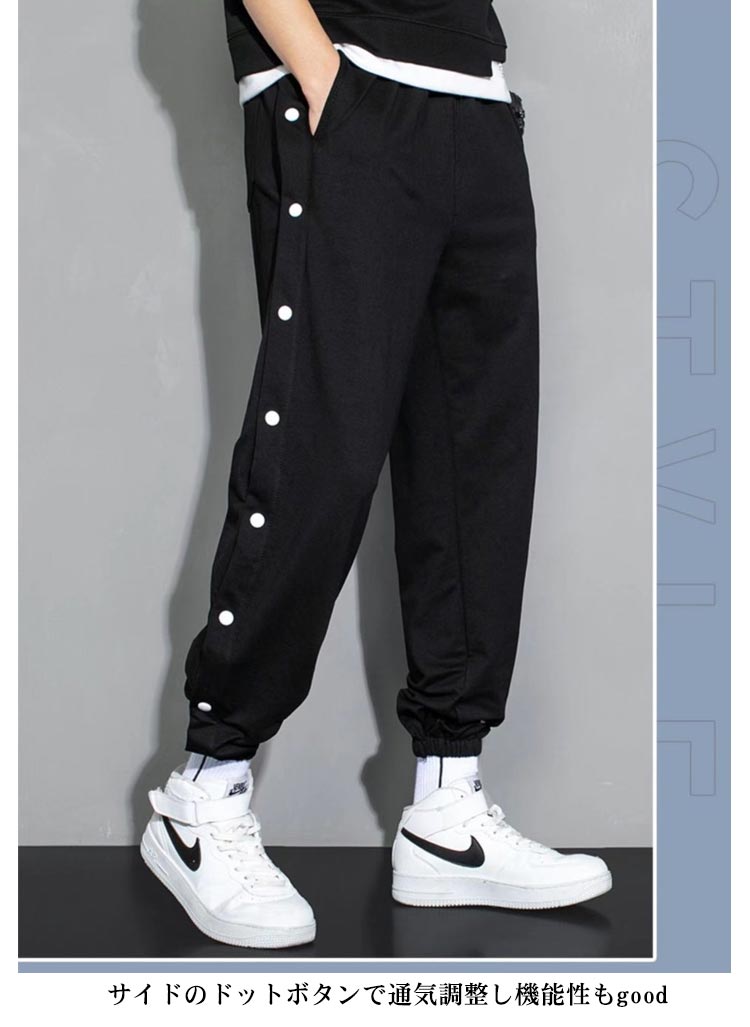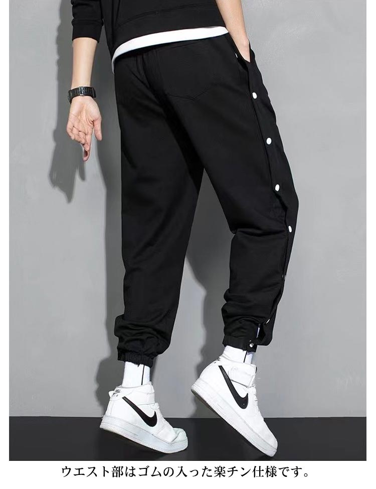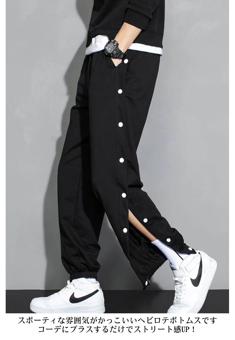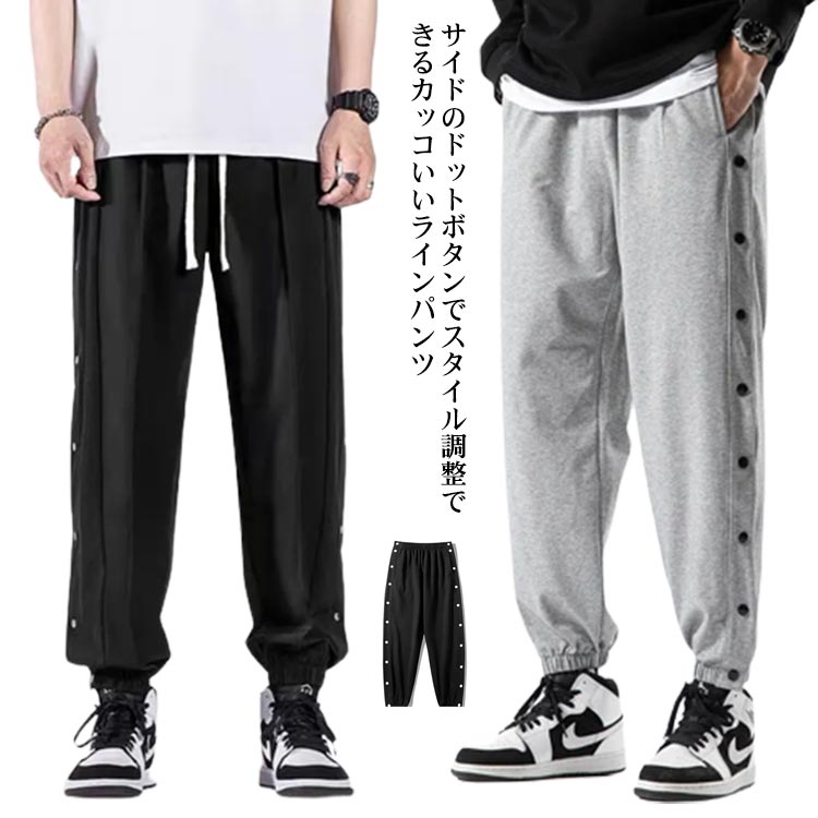 ラインジャージパンツ スウェットパンツ メンズ ジョガーパンツ サイドスリット サイドボタン サイド開き スポーツパンツ バスケットボールパンツ ロングパンツ サルエル ゆったり B系 ストリート系 かっこいい 黒 白 ブラック ホワイト