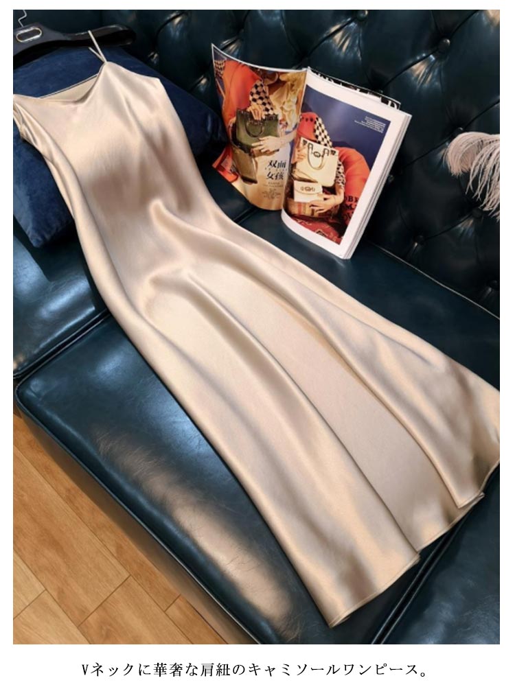 サテンロング丈ワンピース。Vネックに華奢な肩紐のキャミソールワンピース。光沢感のある上品なサテン素材でひらひらとエレガント。春にはレースインナーとコーデして、様々なコーディネートに使えるアイテムです。