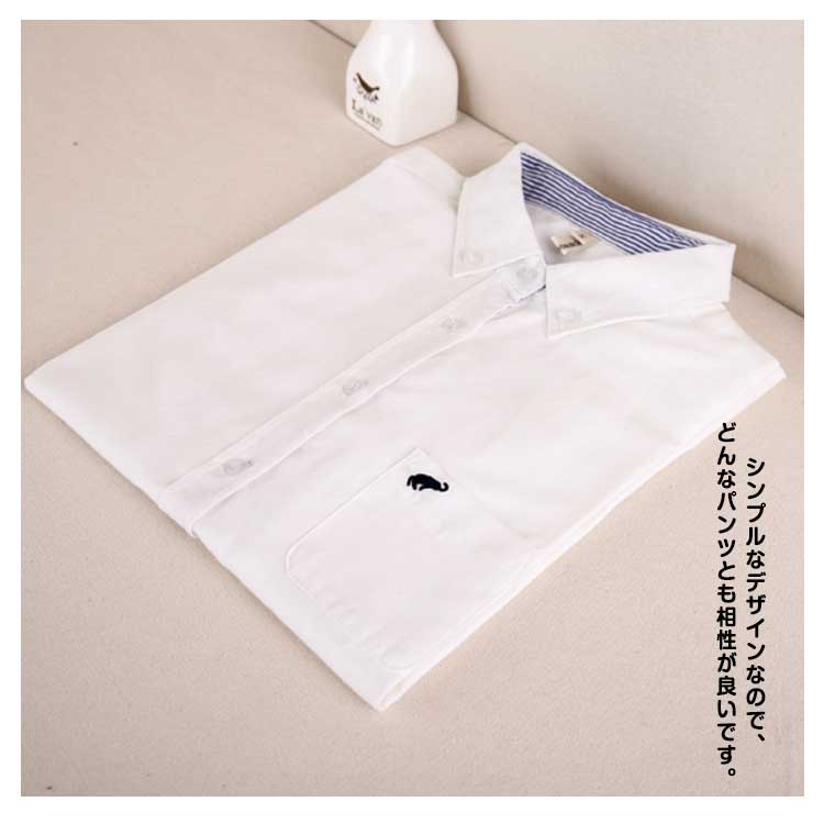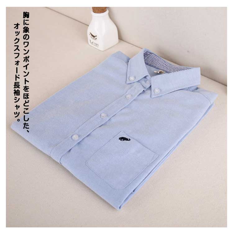 | 胸に象のワンポイントをほどこした、オックスフォード長袖シャツ。 ボタンダウンと襟の内側のストライプがさり気なくオシャレです。 着心地の良い素材感で、オールシーズン着回しやすいです。 お出かけやデート等、カジュアルな場面ではクールな大人女性の印象を感じさせてくれます。 オフィスや通勤等フォーマルな場面でも活躍できる1枚です。 爽やかな印象を与える「水色」と、シンプルでスッキリした印象を与える「白色」の2色から選べます。 シンプルなデザインなので、どんなパンツとも相性が良いです。 | |