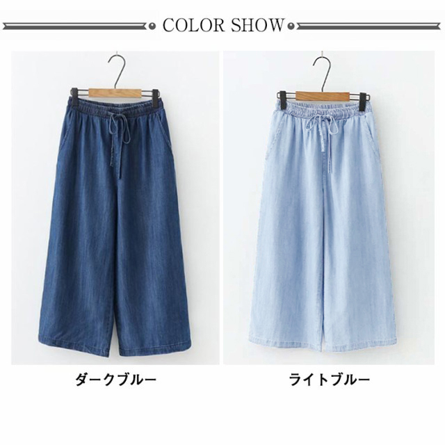 ワイドパンツ デニムパンツ ガウチョパンツ レディース 7分丈 涼しい ウェストゴム ハイウェスト ポケット付き イージーパンツ 薄手 ゆるパンツ カジュアル 夏 無地 全2色