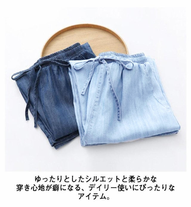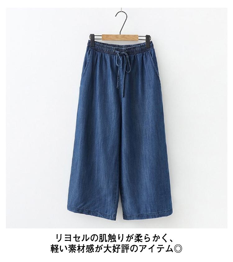 ・柔らかで動きやすい!着回し自在のデニムワイドパンツ。・ゆったりとしたシルエットと柔らかな穿き心地が癖になる、デイリー使いにぴったりなアイテム。・風通る7分丈で暑い季節は快適。・リヨセルの肌触りが柔らかく、軽い素材感が大好評のアイテム◎・デニムの窮屈さが苦手な方にもおすすめの、心地よいボトムスです。・開きすぎないフレア裾ですっきり。カジュアルにもキレイめなスタイルにも。・ウエスト総ゴム仕様でラクチン。・左右ポケットがあるので、小物を入れるのに便利。・トップスを選ばないシンプルカラーで着回しやすいのも魅力。