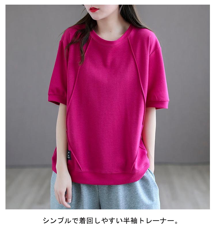 シンプルで着回しやすい半袖トレーナー。5分袖で気になる二の腕もしっかりとカバー。身幅は少し広めに仕立てており、身体のラインを拾わない。お出かけ用カジュアルコーデからルームウェア・リラックスウェアといったワンマイルウェアとしてもおススメ♪