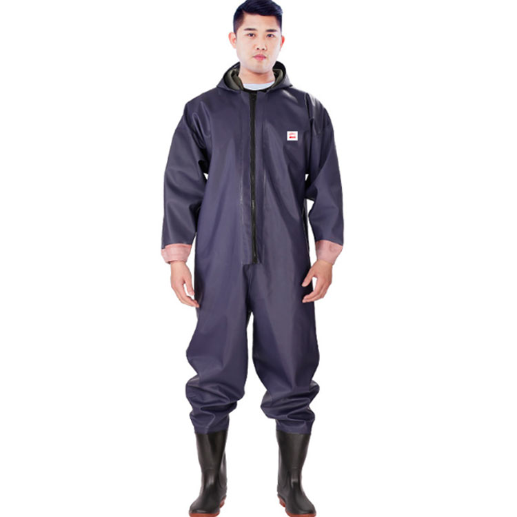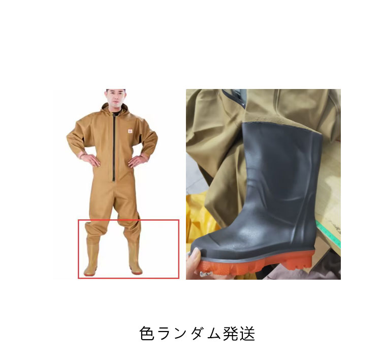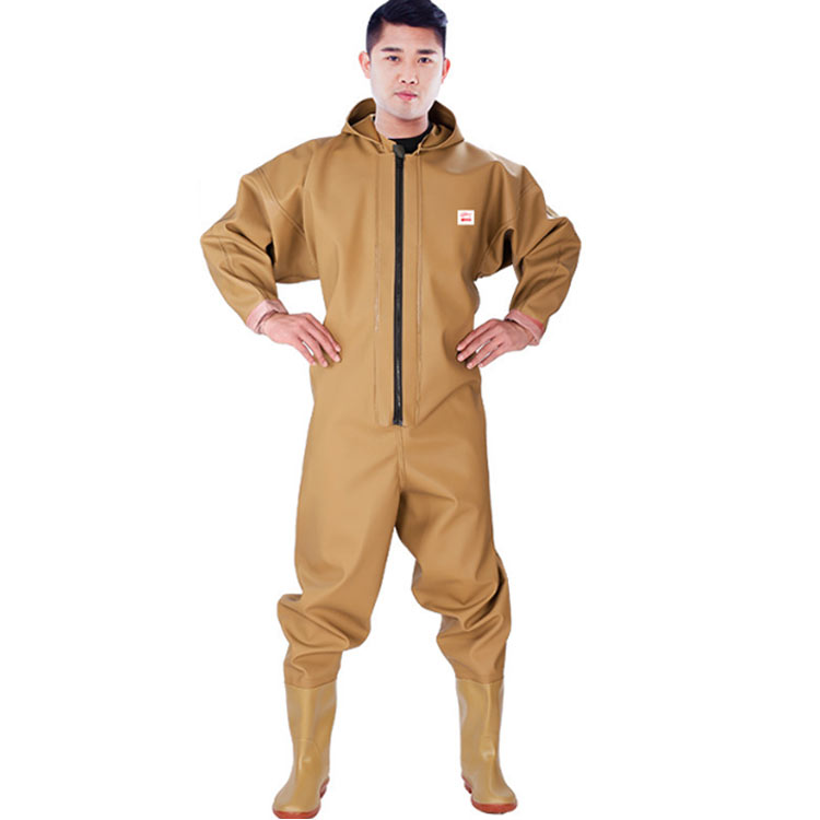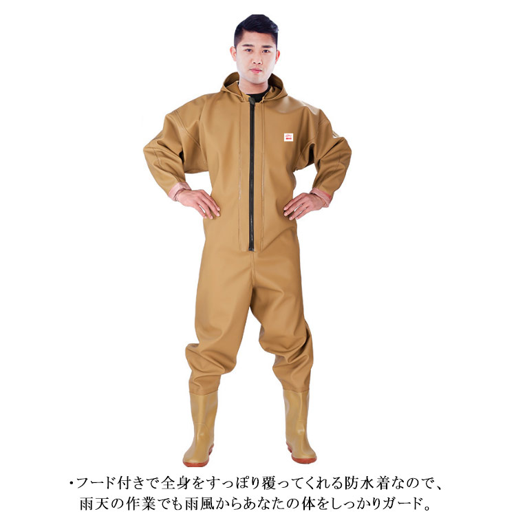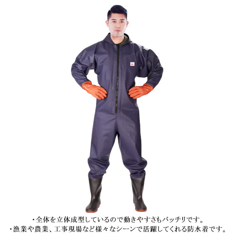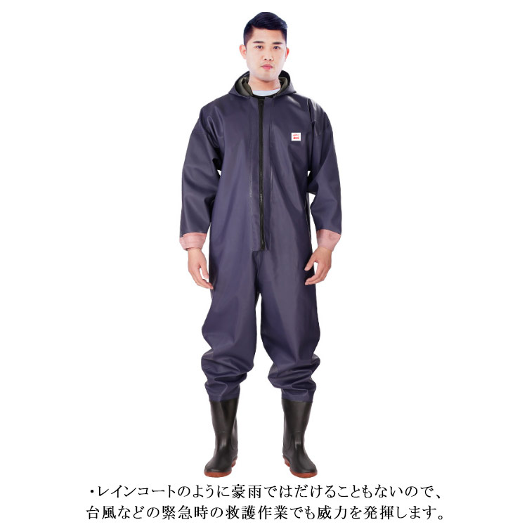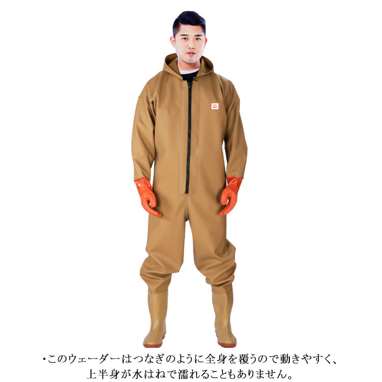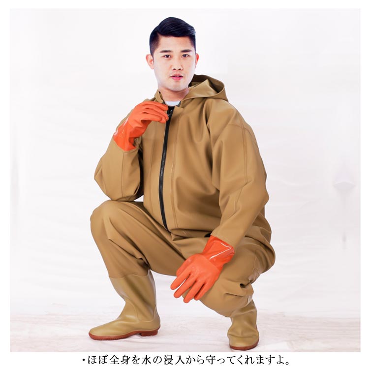 ・首元まで防水してくれるウェーディング用スーツです。・ほぼ全身を水の浸入から守ってくれますよ。・このウェーダーはつなぎのように全身を覆うので動きやすく、上半身が水はねで濡れることもありません。・フード付きで全身をすっぽり覆ってくれる防水着なので、雨天の作業でも雨風からあなたの体をしっかりガード。・レインコートのように豪雨ではだけることもないので、台風などの緊急時の救護作業でも威力を発揮します。・素材は厚手のPVCで傷つきにくく、水の侵入はもちろん外気からも肌をしっかり守ります。・胸ファスナーも水の侵入を防ぐ仕様で、さらにその下にも防水布を装備。・靴底も滑り止めの着いた弾力素材なので履き心地もGood。・全体を立体成型しているので動きやすさもバッチリです。・漁業や農業、工事現場など様々なシーンで活躍してくれる防水着です。