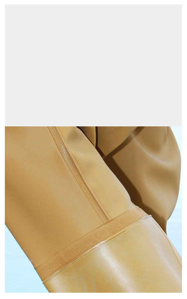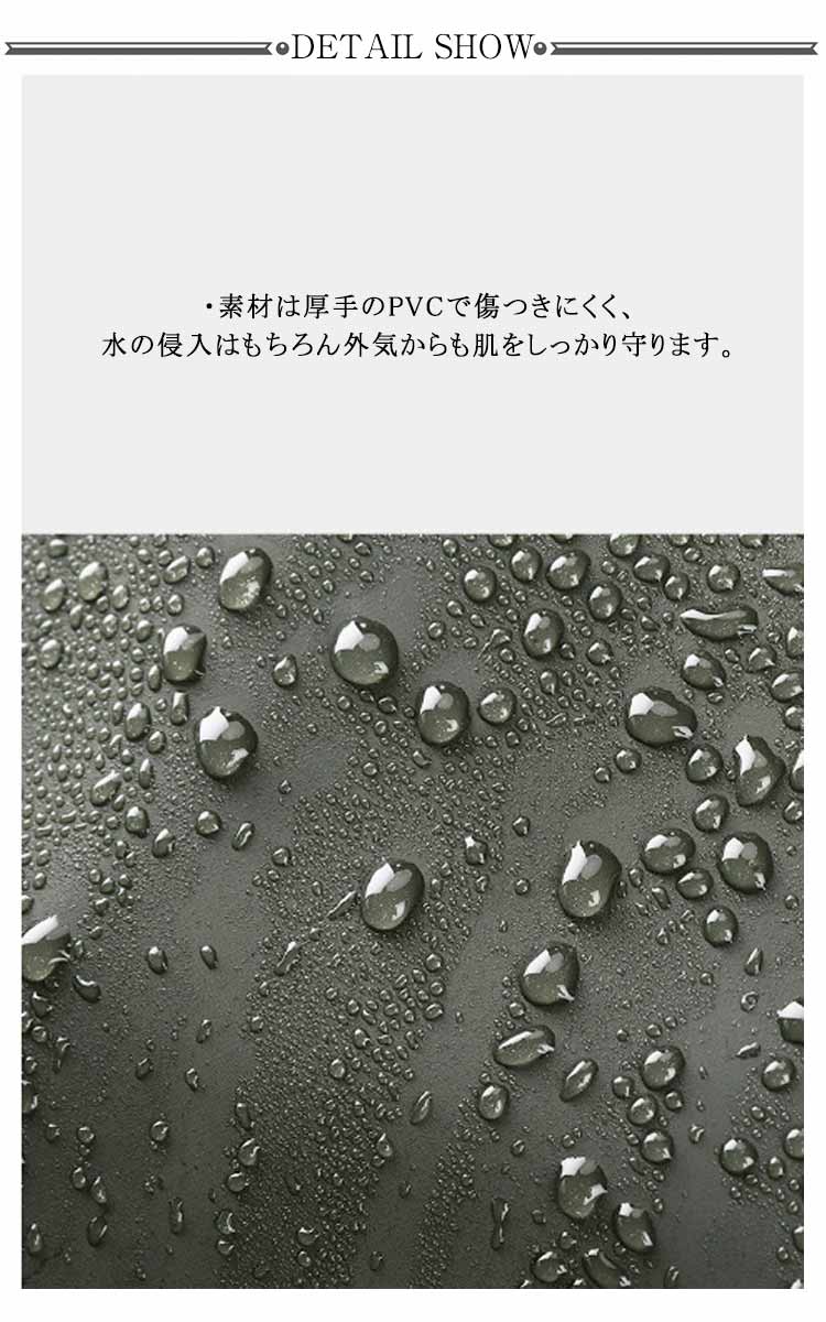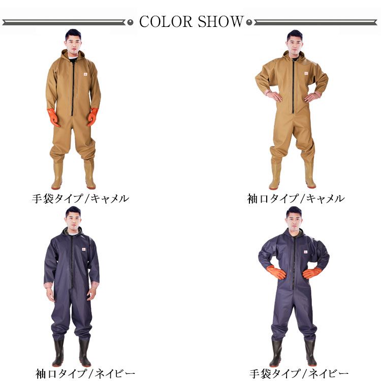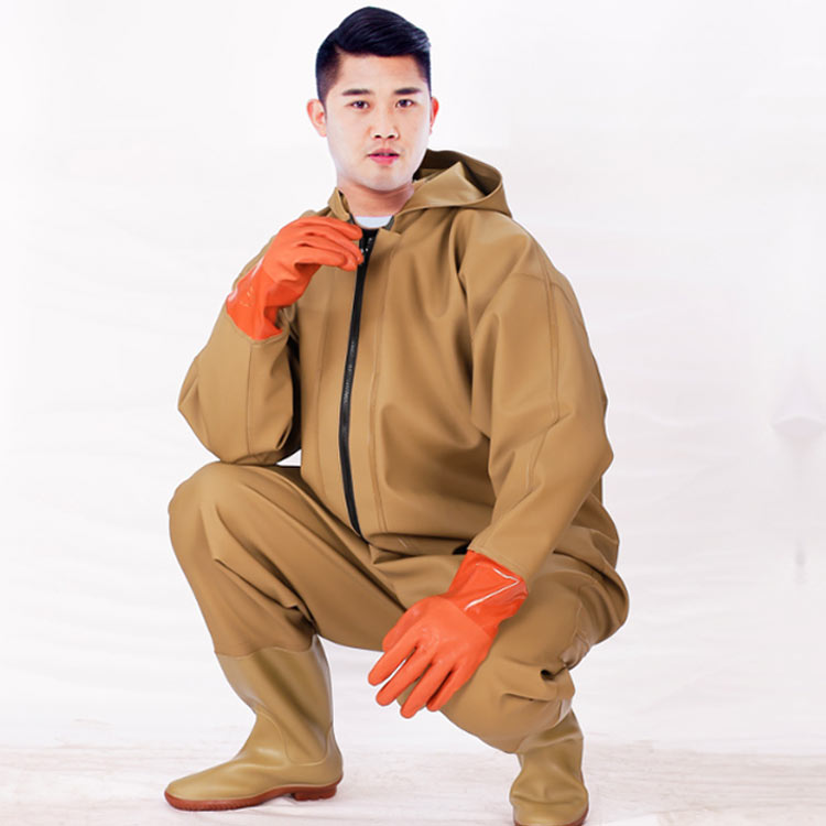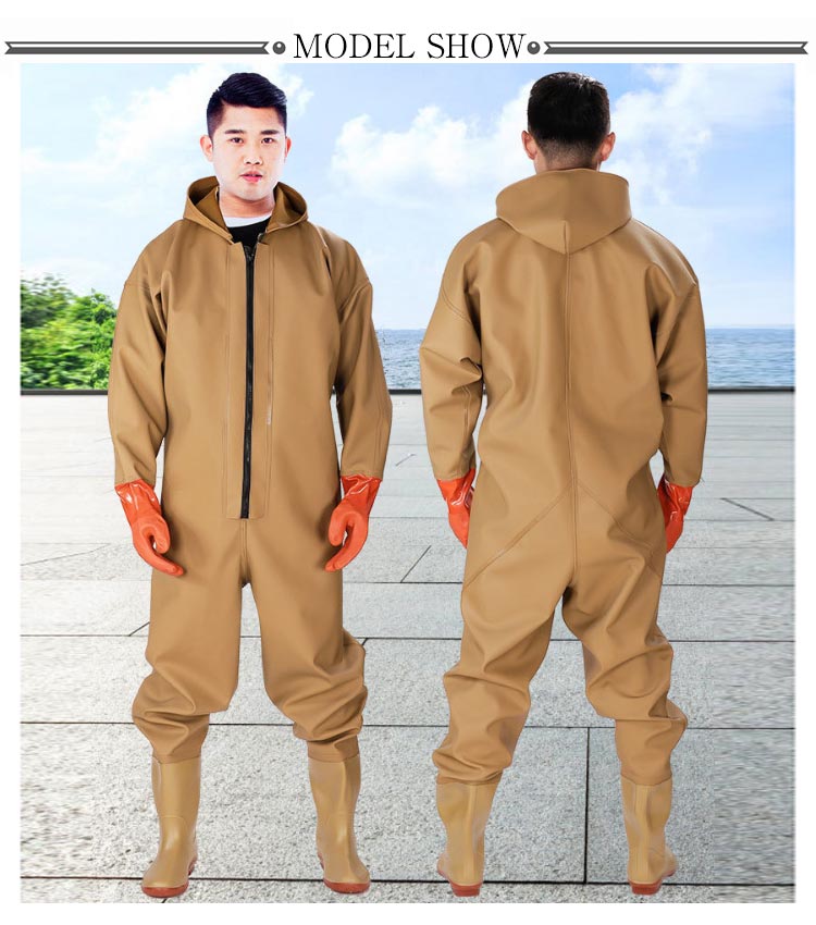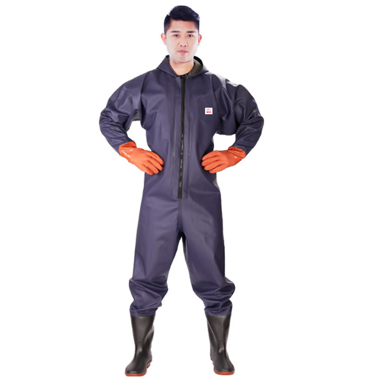 ・首元まで防水してくれるウェーディング用スーツです。・ほぼ全身を水の浸入から守ってくれますよ。・このウェーダーはつなぎのように全身を覆うので動きやすく、上半身が水はねで濡れることもありません。・フード付きで全身をすっぽり覆ってくれる防水着なので、雨天の作業でも雨風からあなたの体をしっかりガード。・レインコートのように豪雨ではだけることもないので、台風などの緊急時の救護作業でも威力を発揮します。・素材は厚手のPVCで傷つきにくく、水の侵入はもちろん外気からも肌をしっかり守ります。・胸ファスナーも水の侵入を防ぐ仕様で、さらにその下にも防水布を装備。・靴底も滑り止めの着いた弾力素材なので履き心地もGood。・全体を立体成型しているので動きやすさもバッチリです。・漁業や農業、工事現場など様々なシーンで活躍してくれる防水着です。