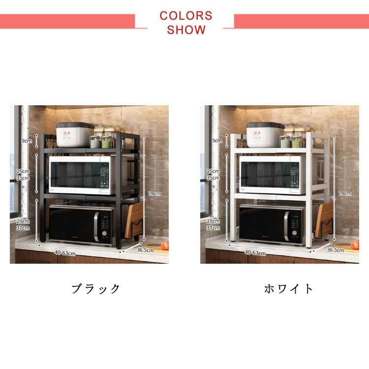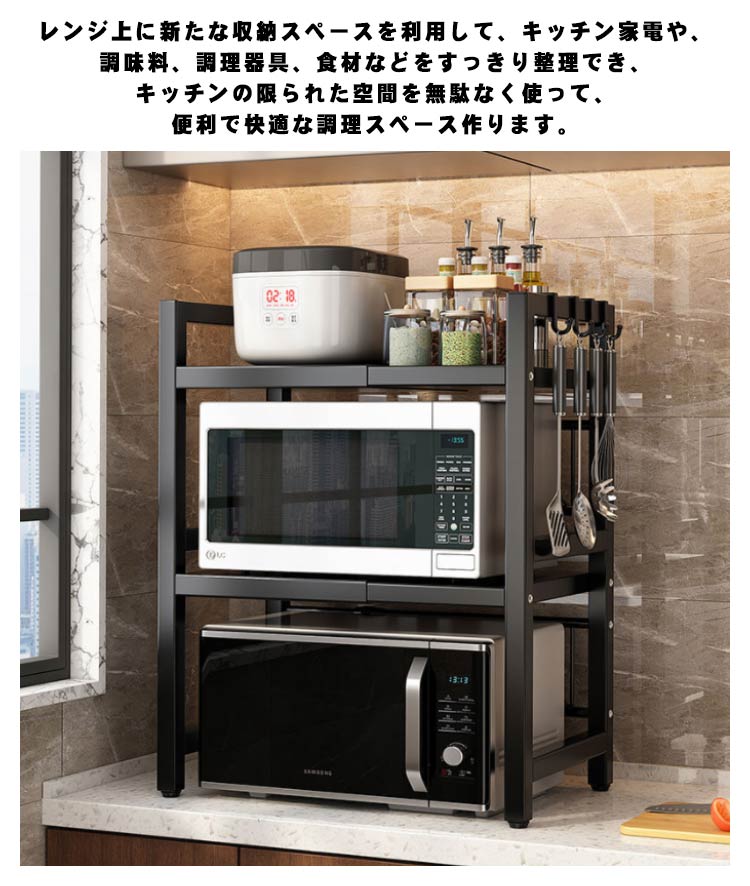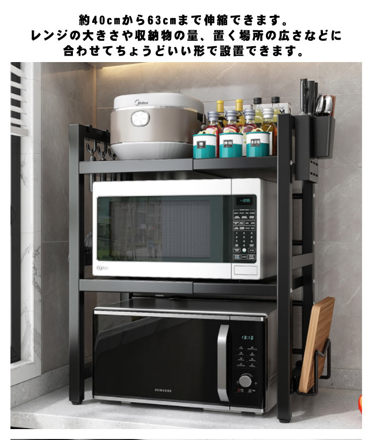 ラック 伸縮 レンジラック キッチンラック レンジ上 レンジ棚 3段 キッチン収納 おしゃれ シンプル 北欧 スリム トースター ラック 電子レンジ台 キッチンカウンター上収納 キッチン用品 台所収納 伸縮キッチンラック 2段タイプ ホワイト ブラック