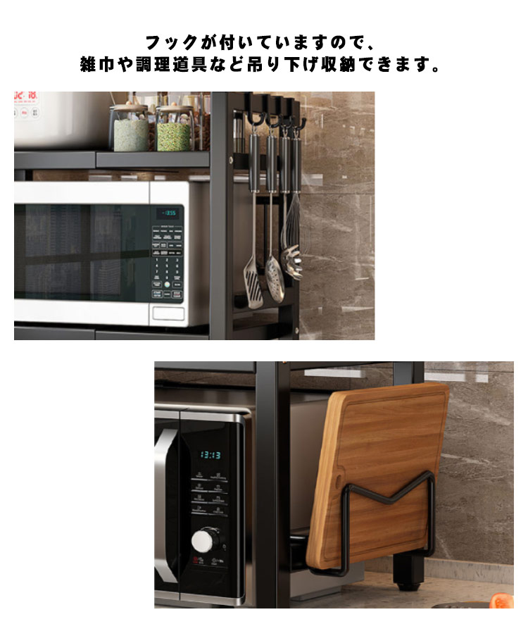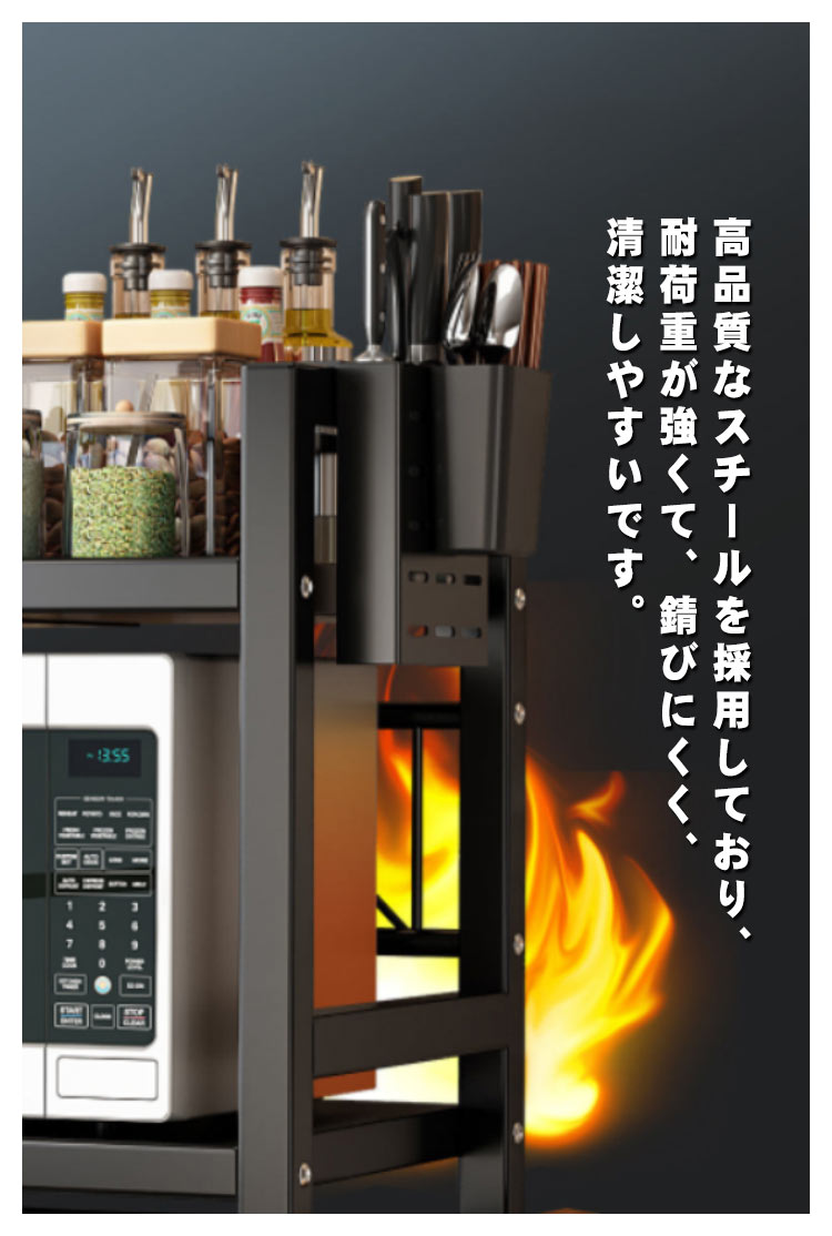 【頑丈&清潔しやすい】高品質なスチールを採用しており、耐荷重が強くて、錆びにくく、清潔しやすいです。汚れや水が付いた際は、サッと拭き取るだけでお手入れは簡単です。【フック、箸立て、包丁スタンド付き】フックが付いていますので、雑巾や調理道具など吊り下げ収納できます。【キッチンスペースを有効活用】レンジ上に新たな収納スペースを利用して、キッチン家電や、調味料、調理器具、食材などをすっきり整理でき、キッチンの限られた空間を無駄なく使って、便利で快適な調理スペース作ります。