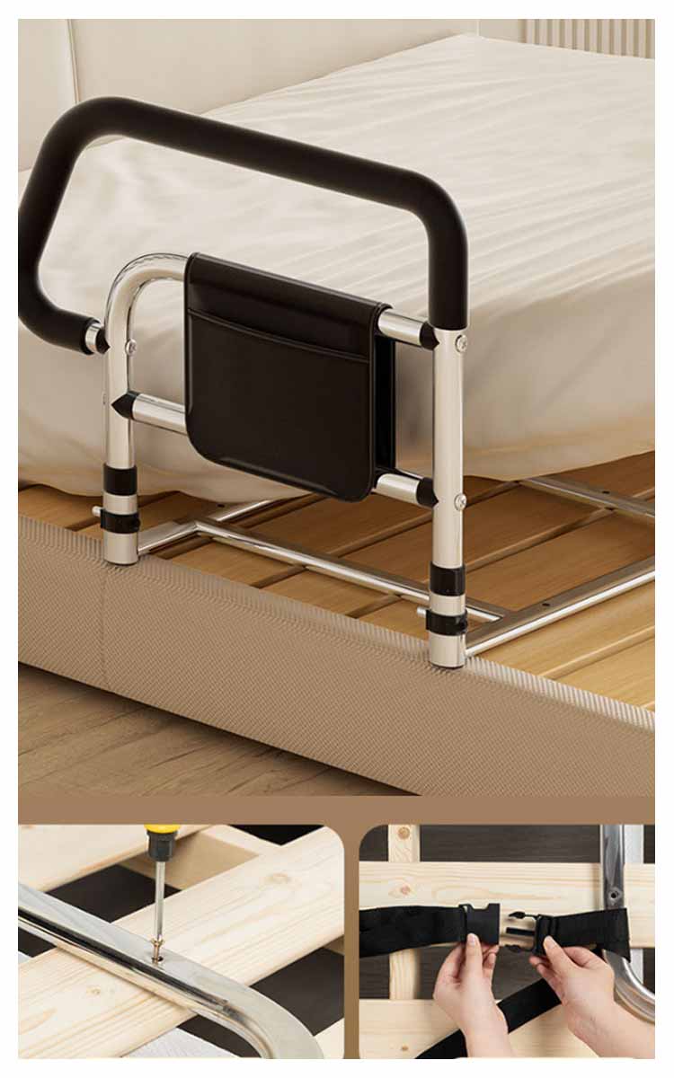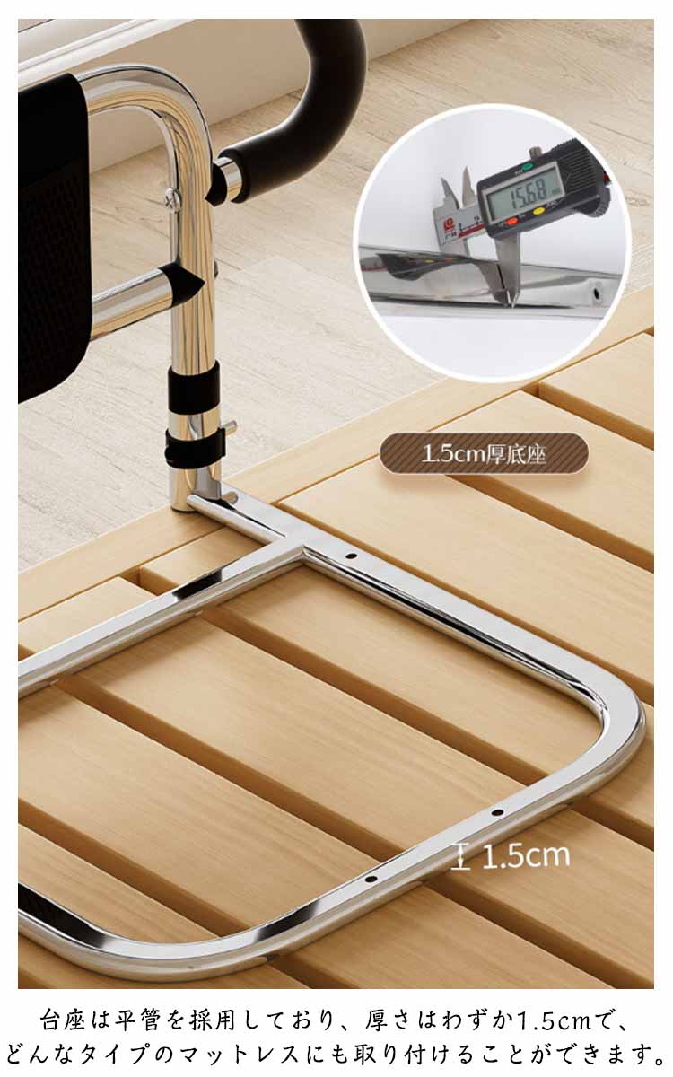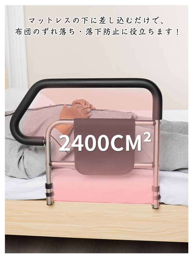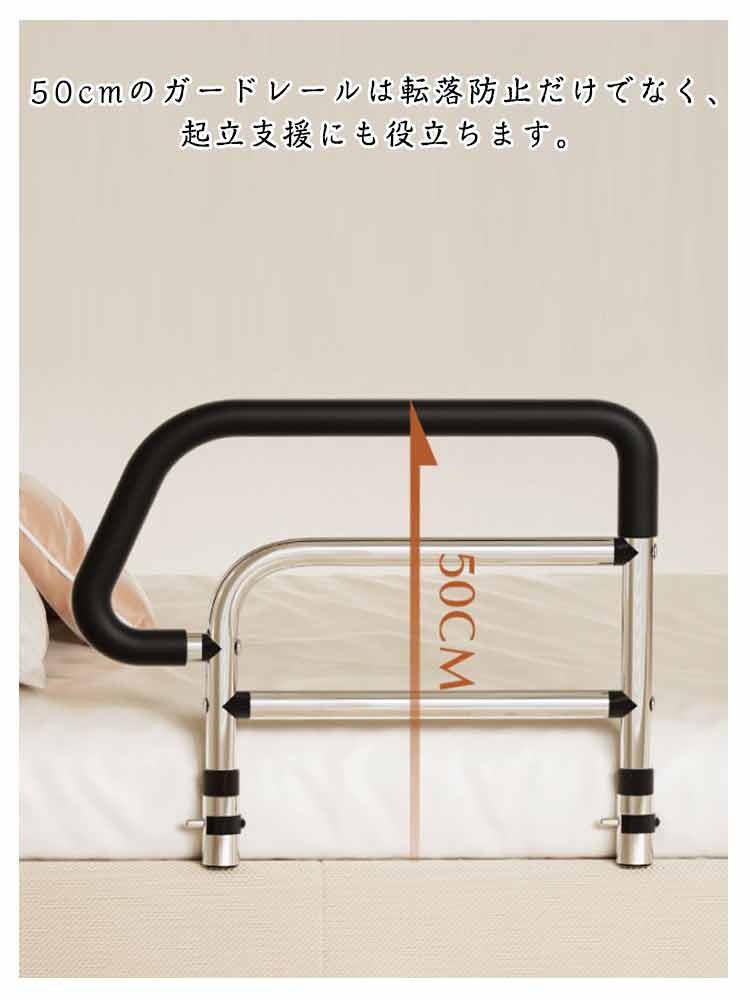 【ベッドサイドガード】【転落防止】【落下防止】ベッドから起き上がるのに苦労している方にベッドへの出入りを支援するように設計されています。50cmのガードレールは転落防止だけでなく、起立支援にも役立ちます。マットレスの下に差し込むだけで、布団のずれ落ち・落下防止に役立ちます!塗装された炭素鋼でできており、耐久性があり、強い耐荷重能力を持っています。台座は平管を採用しており、厚さはわずか1.5cmで、どんなタイプのマットレスにも取り付けることができます。手すりの部分は滑り止めゴムが付き、滑り止め効果がありながら、冬でも冷たさを感じにくく。収納ポケットが装備され、携帯電話、薬、メガネ、本、リモコンなど様々な小物を収納するのに便利です。また、ひざや腰に負担をかけずに立ち上がるための補助としてもご利用いただけます。