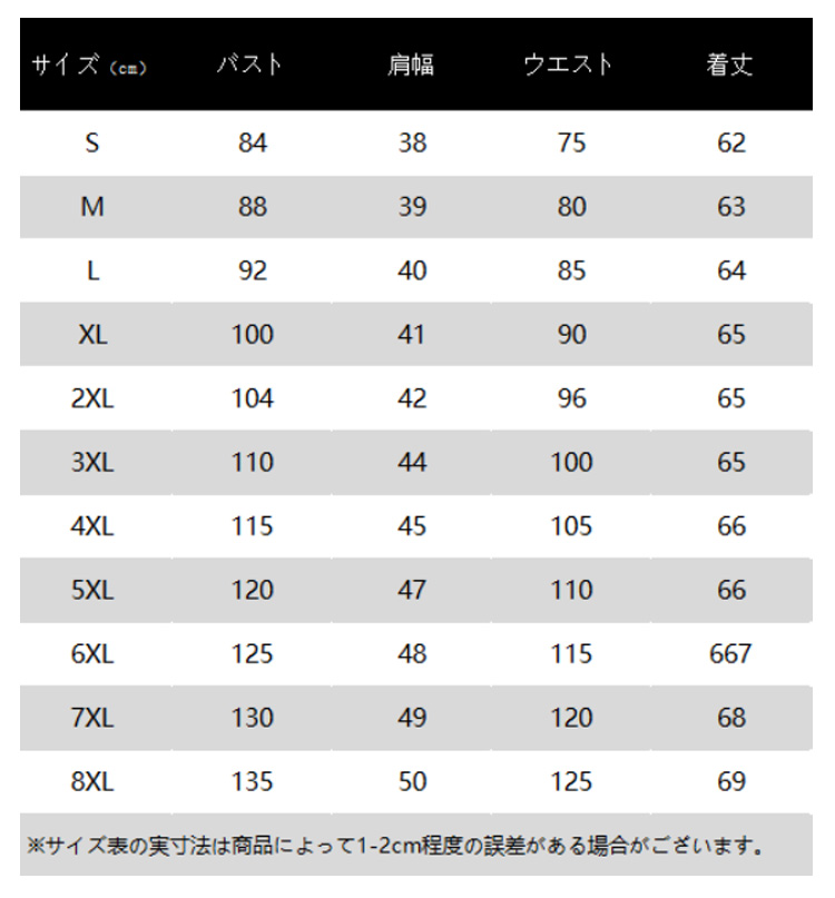 | サイズ | S M L XL 2XL 3XL 4XL 5XL 6XL 7XL 8XL |