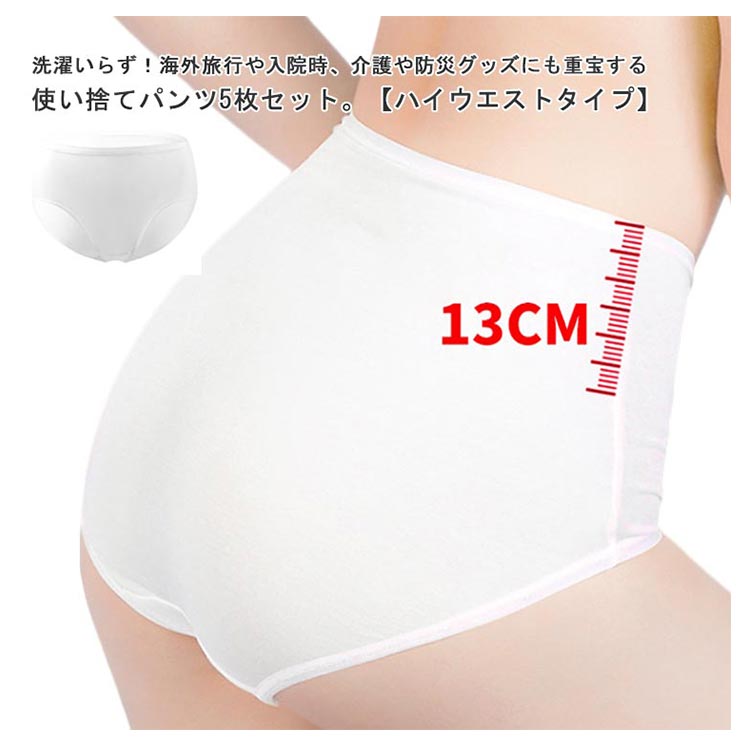 洗濯いらず!海外旅行や入院時、介護や防災グッズにも重宝する使い捨てパンツ5枚セット。【ハイウエストタイプ】ハイウエストでお腹もお尻もすっぽりやさしく包み込んでくれます!柔らかい肌触りで、通気性がよく肌にやさしいコットン素材を使用。ぐいっと伸びるストレッチ素材で履くときもラクラク。
