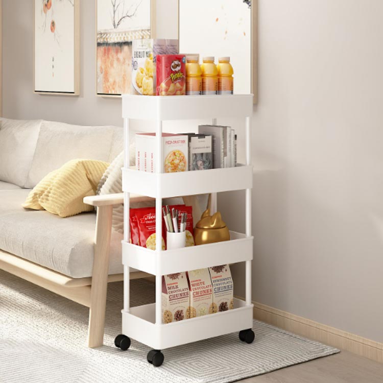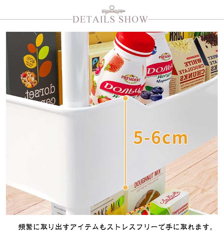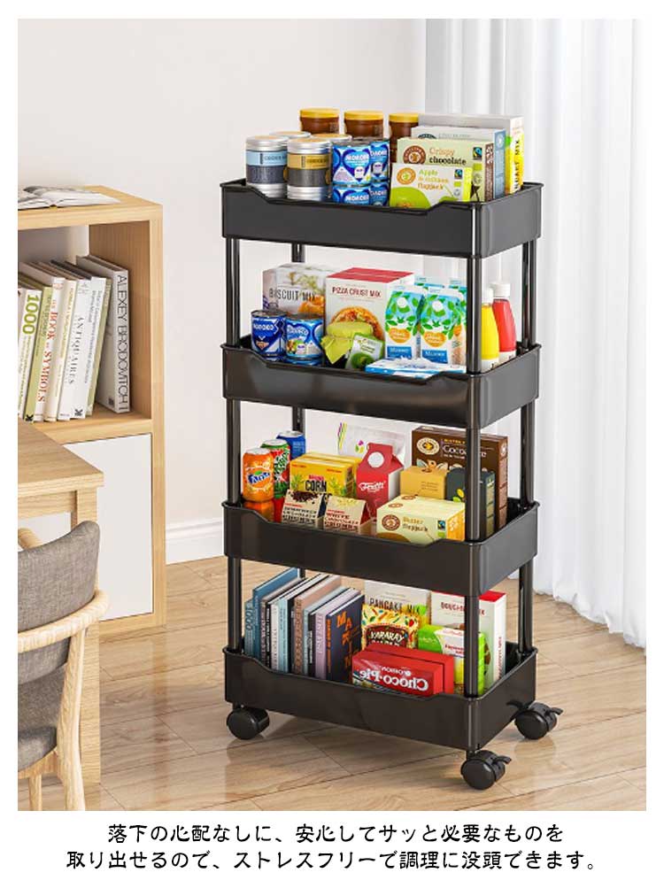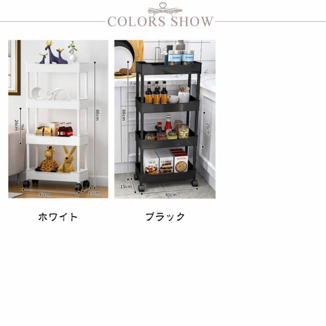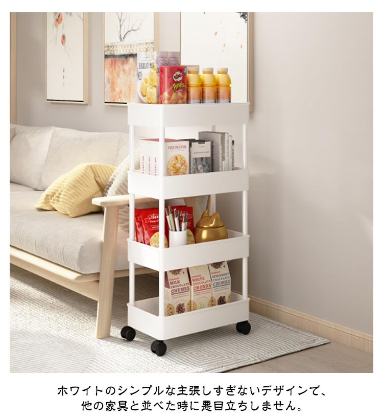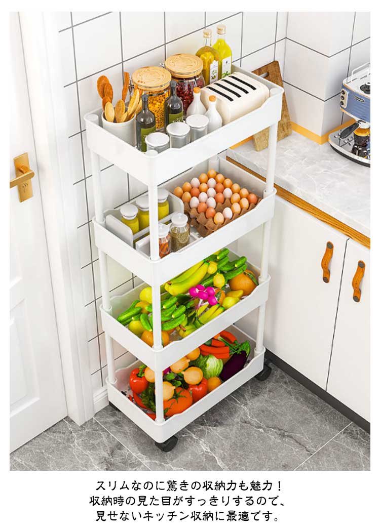 4段-幅15cmキャスター付きストッカー収納時の見た目がすっきりする!ちょっとした隙間が統一感ある収納スペースに早変わり!幅わずか15cm!収納はできるだけ目立たないよう、バレないようにしたいもの。スリムなのに驚きの収納力も魅力!収納時の見た目がすっきりするので、見せないキッチン収納に最適です。頻繁に取り出すアイテムもストレスフリーで手に取れます。落下の心配なしに、安心してサッと必要なものを取り出せるので、ストレスフリーで調理に没頭できます。ホワイトのシンプルな主張しすぎないデザインで、他の家具と並べた時に悪目立ちしません。キッチン・リビング・クローゼット収納・納戸の収納棚・玄関収納・子供部屋など、色々なシーンで使える便利なスリムトローリーです。