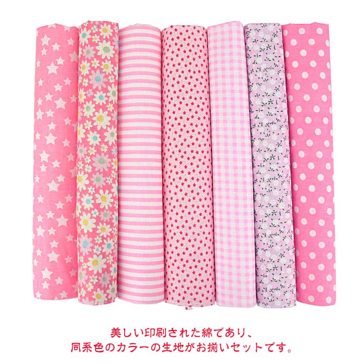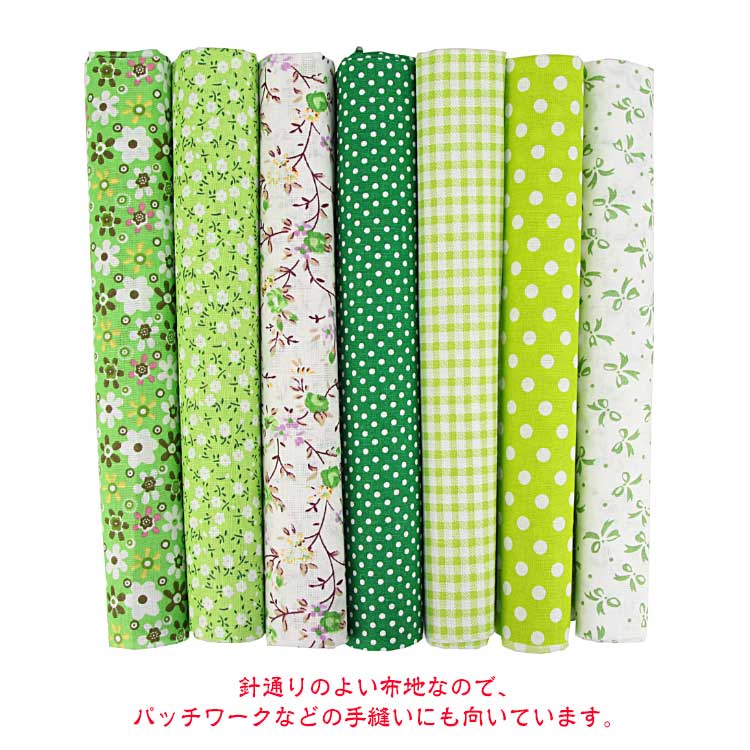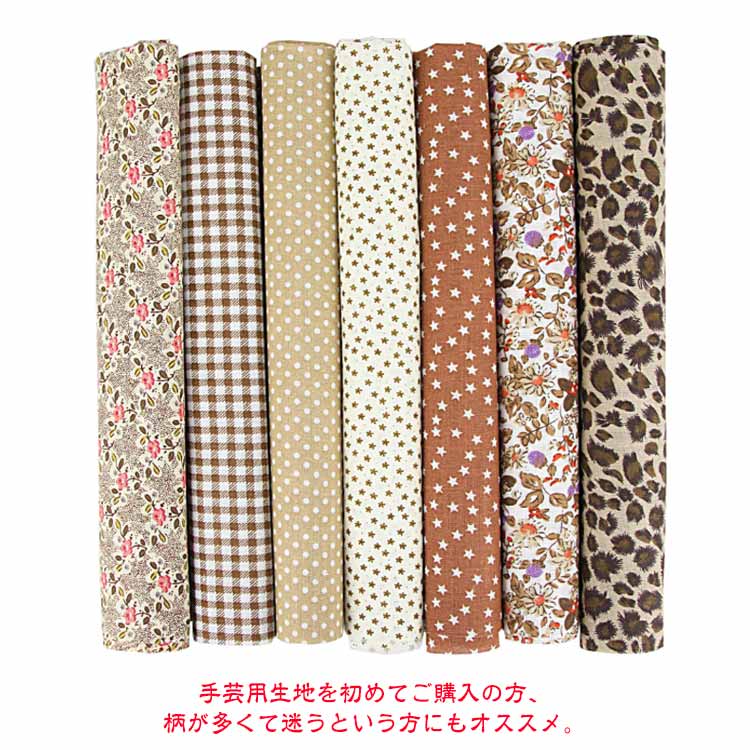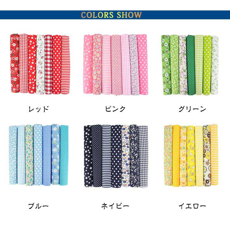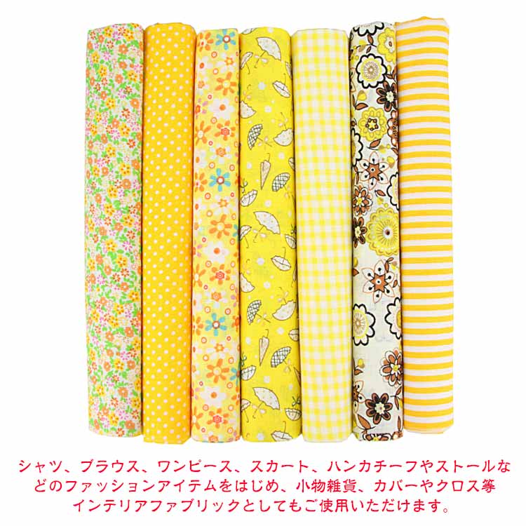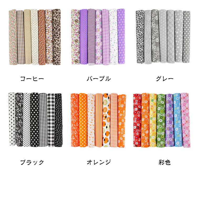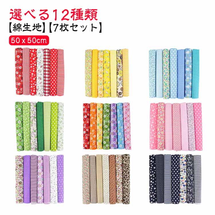 【7枚セット】【50x50cm】【選べる12種類】【綿生地】美しい印刷された綿であり、同系色のカラーの生地がお揃いセットです。針通りのよい布地なので、パッチワークなどの手縫いにも向いています。発色が良くて色あわせもしやすいデザインで、入園、入学準備、小物作り、ハンドメイド手芸などにおすすめです。手作りのDIYの小さな布バッグ、ポーチ、キルティング、パッチワーク、寝具セット縫製、スクラップ、手芸、衣類、子供服、人形、カーテン、クッション、家の装飾縫製などに適しています。シャツ、ブラウス、ワンピース、スカート、ハンカチーフやストールなどのファッションアイテムをはじめ、小物雑貨、カバーやクロス等インテリアファブリックとしてもご使用いただけます。手芸用生地を初めてご購入の方、柄が多くて迷うという方にもオススメ。