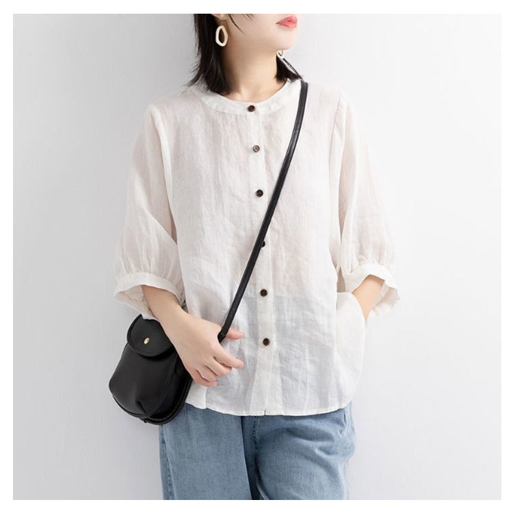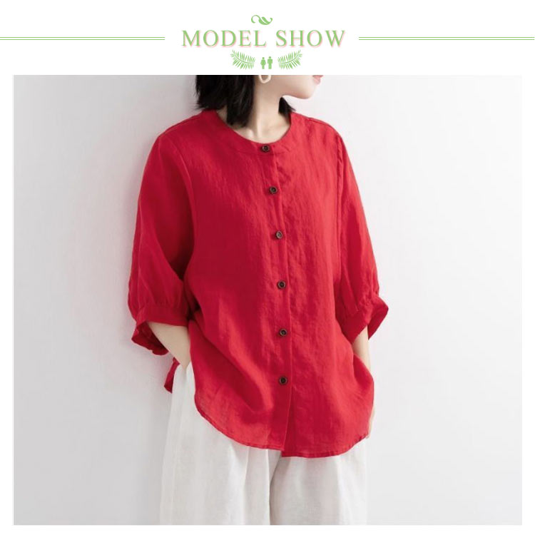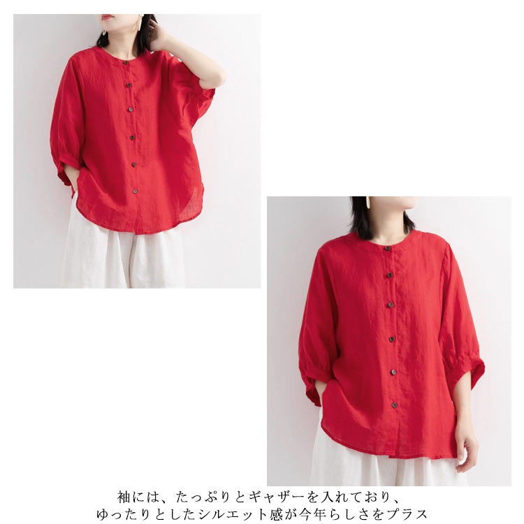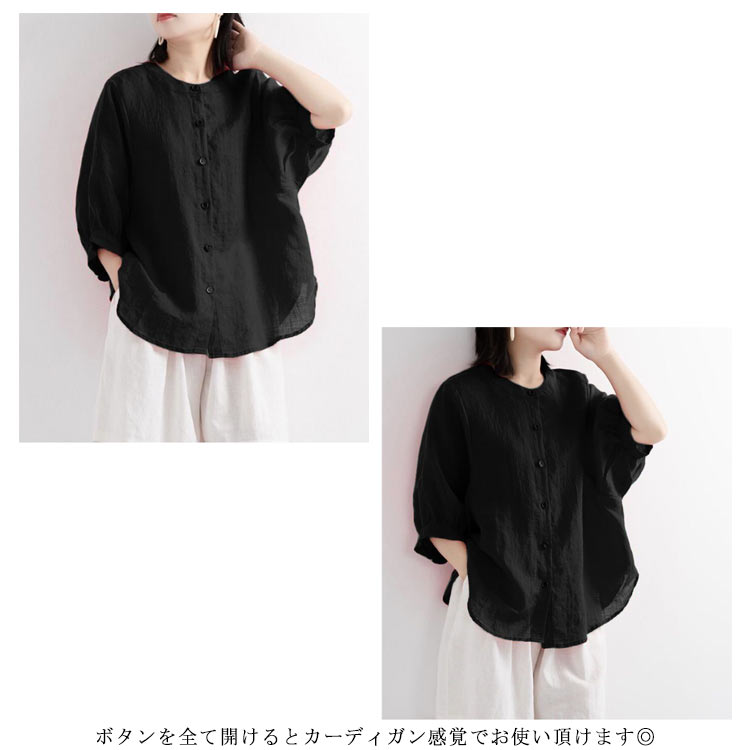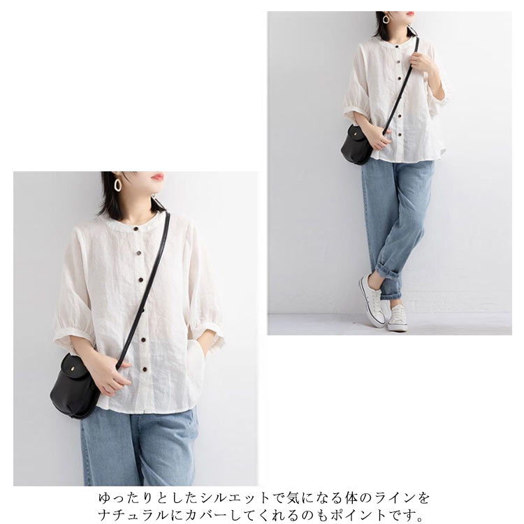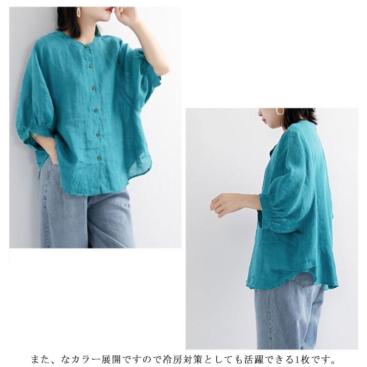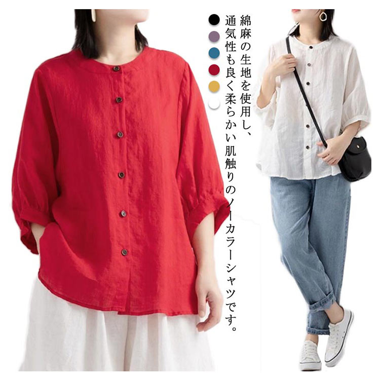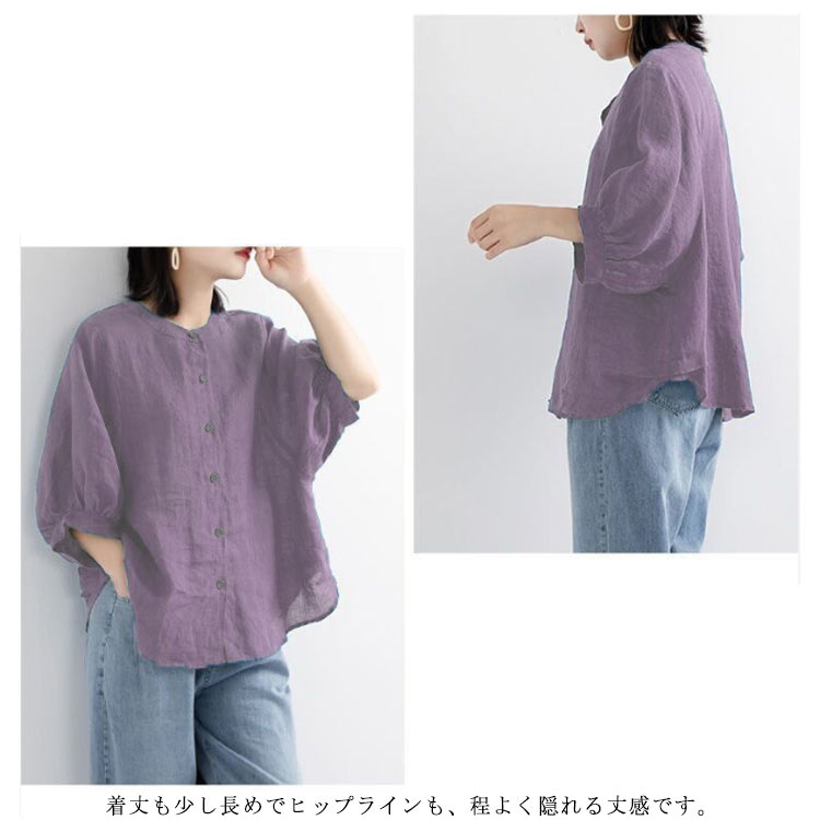 【送料無料】シャツ リネンシャツ 七分袖 ノーカラー ブラウス レディース 綿麻混 夏服 クルーネック ゆったり ボリュームスリーブ バフ袖 春 夏 秋 涼しい カジュアル 20代 30代 40代 50代 大きいサイズ