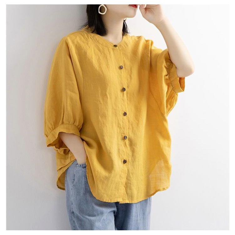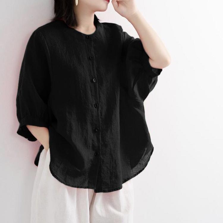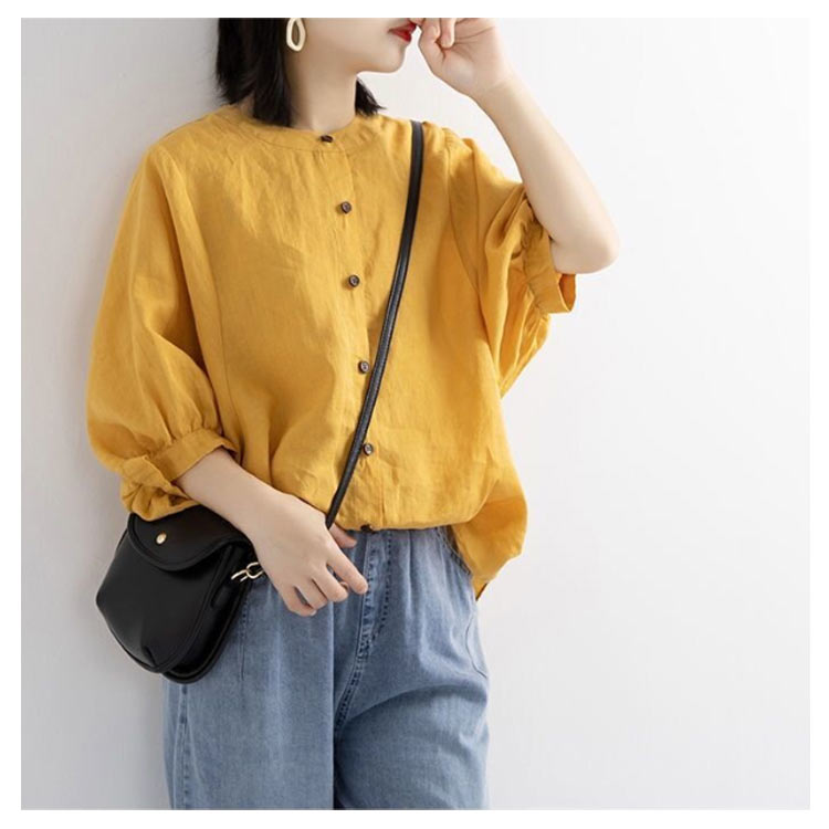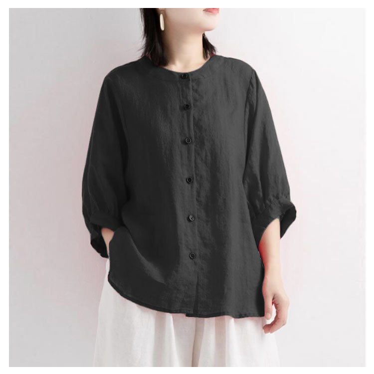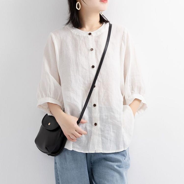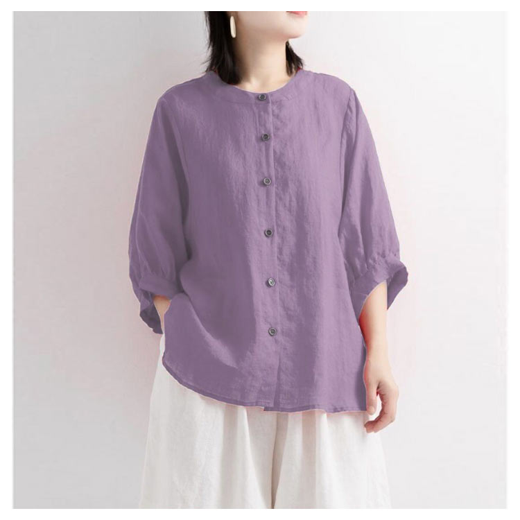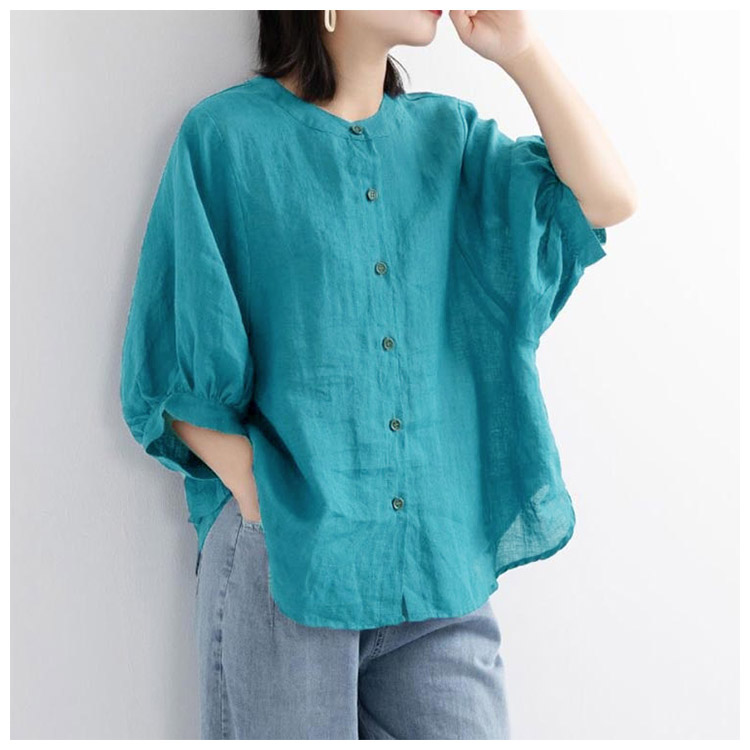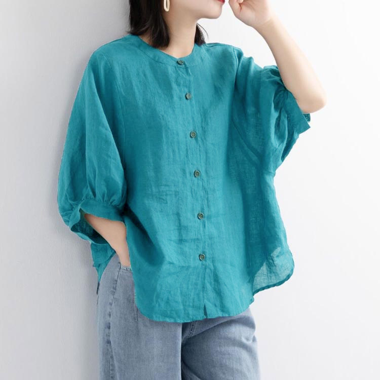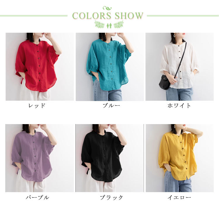 【送料無料】シャツ リネンシャツ 七分袖 ノーカラー ブラウス レディース 綿麻混 夏服 クルーネック ゆったり ボリュームスリーブ バフ袖 春 夏 秋 涼しい カジュアル 20代 30代 40代 50代 大きいサイズ