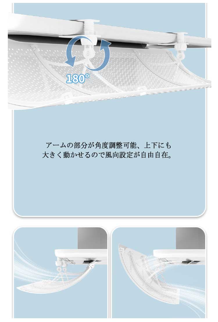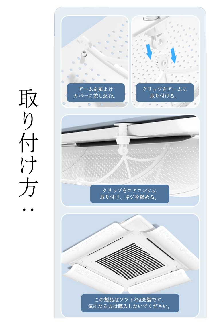 【4個セット】【エアコン用風よけカバー】エアコンの直撃風を解消し、快適な風をお部屋の隅々まで循環させる。簡単にでエアコンに取り付けが可能!クリップ式なので、天井の壁を傷める心配なし。アームの部分が角度調整可能、上下にも大きく動かせるので風向設定が自由自在。風よけが設置されることで、エアコンの効率を上げることができ、電気代の節約につながります。冷房にも暖房にも対応!一年中使えて大変便利なエアコン風よけカバー。取り付け方:アームを風よけカバーに差し込む。クリップをアームに取り付ける。クリップをエアコンにに取り付け、ネジを締める。この製品はソフトなABS製です。気になる方は購入しないでください。
