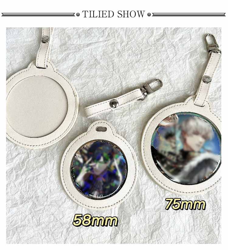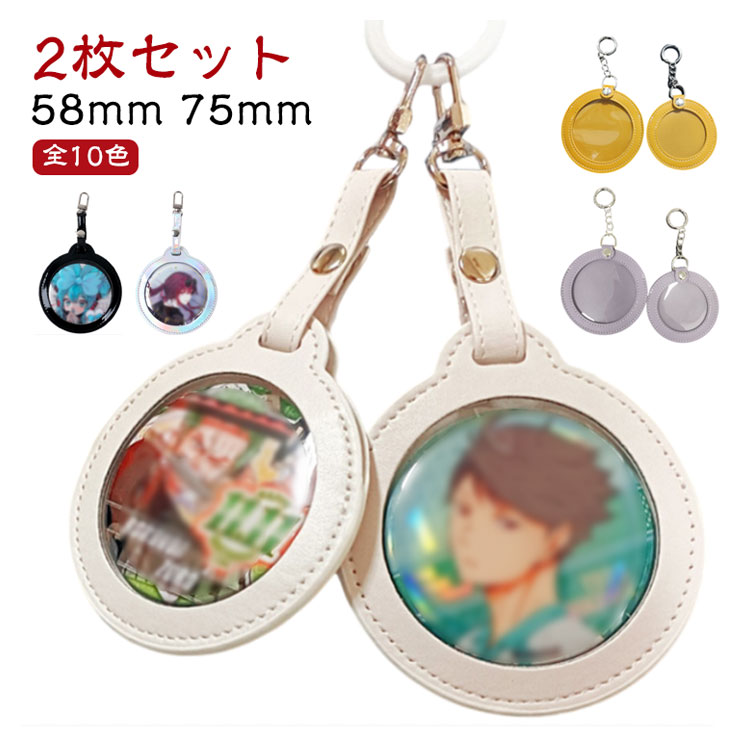 【2枚セット】【58mm 75mm】【全10色】お気に入りの缶バッチを汚さず、さらにカバンに穴をあけず可愛く持ち運べます。レザー調、キーホルダー式チェーン付き、カバンなどの飾りとして最適の缶バッジカバー。缶バッジ、推しキャラのグッズなどが収納できます。デイリー使いはもちろん、イベント・ライブ・通学・旅行・遠足・習い事・お出かけにも活躍。友達にプレゼント、ギフト、誕生日のプレゼントにとして最適です。