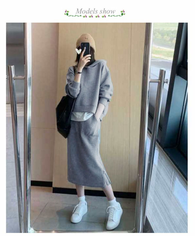 フードパーカーとロングスカートがセットになったスウェットセットアップ。タイトなシルエットでラフになり過ぎなく、痩せ見え効果ときちんと感を演出します。スカート丈とスリットのバランスも調度良く柔らかで程よい抜け感のあるスタイリングが叶います。お部屋の中でもリラックスできる柔らかい素材でストレッチも効いてきて動きやすいです。トップスとボトムスを別々に着ていただけますのでコーディネートの幅が広がります。