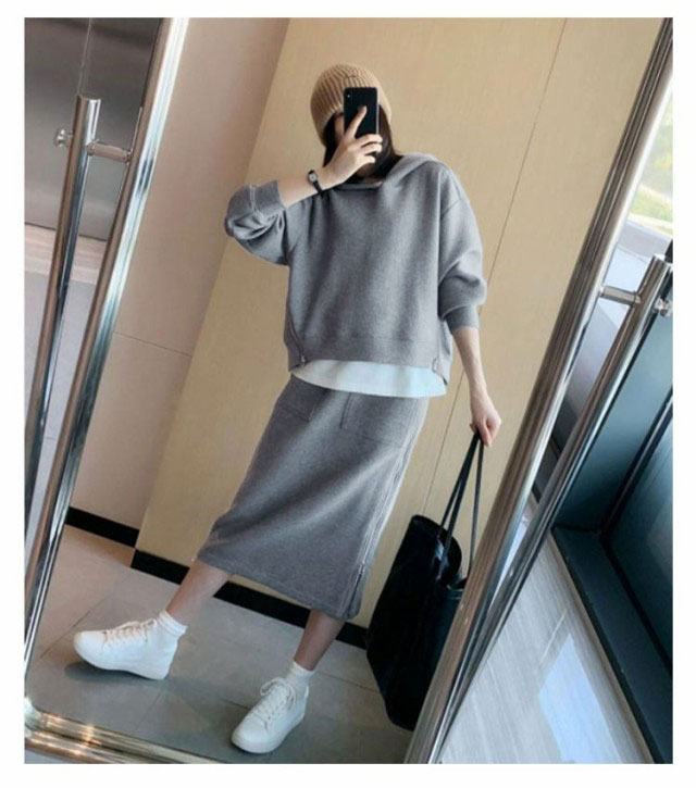 | フードパーカーとロングスカートがセットになったスウェットセットアップ。 タイトなシルエットでラフになり過ぎなく、痩せ見え効果ときちんと感を演出します。 スカート丈とスリットのバランスも調度良く柔らかで程よい抜け感のあるスタイリングが叶います。 お部屋の中でもリラックスできる柔らかい素材でストレッチも効いてきて動きやすいです。 トップスとボトムスを別々に着ていただけますのでコーディネートの幅が広がります。 | |