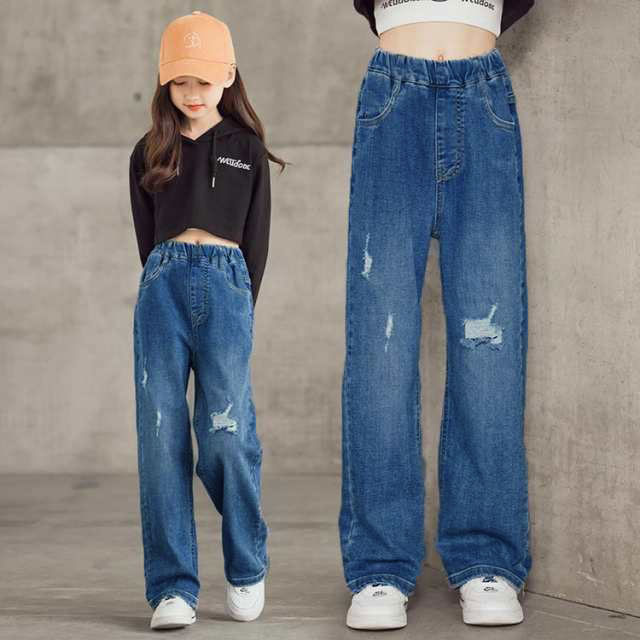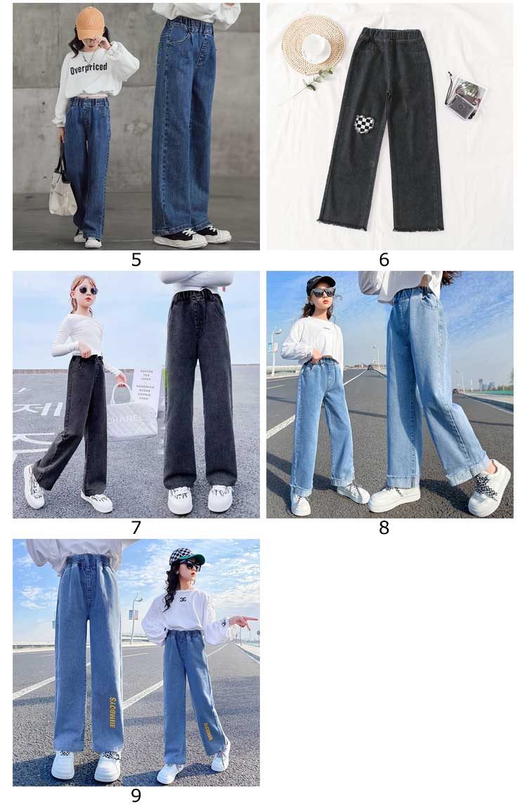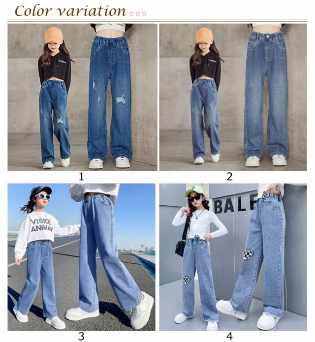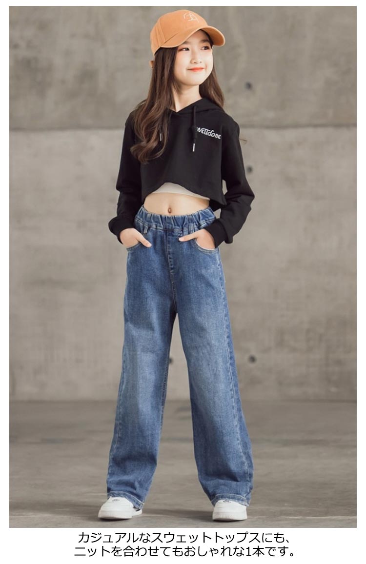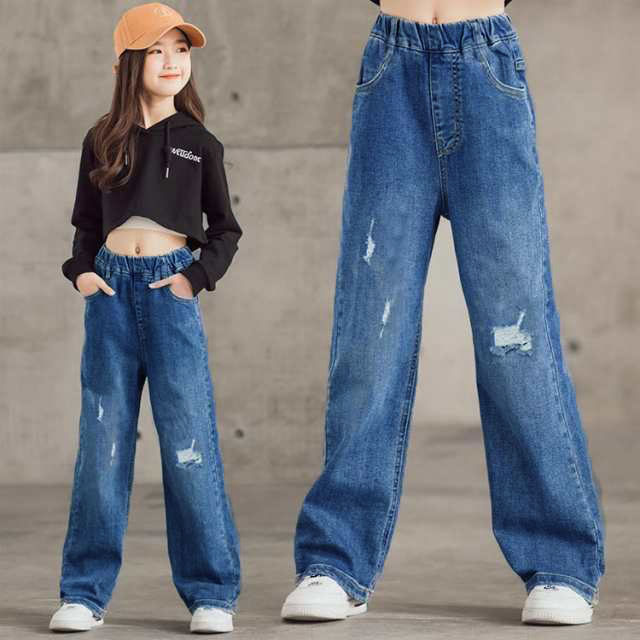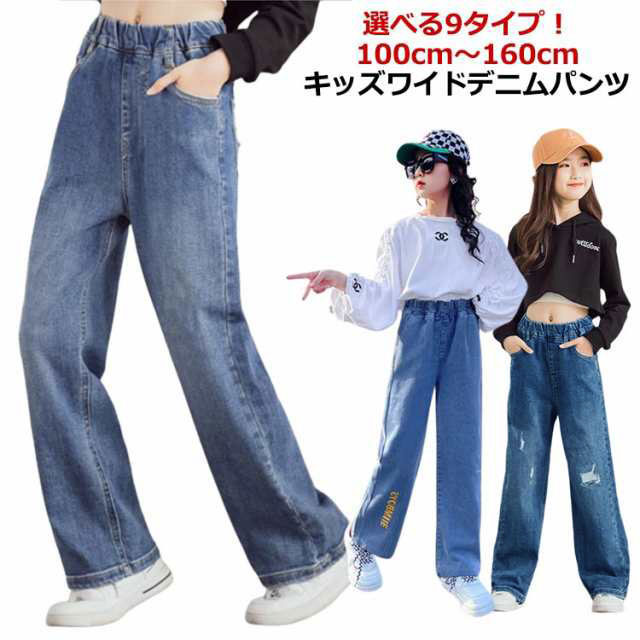 【選べる9タイプ】 デニム ワイドパンツ キッズ 女の子 デニムパンツ ジュニア ボトムス ロングパンツ 子供服 110 120 130 140 150 160cm 長ズボン ダメージ ストレート ジーパン ジーンズ 男の子 子供 子ども服 ユニセックス ブルー ブラック 韓国子供服