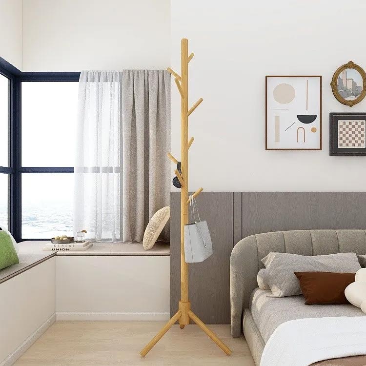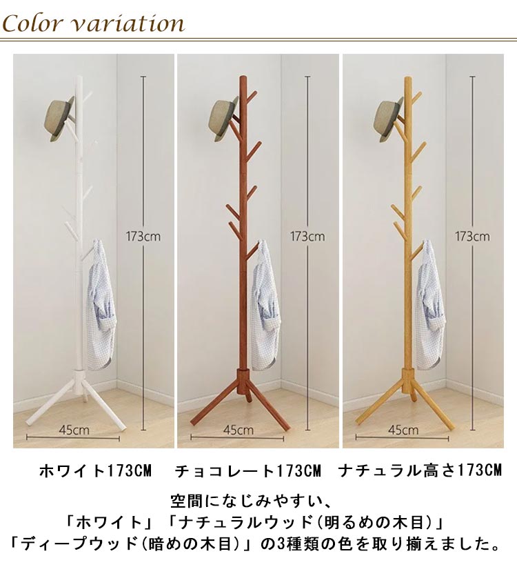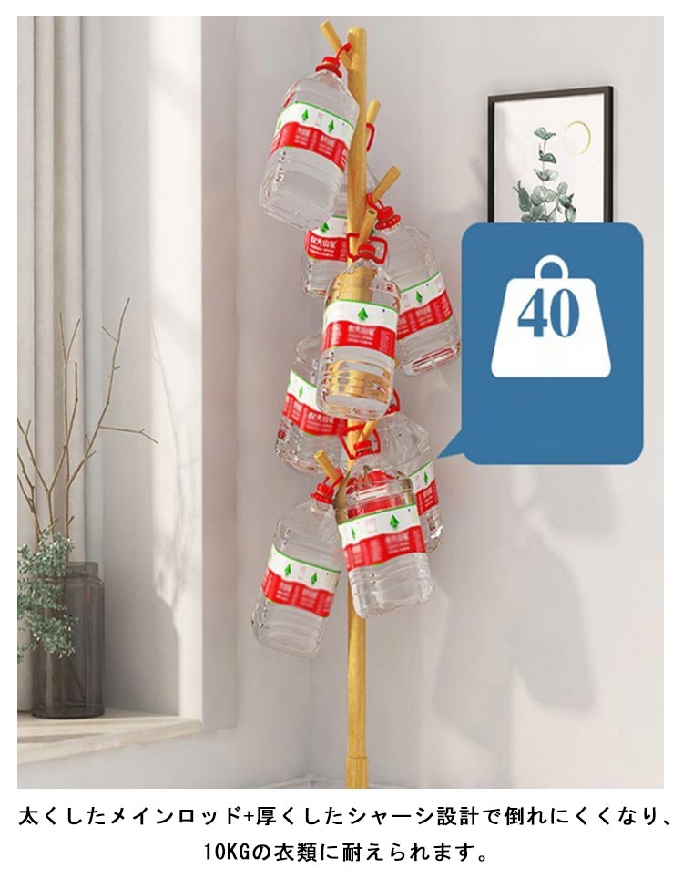 スタンド式インテリアポールハンガー。空間になじみやすい、「ホワイト」「ナチュラルウッド(明るめの木目)」「ディープウッド(暗めの木目)」の3種類の色を取り揃えました。8つの独立フックがついています。フックをかけるほどスペースが広がり、さまざまな衣類やバッグをかけることができます。ペンキを使うことを拒否して、コーティング0ホルムアルデヒド、木目がはっきりしています。太くしたメインロッド+厚くしたシャーシ設計で倒れにくくなり、10kgの衣類に耐えられます。スペースを活用してスペース効率を80%アップ、三本足で着地し、しっかり揺れず倒れにくい。つい散らばりがちな子供のカバン、洋服、帽子もこれ1つですっきり、おしゃれに収納できます。