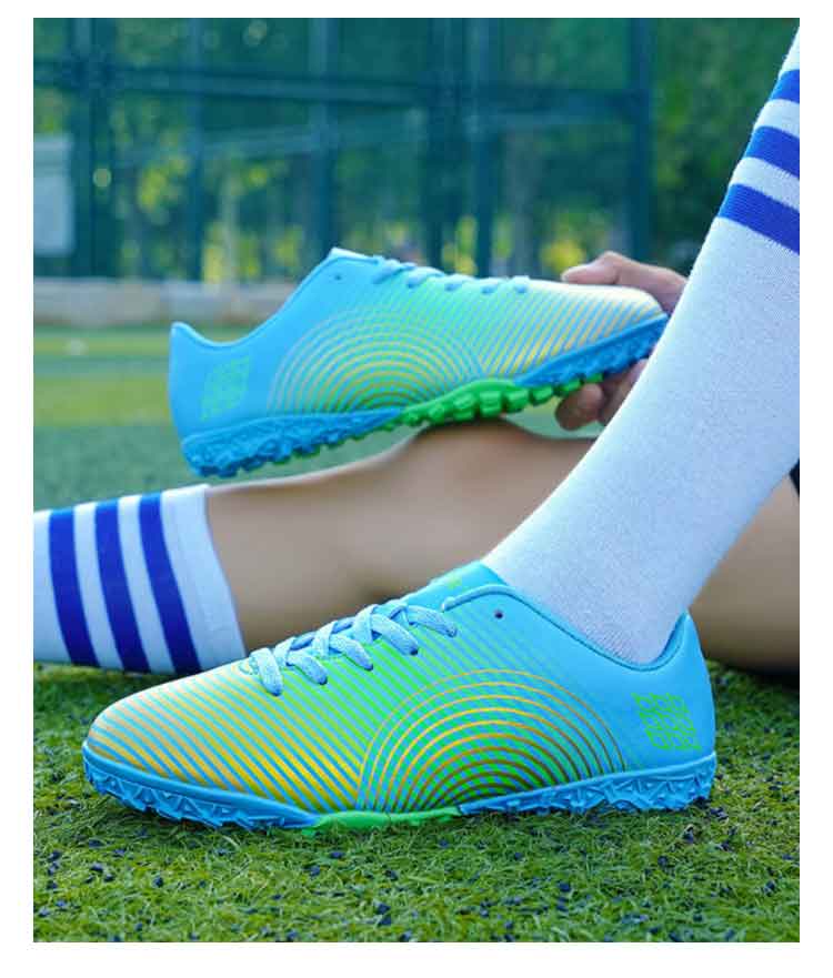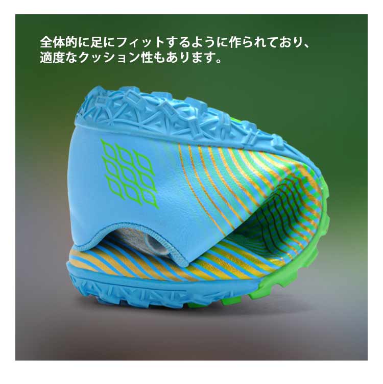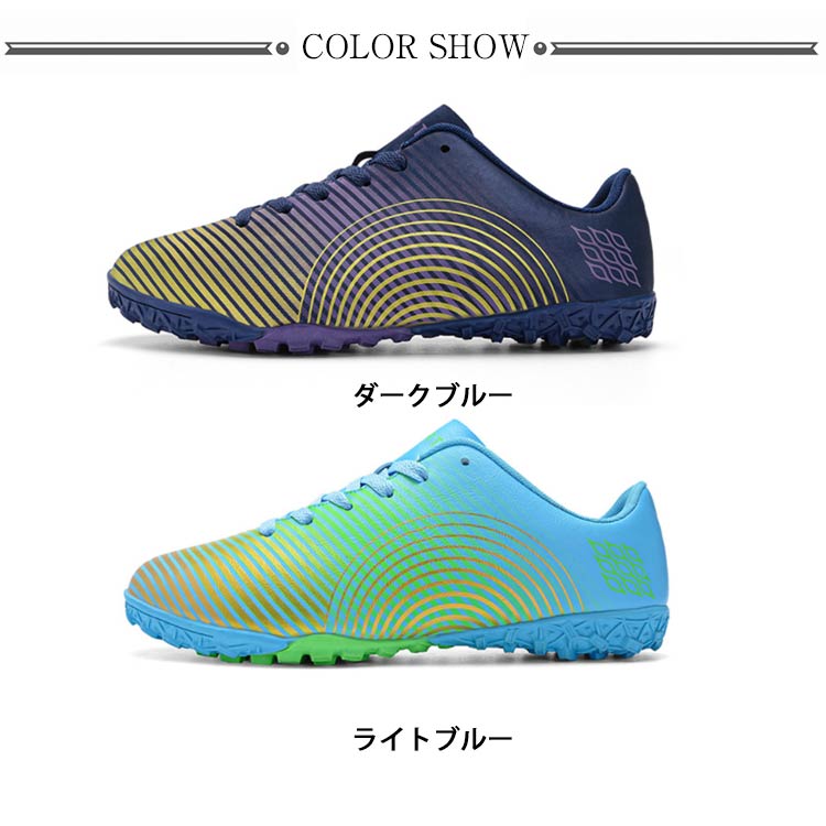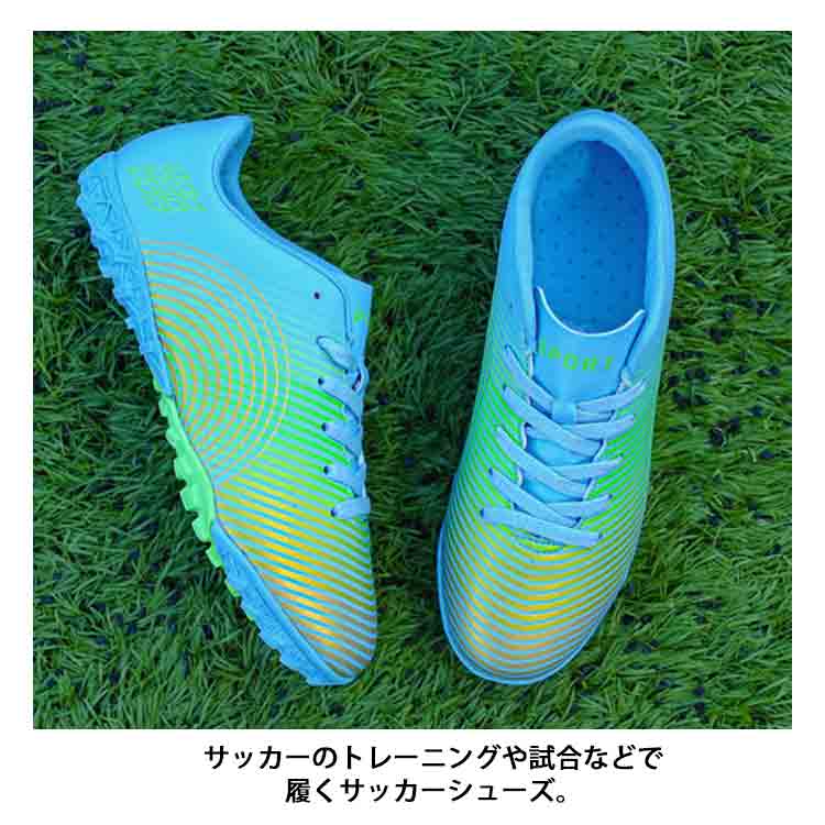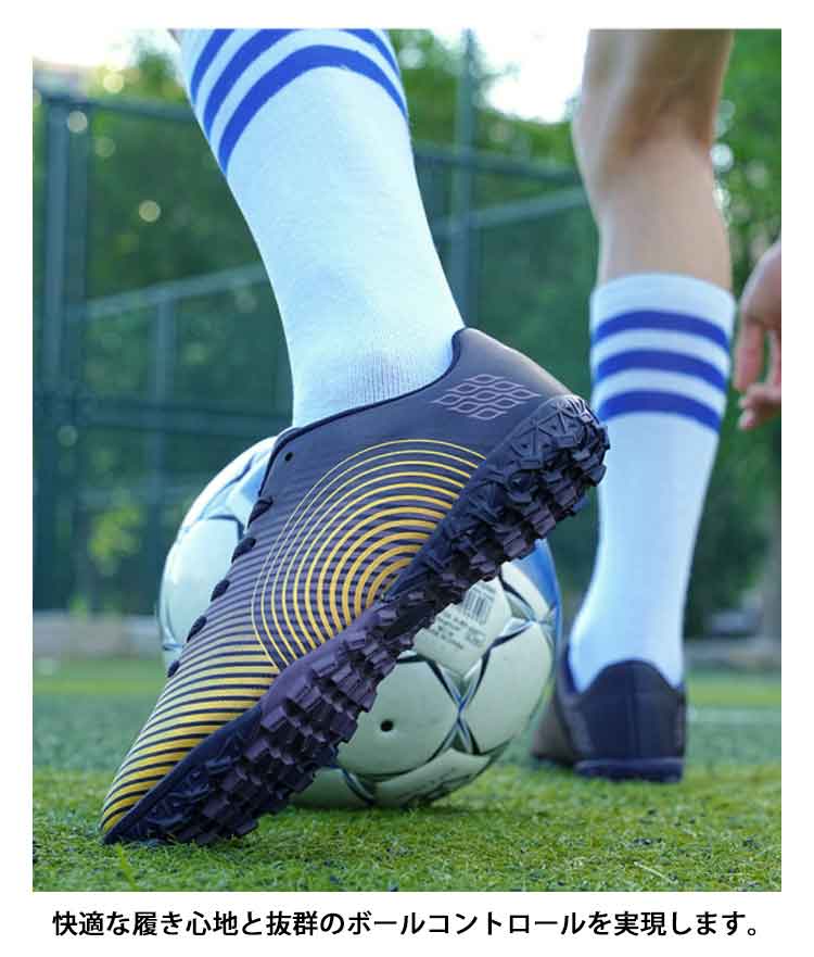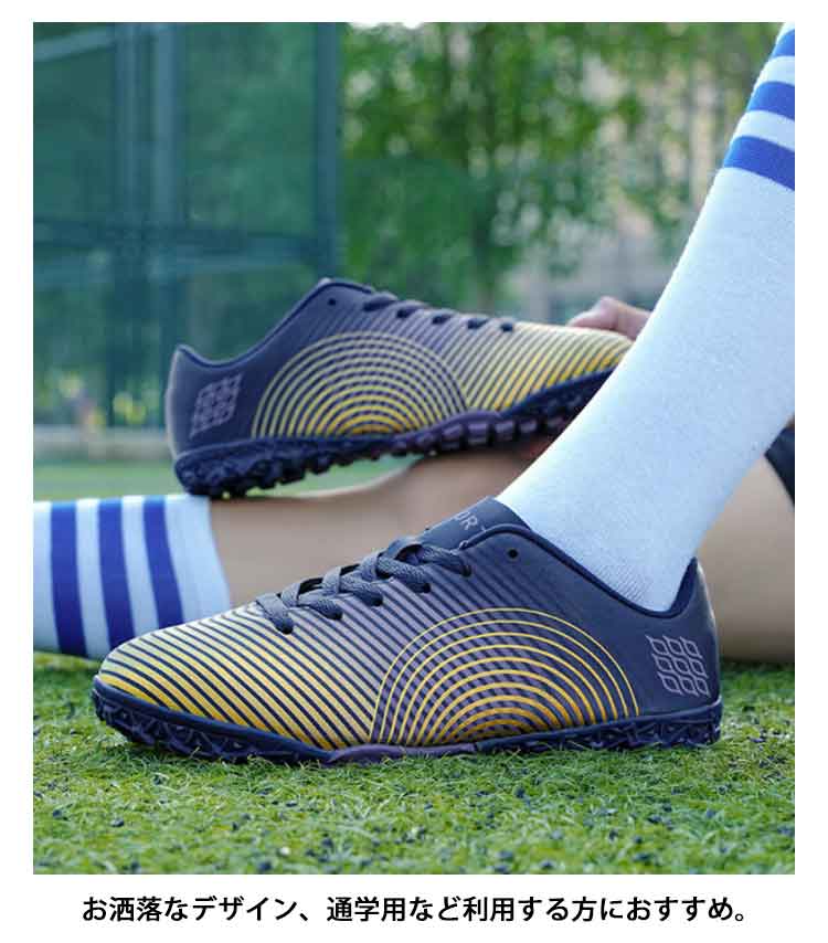 | 履き替えする必要がないサッカーシューズ。 スパイクシューズとの違いは、底にスタッドがついておらず、あらゆるグラウンドに適応できるから、場所によって変更する必要もありません。 全体的に足にフィットするように作られており、適度なクッション性もあります。 柔らかい素材感と耐久性があり、厳しい環境でもサッカー靴の機能性を保証できます。快適な履き心地と抜群のボールコントロールを実現します。 サッカーのトレーニングや試合などで履くサッカーシューズ。 お洒落なデザイン、通学用など利用する方におすすめ。 | |