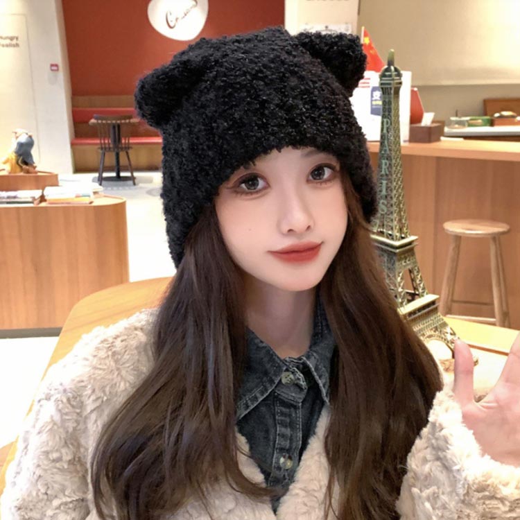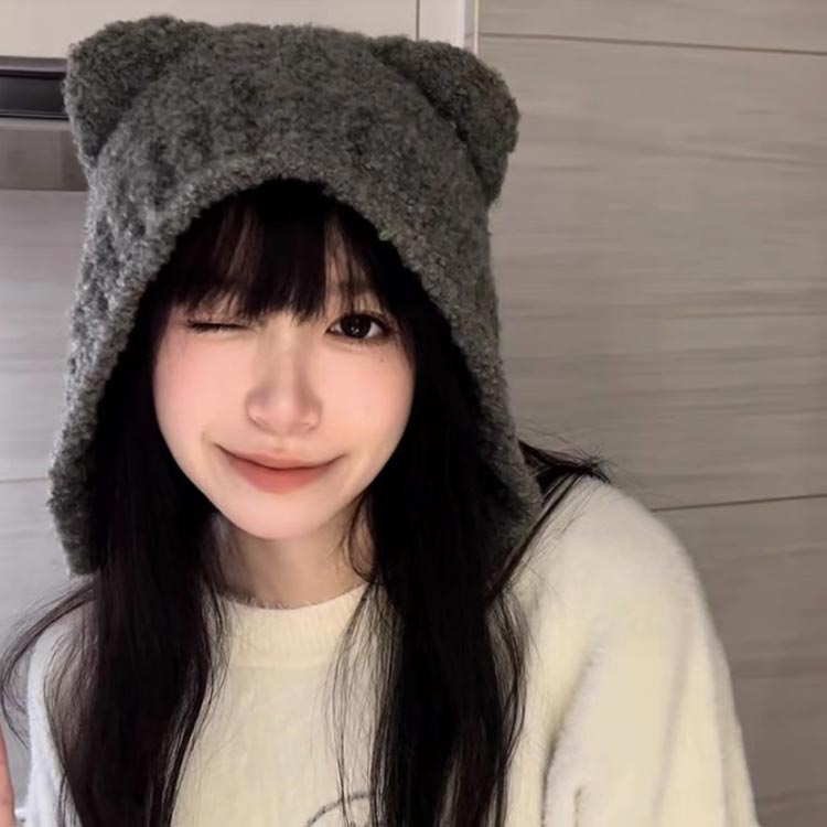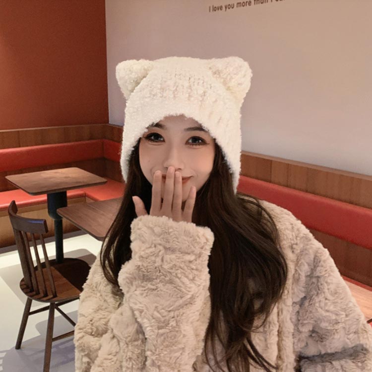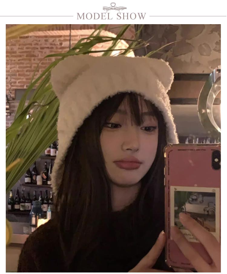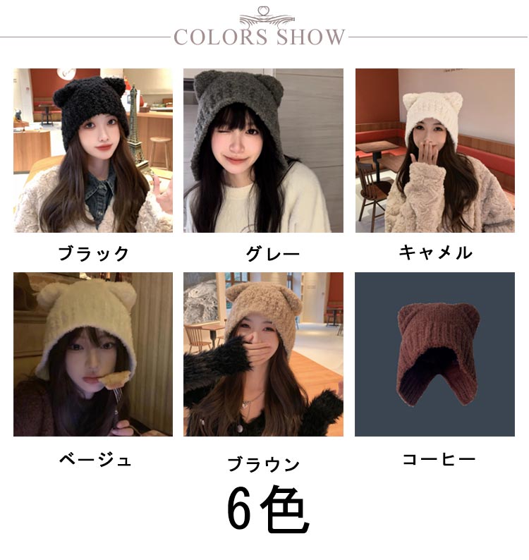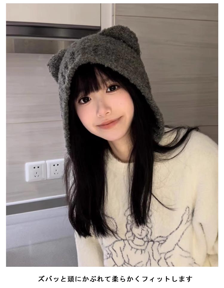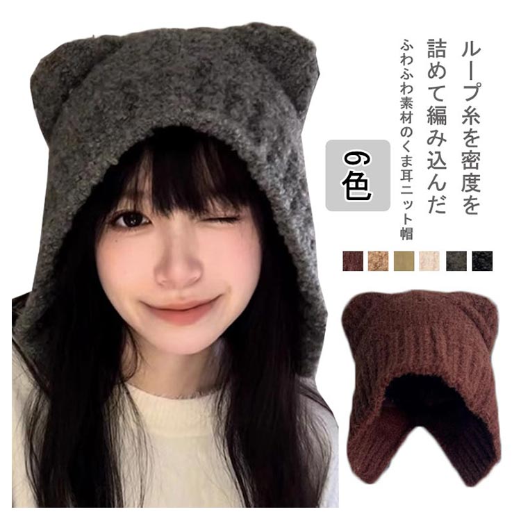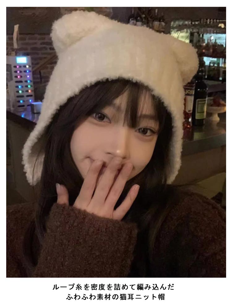 | 6色 ループ糸を密度を詰めて編み込んだ ふわふわ素材の猫耳ニット帽 しっとり滑るような風合い、伸縮性のあるニット素材で、 ズバッと頭にかぶれて柔らかくフィットします 後ろ側に大きなスリット、かぶると小さめ丸い耳が立ってネコ耳になる | |