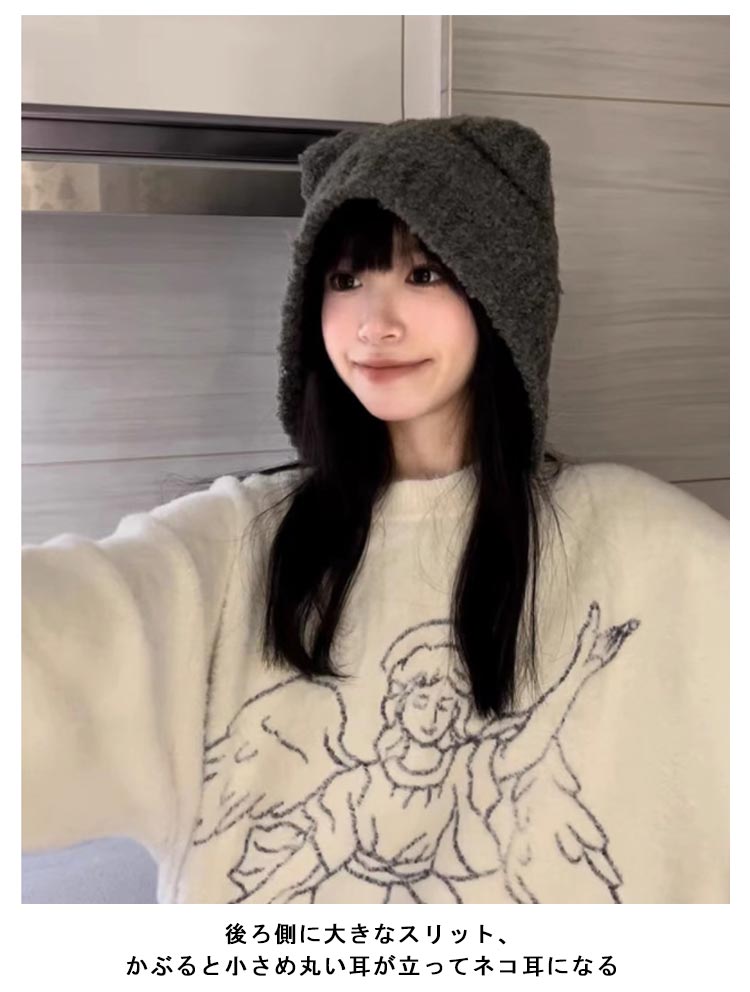 6色ループ糸を密度を詰めて編み込んだ ふわふわ素材の猫耳ニット帽しっとり滑るような風合い、伸縮性のあるニット素材で、ズバッと頭にかぶれて柔らかくフィットします後ろ側に大きなスリット、かぶると小さめ丸い耳が立ってネコ耳になる