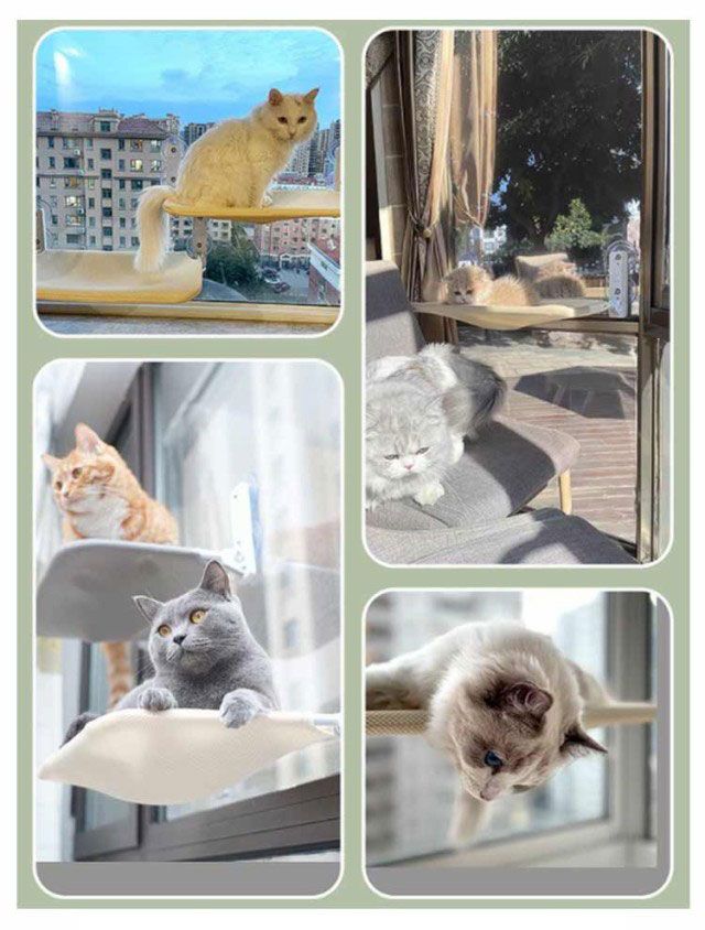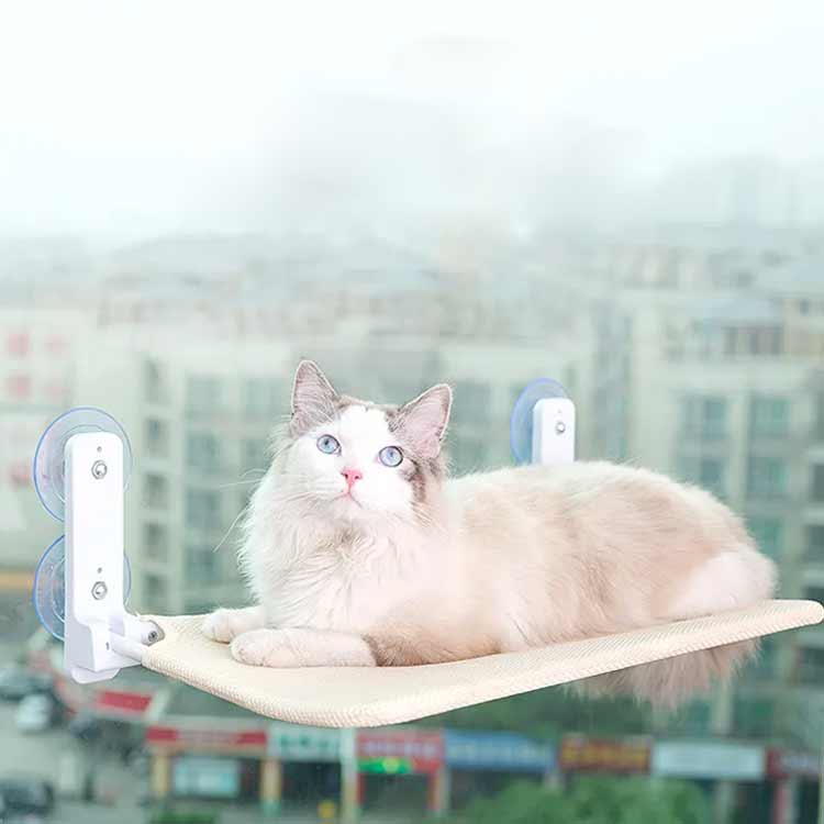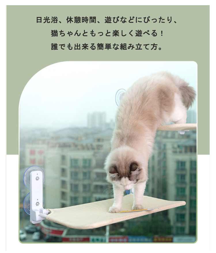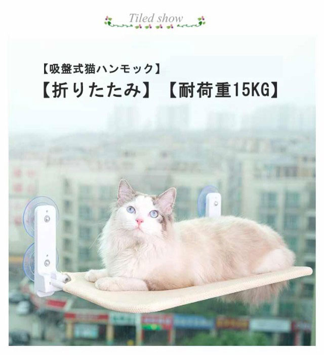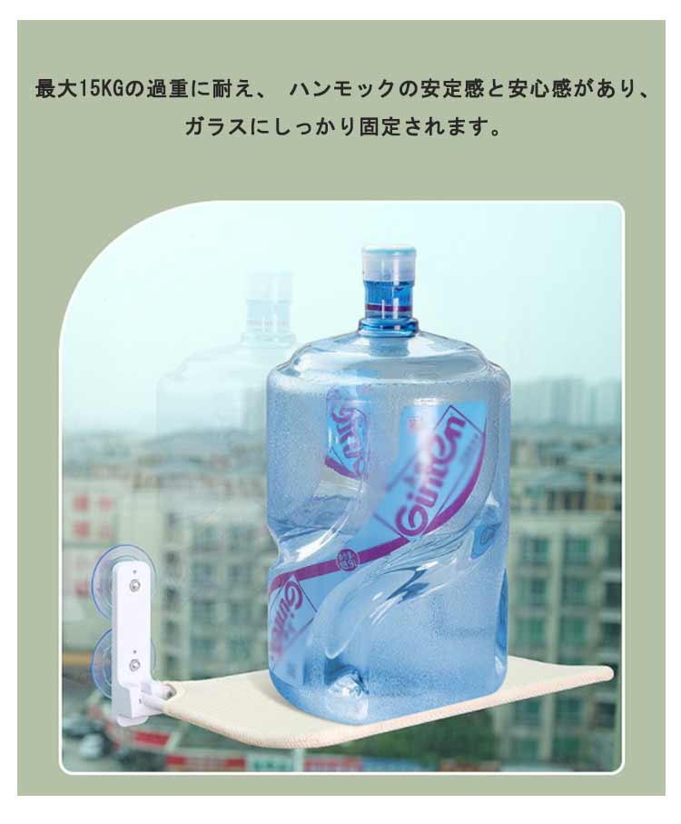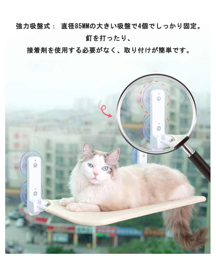 【吸盤式猫ハンモック】【交換用シーツ付き】【折りたたみ】【耐荷重15kg】日光浴、休憩時間、遊びなどにぴったり、猫ちゃんともっと楽しく遊べる!誰でも出来る簡単な組み立て方。折りたたみ可能:使わないときは折りたたんで収納できます。 カーテンの邪魔にもなりません。強力吸盤式: 直径85mmの大きい吸盤で4個でしっかり固定。釘を打ったり、接着剤を使用する必要がなく、取り付けが簡単です。最大15kgの過重に耐え、 ハンモックの安定感と安心感があり、ガラスにしっかり固定されます。【交換用シーツ1枚付き】 表裏どちらでも使える、取り外して洗える2種の生地をご用意しました。春夏に最適な通気性の良いメッシュタイプ、秋冬にはふわふわ暖かいフェイクファー風タイプ。取り付け方:棒を布カバーの穴に合わせて差し込みます。ネジを金具に通します。ねじを締めます(左右に同じように操作します)。4穴に対合わせてナットをねじんで、吸盤を締めます。吸盤とガラスの接触面を拭き取ります。吸盤を強く押してハンモックを固定させます。※ご注意取り付けが完了しましたら、まずフレームを強く押して取り付けが正しいかどうかを確認してください。