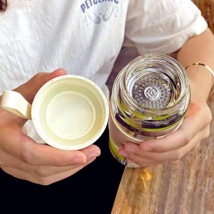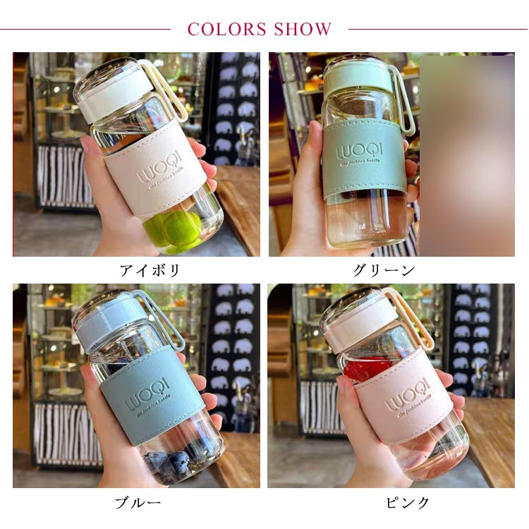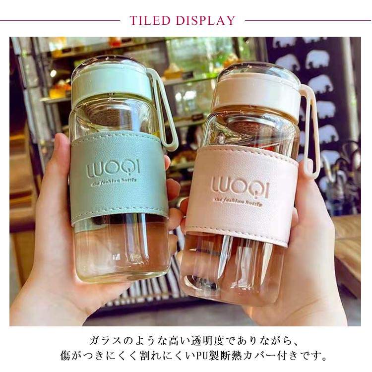 | 容量340mlと480mlから選べる大人用ウォーターボトル。 ガラスのような高い透明度でありながら、傷がつきにくく割れにくいPU製断熱カバー付きです。 飲み心地の良い大きさの飲み口で、ウォーターサーバーなどからも水が入れやすく洗いやすいです。 透明性?耐熱性のあるガラス製で、丈夫で軽く、お好みの水出し茶を作り持ち運びできます。 フィルター付きなので、茶葉を気にすることなくそのまま飲むことができます。 | |