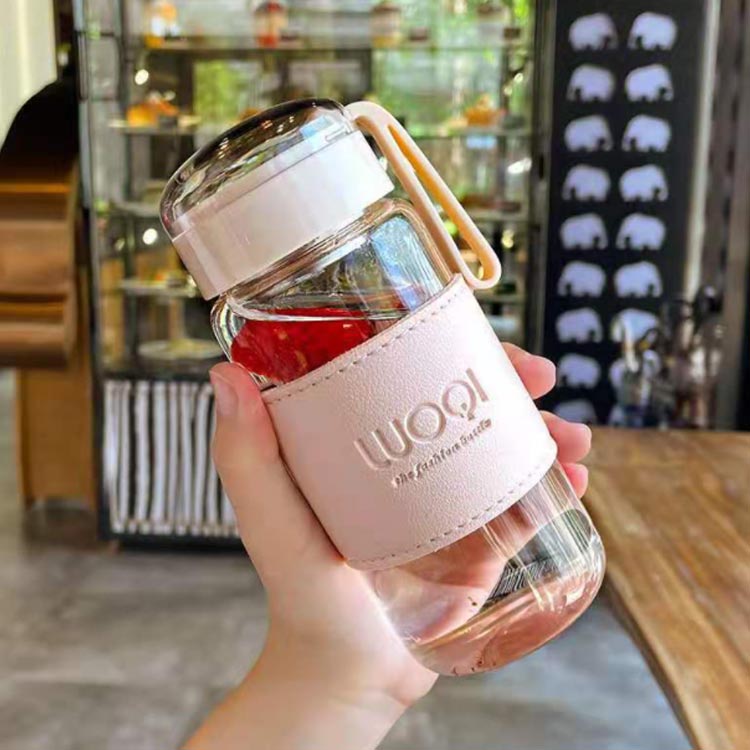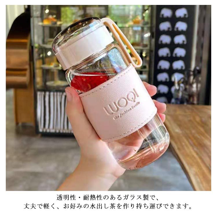 容量340mlと480mlから選べる大人用ウォーターボトル。ガラスのような高い透明度でありながら、傷がつきにくく割れにくいPU製断熱カバー付きです。飲み心地の良い大きさの飲み口で、ウォーターサーバーなどからも水が入れやすく洗いやすいです。透明性・耐熱性のあるガラス製で、丈夫で軽く、お好みの水出し茶を作り持ち運びできます。フィルター付きなので、茶葉を気にすることなくそのまま飲むことができます。