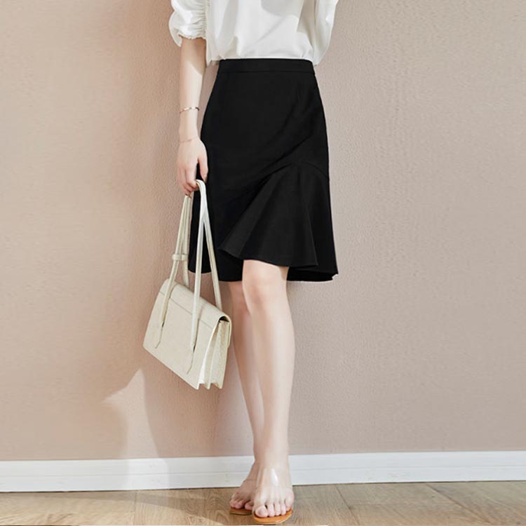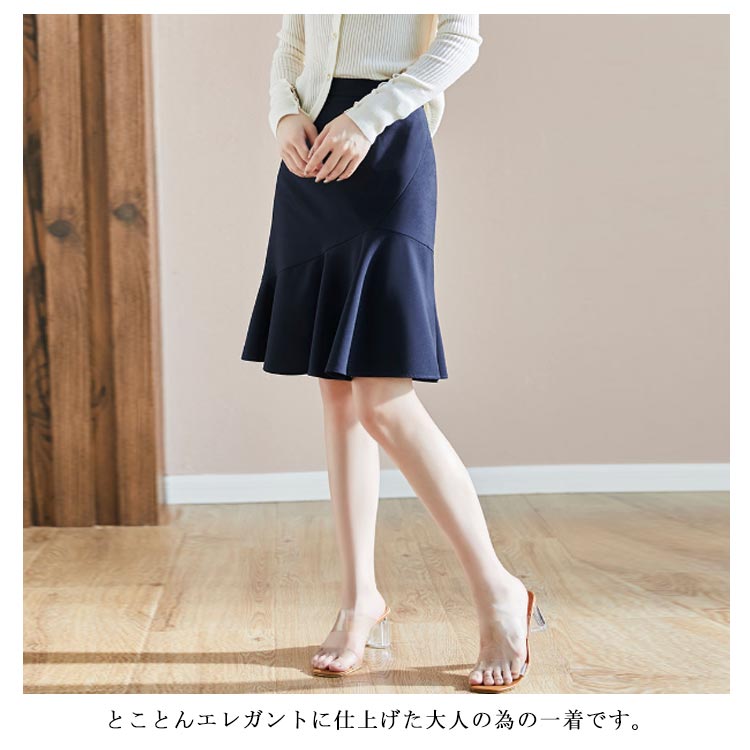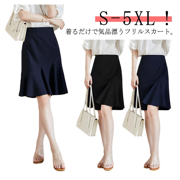 S-5XL!着るだけで気品漂うフリルスカート。伸縮性に優れているので、動きやすく脚ラインに程よくフィット。長すぎず短すぎない膝丈も嬉しい。ディリーにもフォーマルなシーンでも活躍しそう!とことんエレガントに仕上げた大人の為の一着です。
