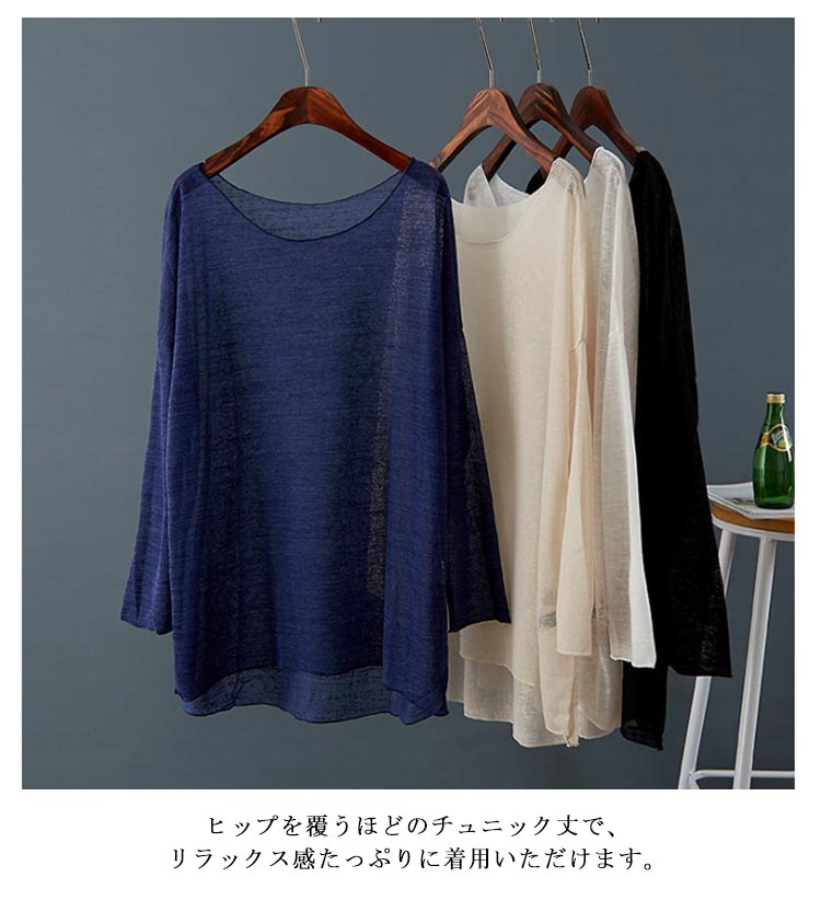 程よいシアー感で品のある!柔らかい着心地のシアーニットヒップを覆うほどのチュニック丈で、リラックス感たっぷりに着用いただけます。ヘルシーな抜け感あるシアー素材は清涼感もありレイヤードスタイルも楽しめます。サラッとしたシャリ感のある編み地が快適。チクチクしないさらりとした表面感で、べたつきにくいのも魅力。キャミソール、ロンTee、ワンピースなど、インナー次第で見え方も変わるのでコーディネートの幅も広がります。