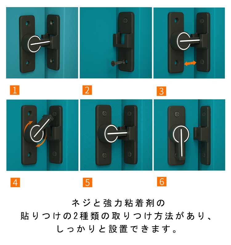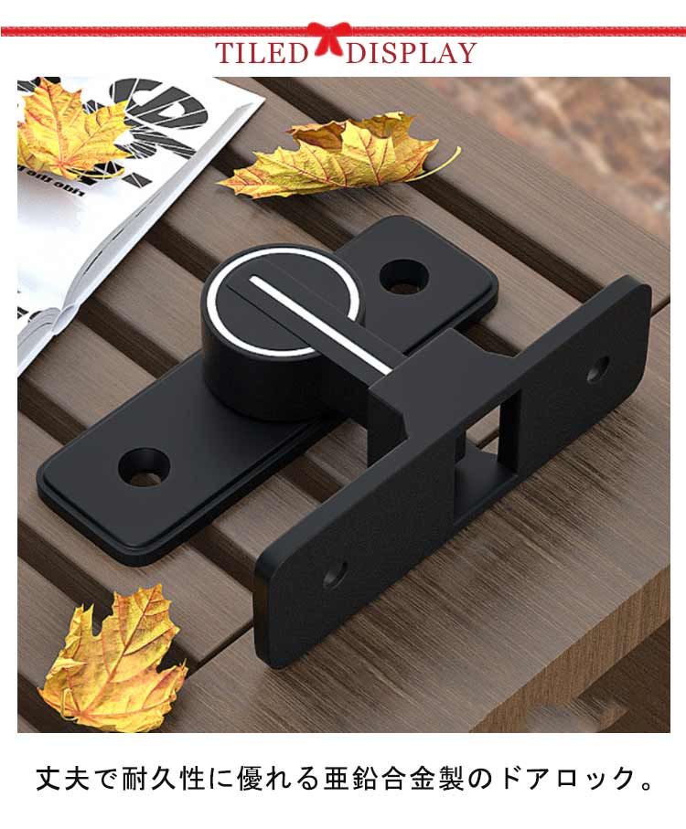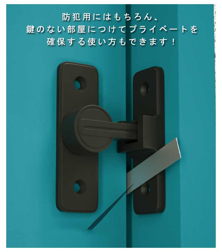 丈夫で耐久性に優れる亜鉛合金製のドアロック。スライド式のロックでクルッと回すだけで簡単に施錠ができます。ネジと強力粘着剤の貼りつけの2種類の取りつけ方法があり、しっかりと設置できます。ドアや窓、引き戸、キッチンの戸棚、引き出しなど、さまざまな場所で活躍します。洗練されたデザインで家具に調和しやすく、部屋の雰囲気を引き立てるドアロックです。防犯用にはもちろん、鍵のない部屋につけてプライベートを確保する使い方もできます!子供のいたずら・ケガや、ペットの脱走防止に役立ちます。