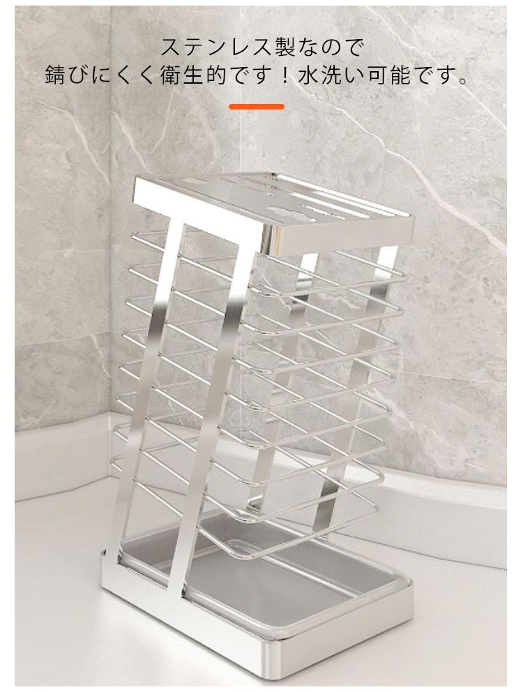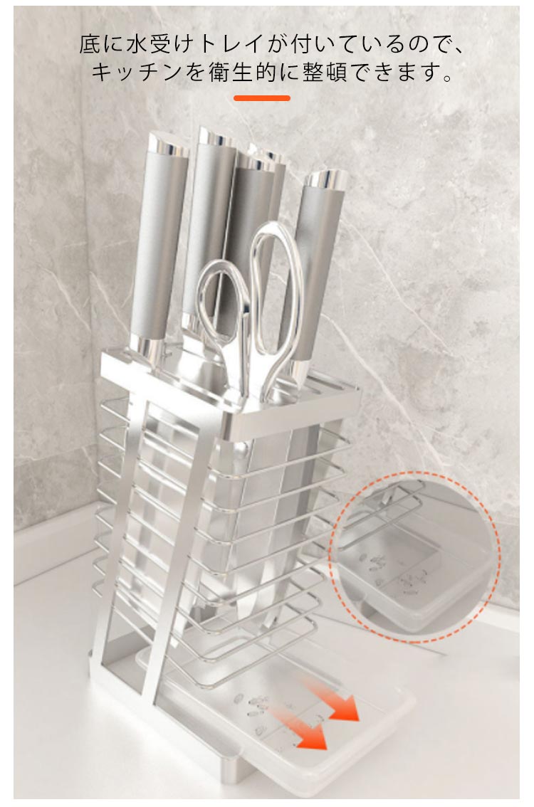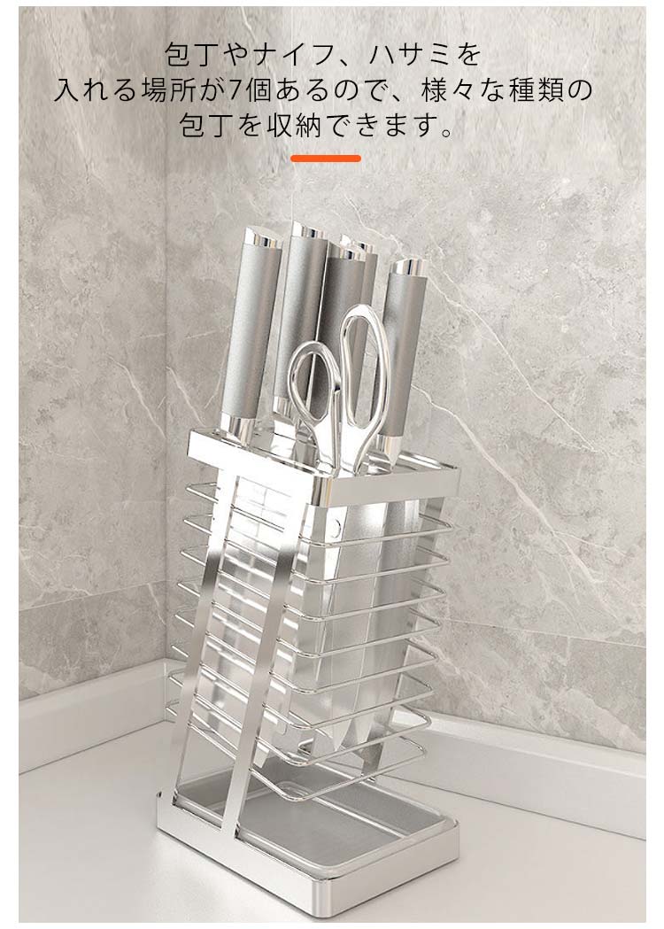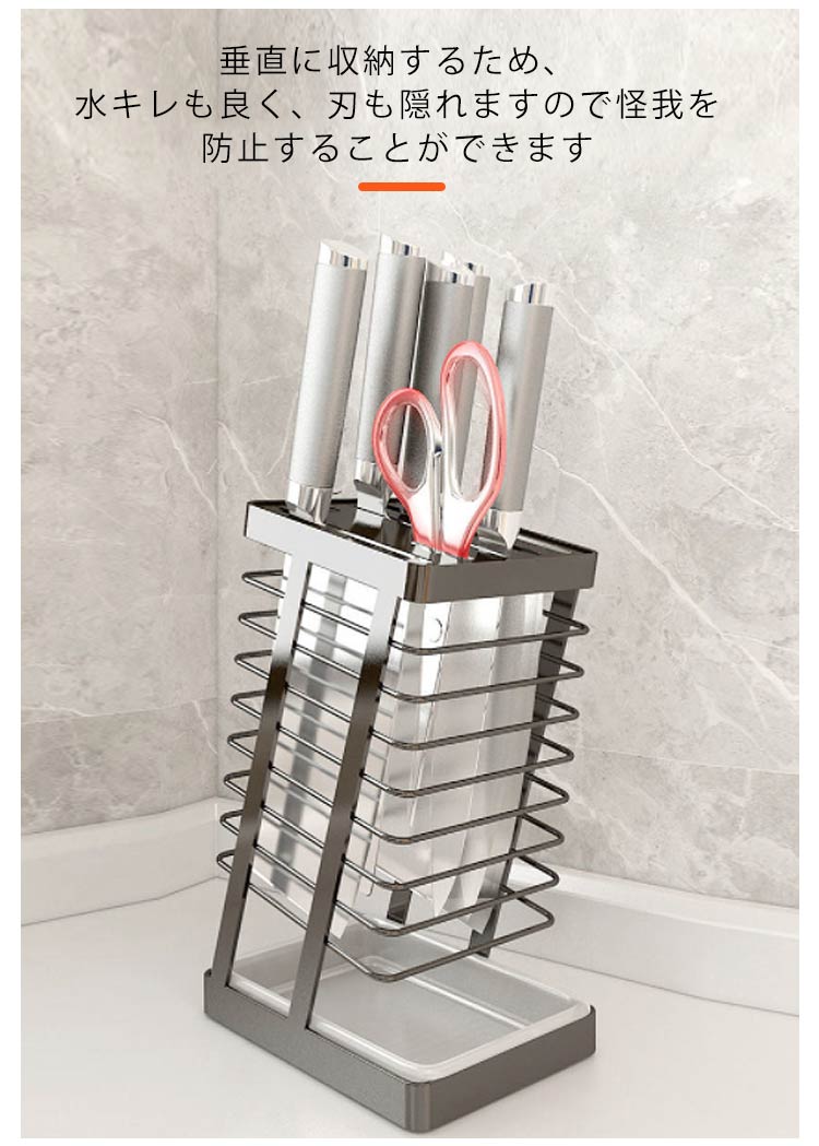 | 毎日使う包丁をすっきり収納できるスタンドです。 風通しの良い構造なので洗ったばかりの包丁の乾燥にも便利です。 垂直に収納するため、水キレも良く、刃も隠れますので怪我を防止することができます 包丁やナイフ、ハサミを入れる場所が7個あるので、様々な種類の包丁を収納できます。 片手でサッと取り出せるデザインで調理の効率もアップします。 ステンレス製なので錆びにくく衛生的です!水洗い可能です。 底に水受けトレイが付いているので、キッチンを衛生的に整頓できます。 | |