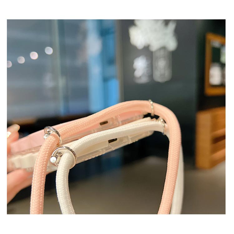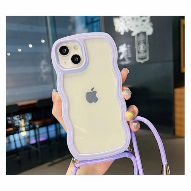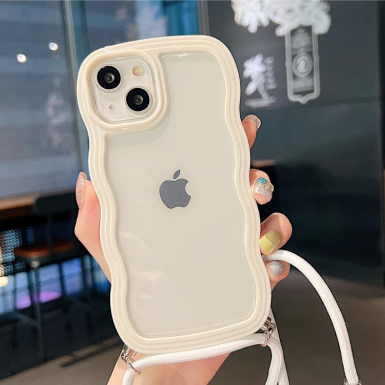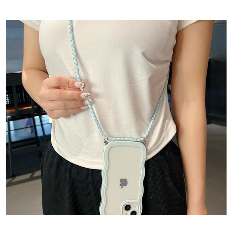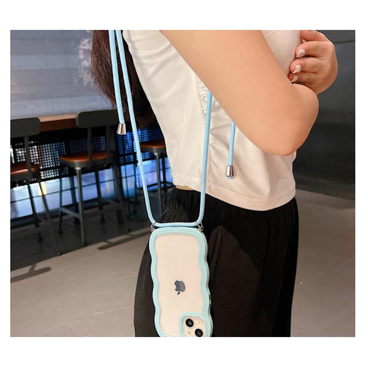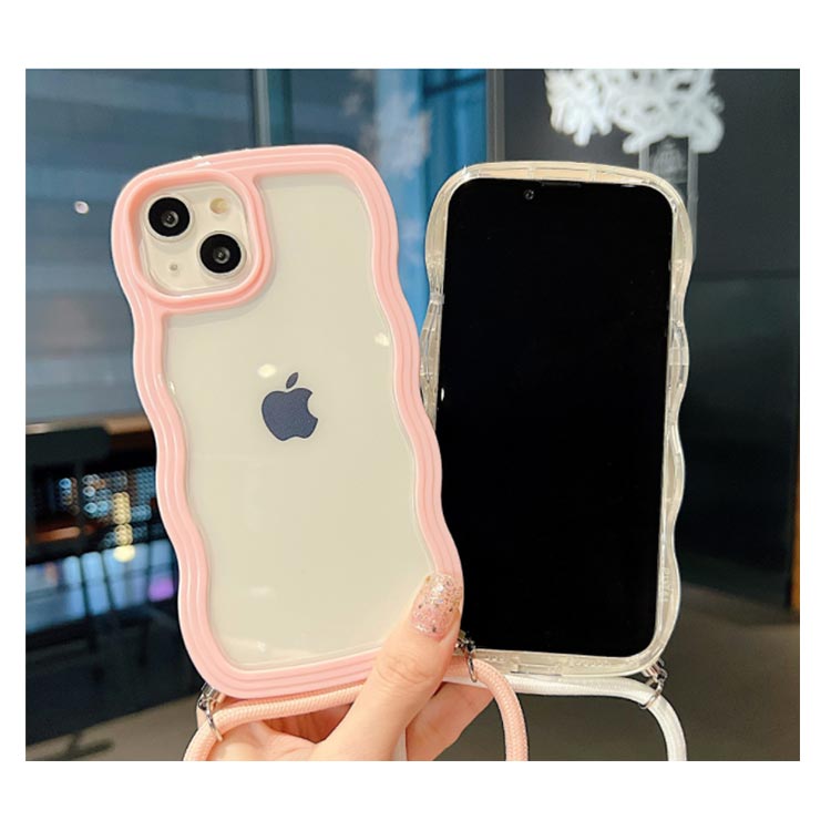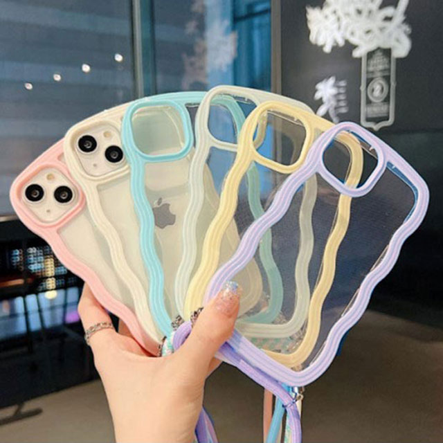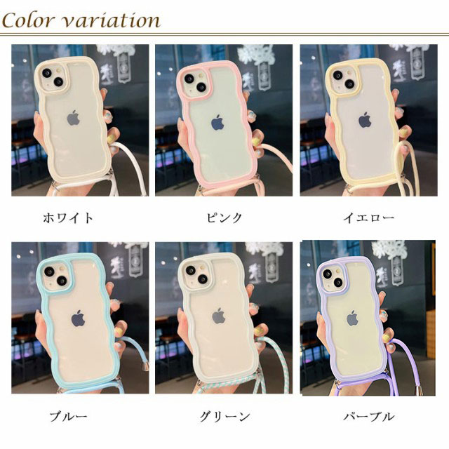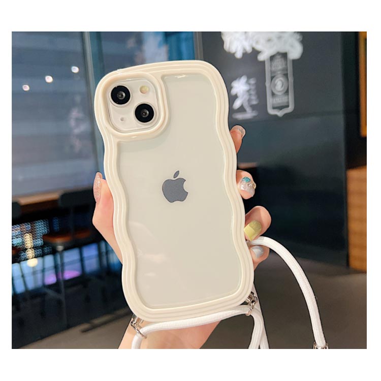 ケースについているネックストラップで、スマホを首から下げたり、肩に掛けたりすることができます。いまSNSで話題の可愛いiPhoneケースです。流行りのウェーブのようなうねうねフレームアイフォンケース。背面部分は透明度の高いクリア仕様なので、iPhone本来のカラーを楽しめます。柔軟で衝撃吸収性のあるTPU素材を使用。変色の心配はありません。手触りも抜群です。