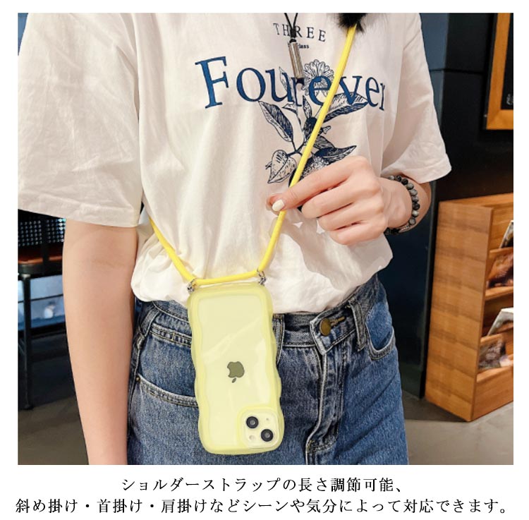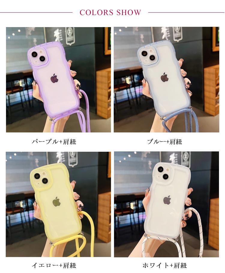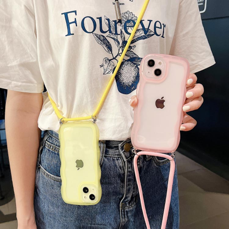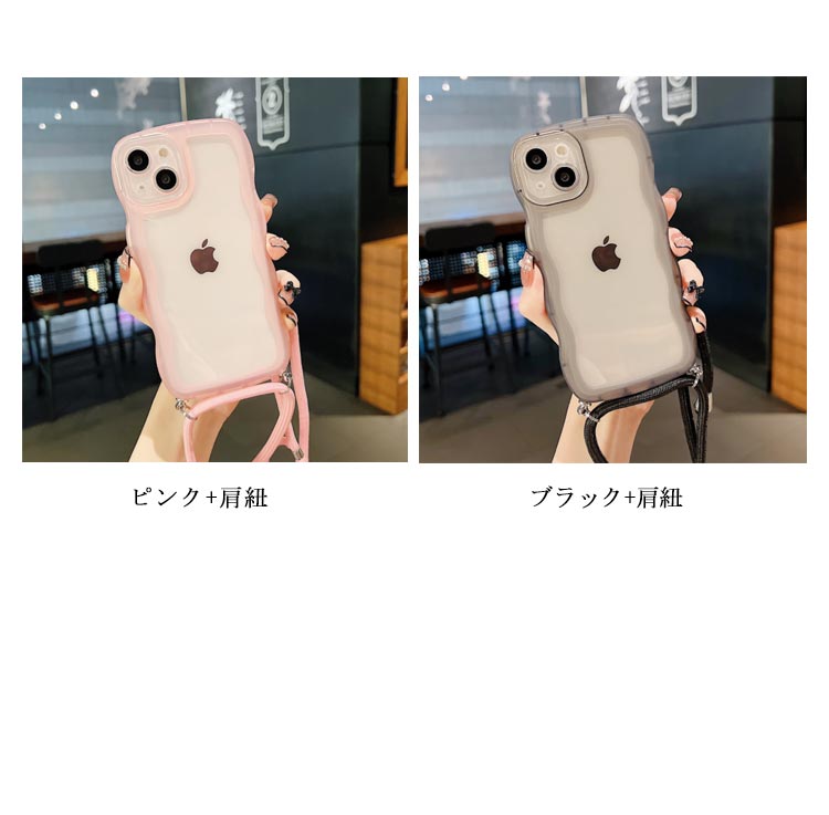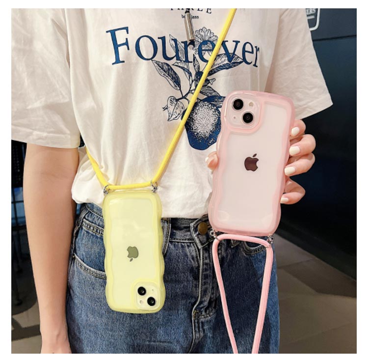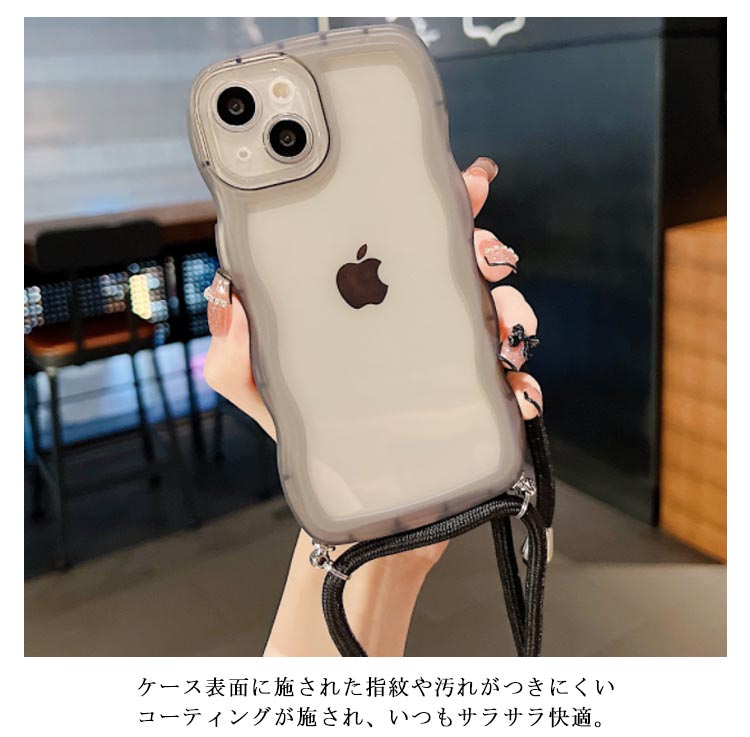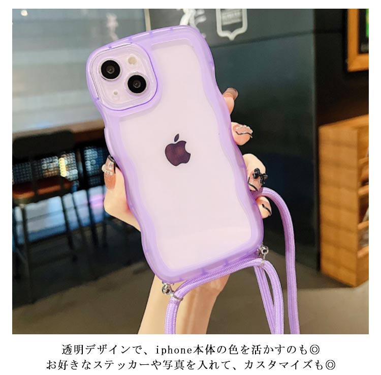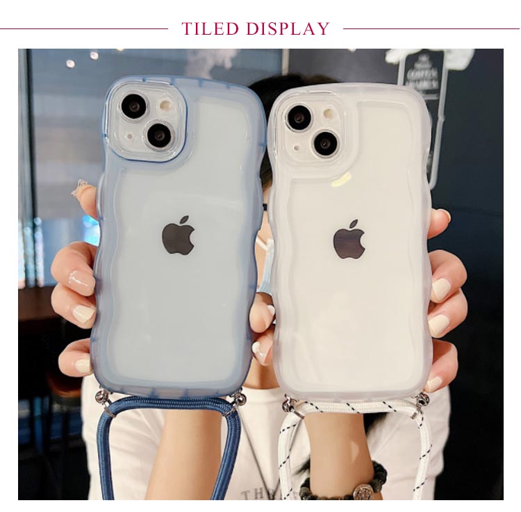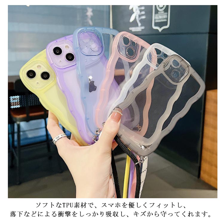 可愛いウェーブフレームのショルダーケース。ソフトなTPU素材で、スマホを優しくフィットし、落下などによる衝撃をしっかり吸収し、キズから守ってくれます。透明デザインで、iphone本体の色を活かすのも◎お好きなステッカーや写真を入れて、カスタマイズも◎ケース表面に施された指紋や汚れがつきにくいコーティングが施され、いつもサラサラ快適。各種ボタンや充電コネクタが正確設計、ケースをつけたままあらゆる操作がスムーズにできます。ショルダーストラップの長さ調節可能、斜め掛け・首掛け・肩掛けなどシーンや気分によって対応できます。