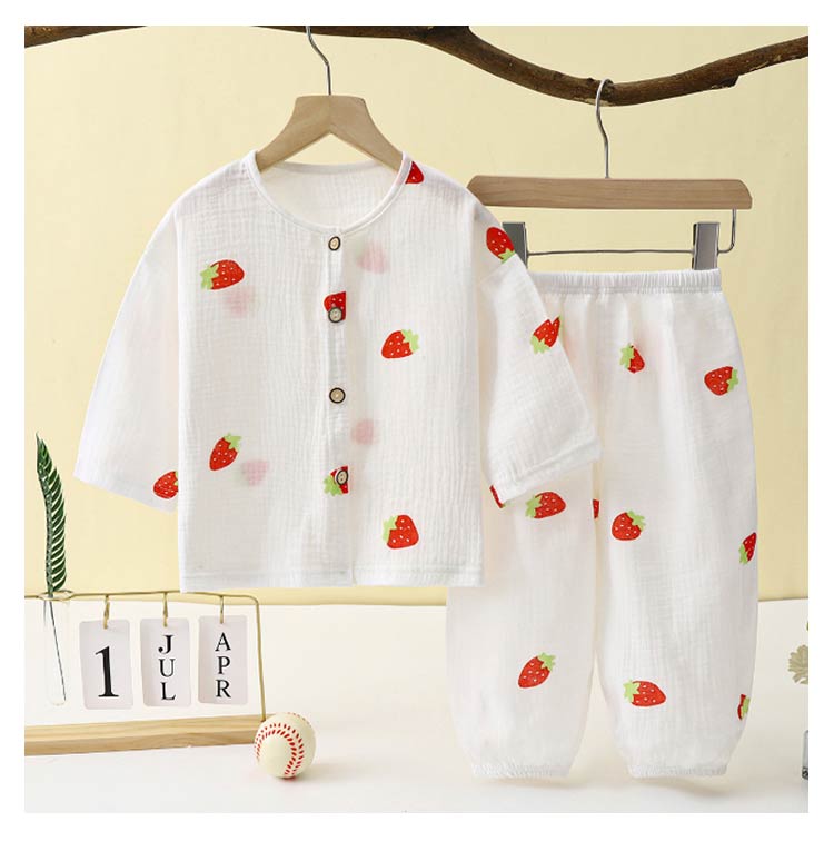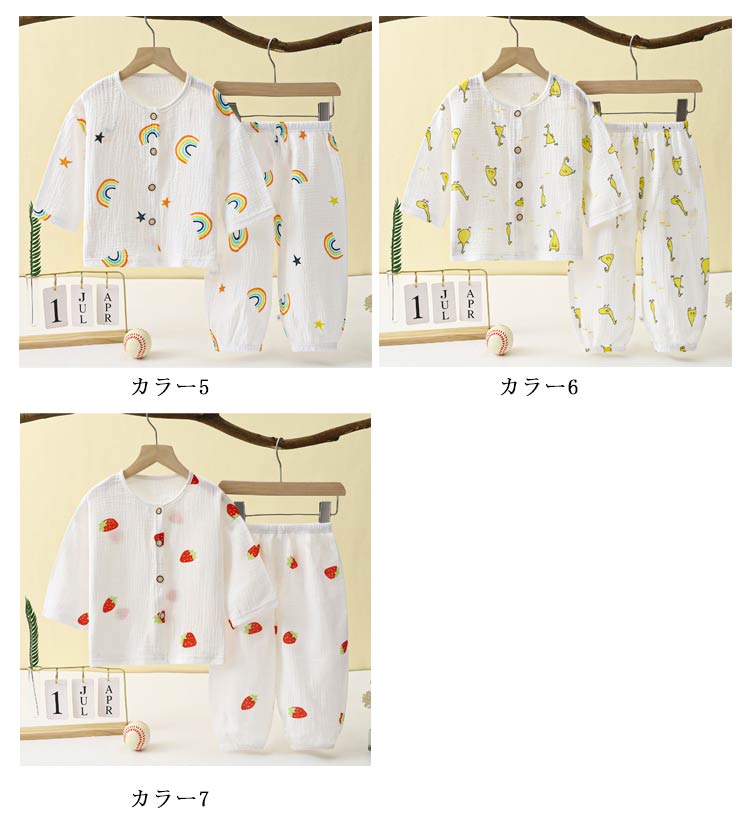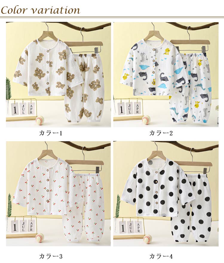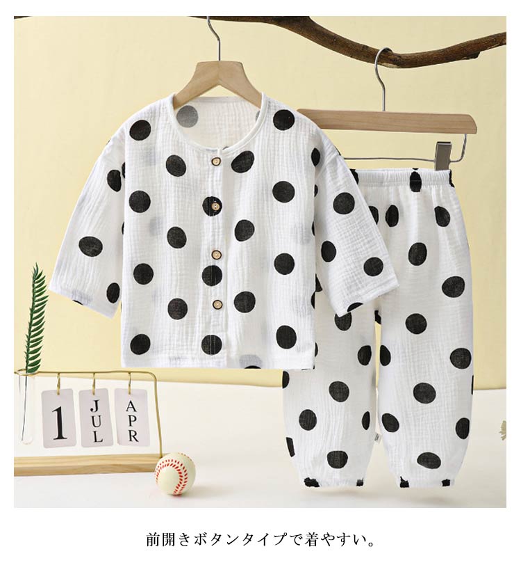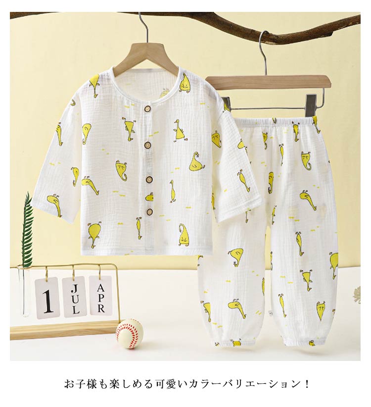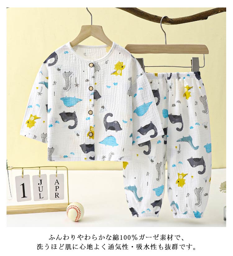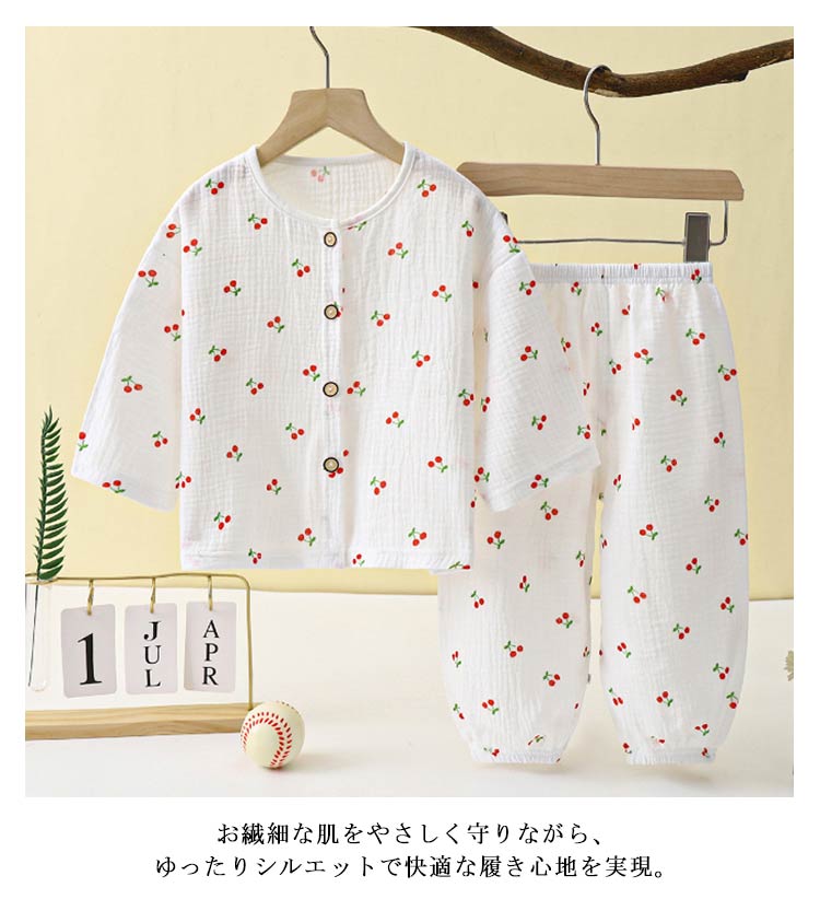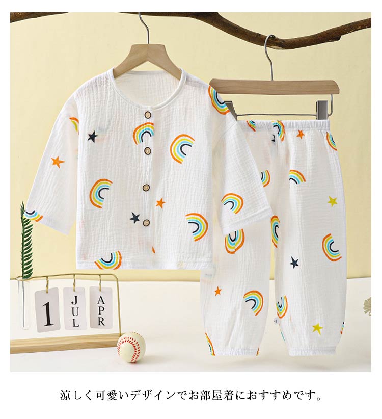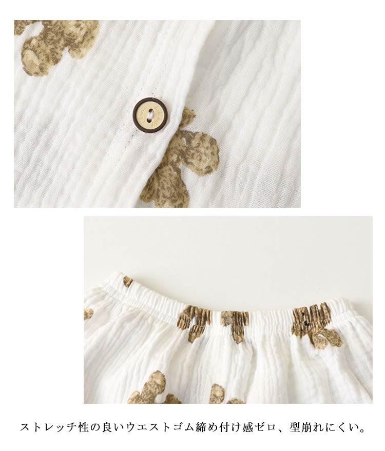 おうち服もおしゃれに♪ガーゼ素材の子供ルームウェア。ダブルガーゼでつくられており柔らかくふんわりとした風合いがとても着やすく、心地良い睡眠を提供します。トップスはボタンを外せばお子様一人でも着脱が簡単に。リラックスしてお家時間を過ごせるよう、締付けの少ないシルエットに。パンツは総ゴム仕様でお着替えも楽ちんです。通気性・吸汗性に優れて、汗をたくさんかく夏でもサラサラ。お友達や姉妹でおそろいも!おうち時間も可愛く過ごせるアイテムです。