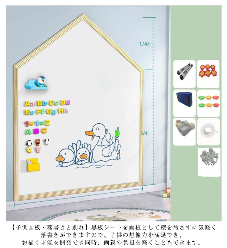 | 【子供画板?落書きと別れ】黒板シートを画板として壁を汚さずに気軽く落書きができますので、子供の想像力を満足でき、お描く才能を開発でき同時、両親の負担を軽くこともできます。 【用途広い】家では子供の落書き?勉強?飾り、会社ではプレゼン?映写用?スケジュール表、商店では掲示板?メニューボードとして使え、幅広い場面で大活躍です。 【貼り付け簡単?消しやすい】シール製で直接に貼ることができ、初心者でもできます。黒板シートの表面には撥水加工が施されているので、濡れタオルやイレーザなどを使ってきれいに拭き消して、繰リ返し使うこともできます。 剥がす場合は、両面テープを壁から隅からゆっくりと剥がし、速すぎずに少しずつ開けていく。 | |