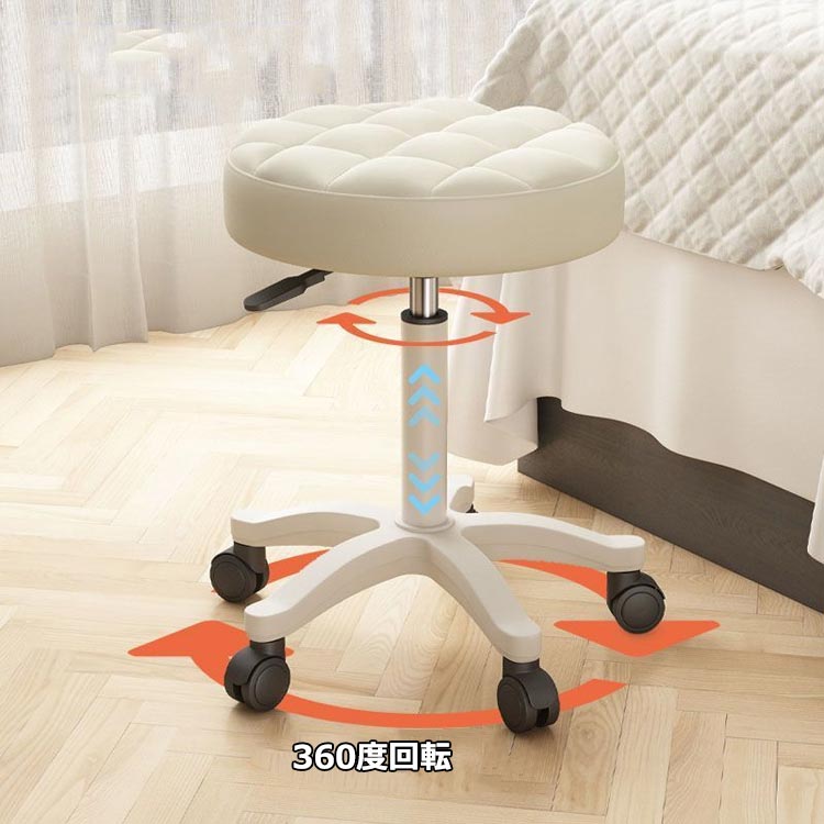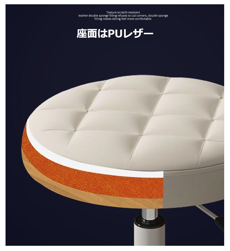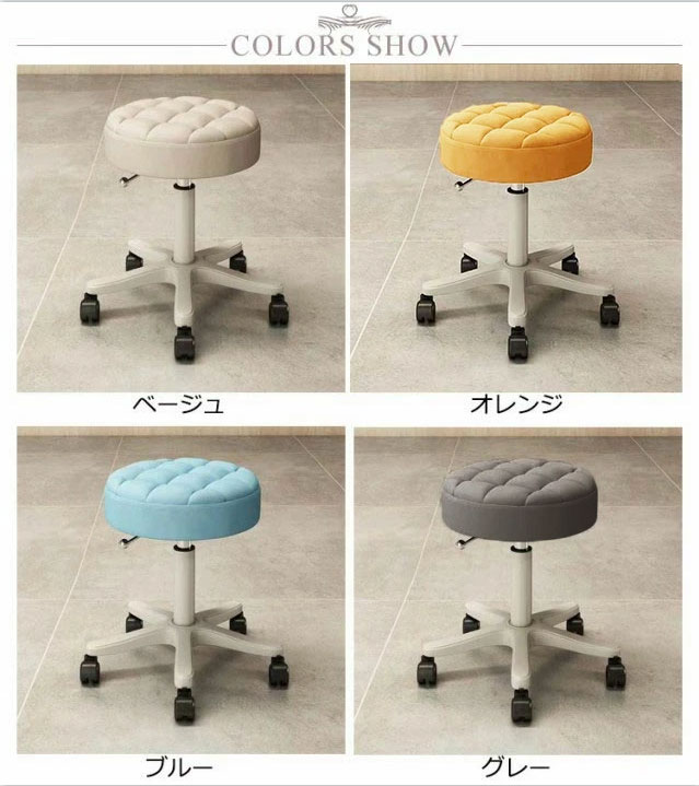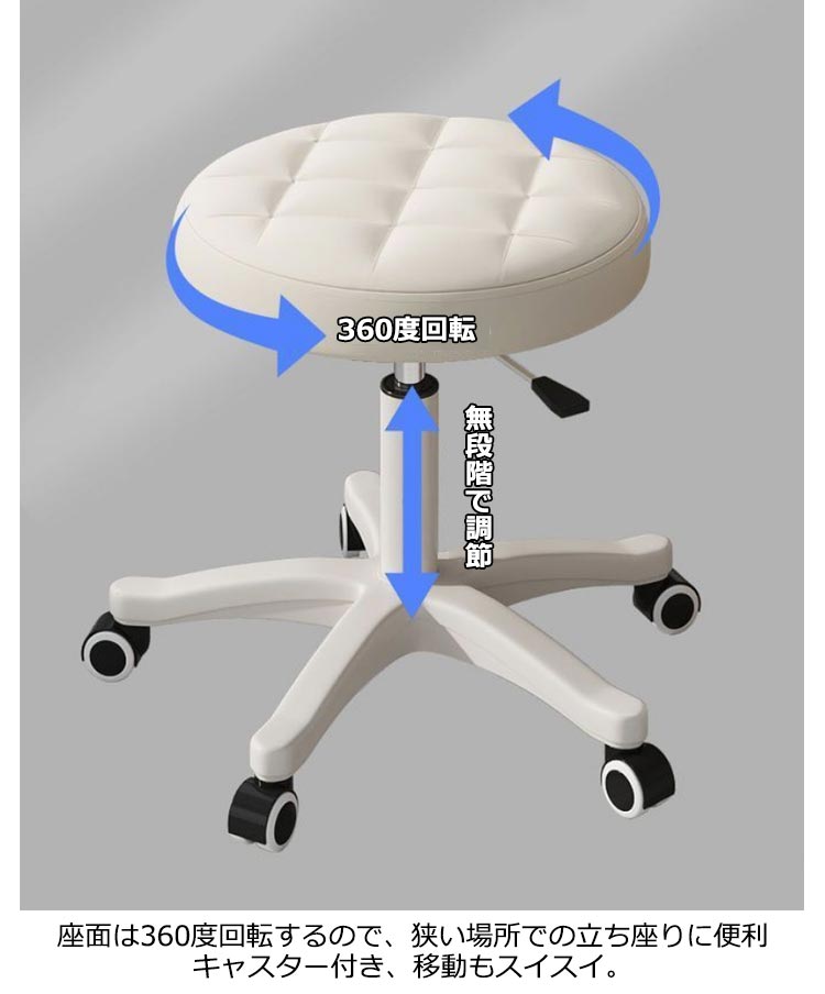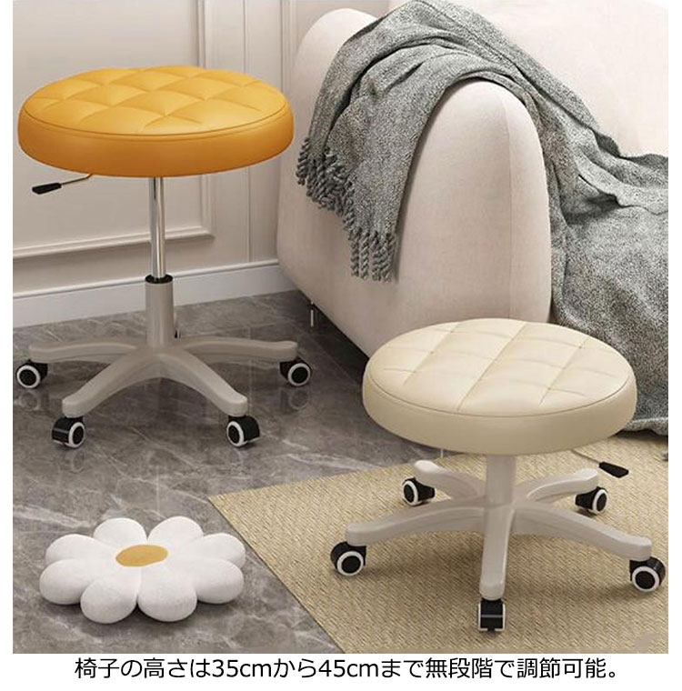 7色!360度回転、無段階で調節、5つのキャスター付きのスツール座面は撥水性が高く、お手入れしやすいPUレザー張り椅子の高さは35cmから45cmまで無段階で調節可能座面は360度回転するので、狭い場所での立ち座りに便利キャスター付き、移動もスイスイ組み立て簡単!女性でも一人で簡単に組み立てられます。こんなところで!キッチン、美容院、ショップ、病院の受付、サロン、パソコンチェアとしても