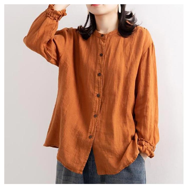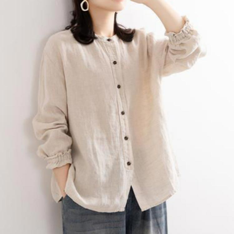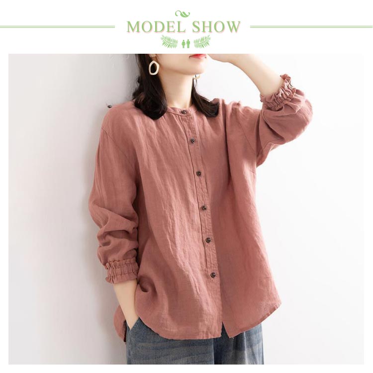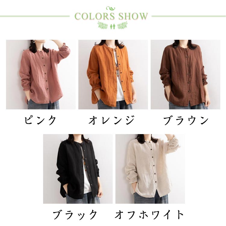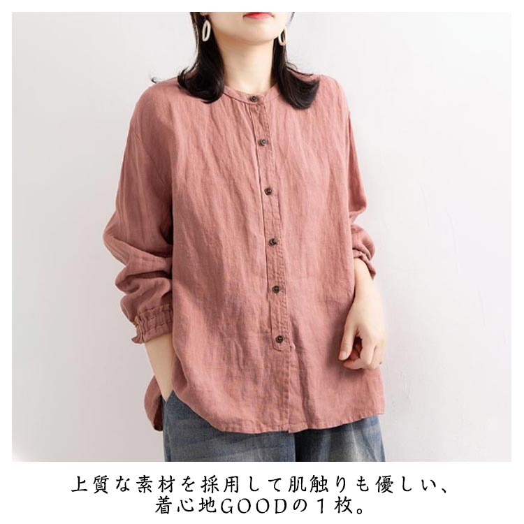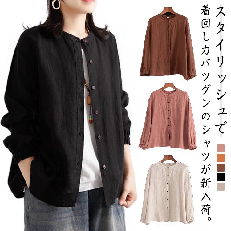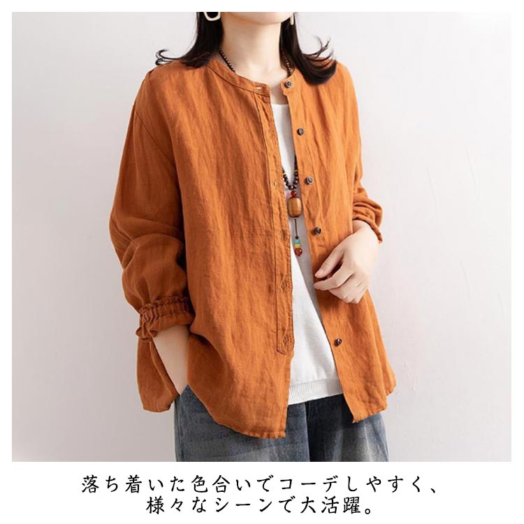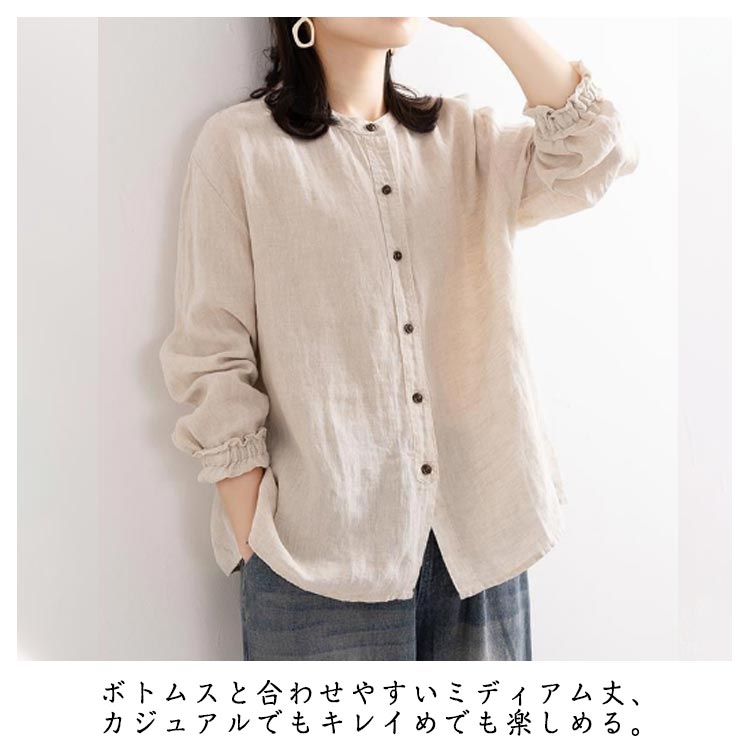 シャツブラウス レディース シャツ 綿麻シャツ フリル シャツ 長袖 リネン風シャツ トップス 袖ゴム バンドカラー タック カーディガン 羽織 アウター ゆったり 無地 開襟 春 秋 大人可愛い おしゃれ