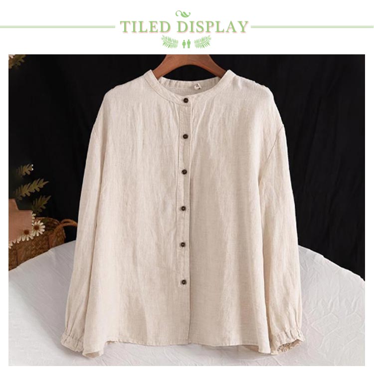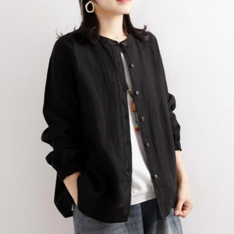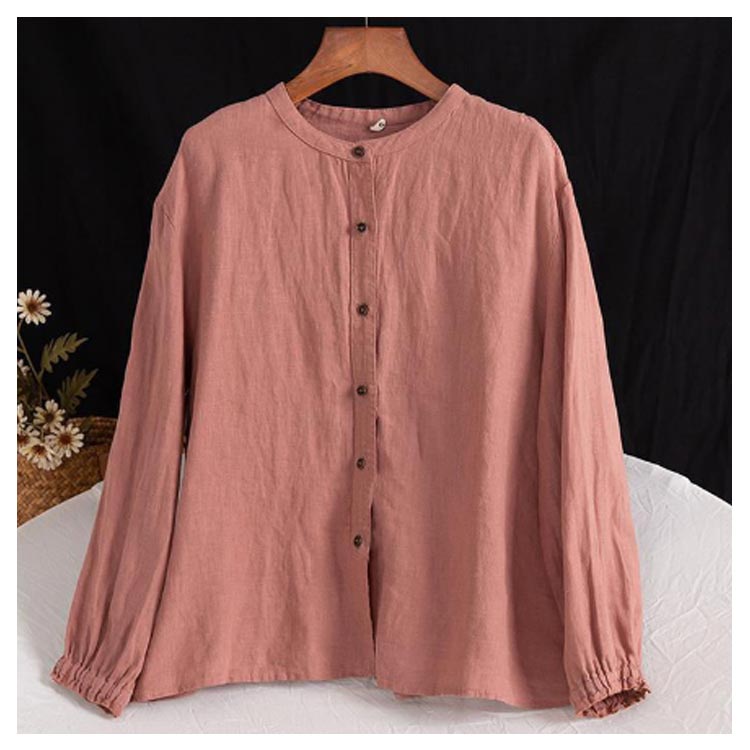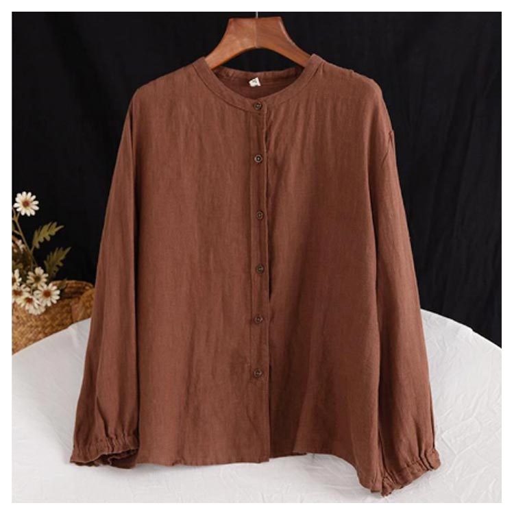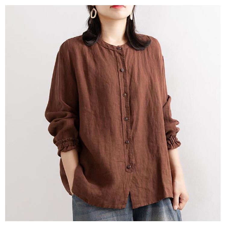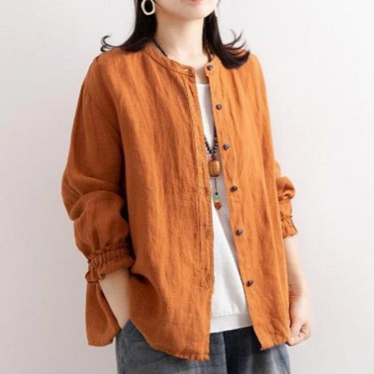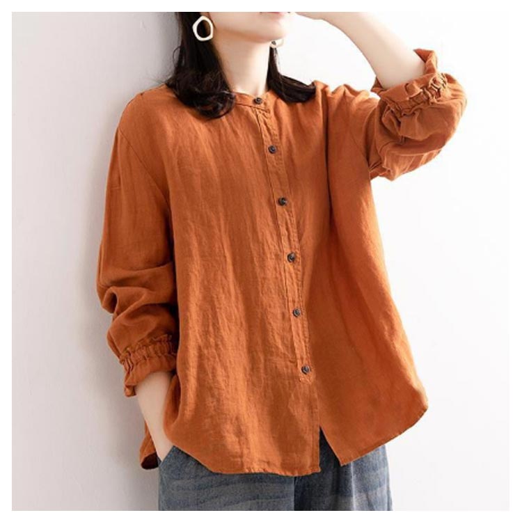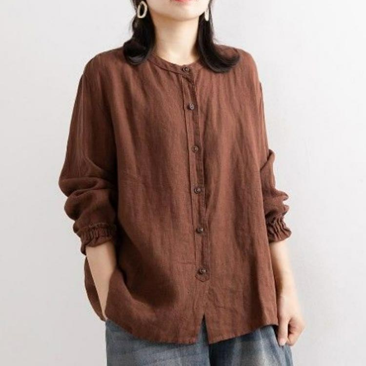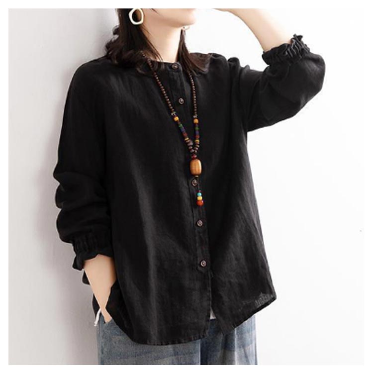 シャツブラウス レディース シャツ 綿麻シャツ フリル シャツ 長袖 リネン風シャツ トップス 袖ゴム バンドカラー タック カーディガン 羽織 アウター ゆったり 無地 開襟 春 秋 大人可愛い おしゃれ