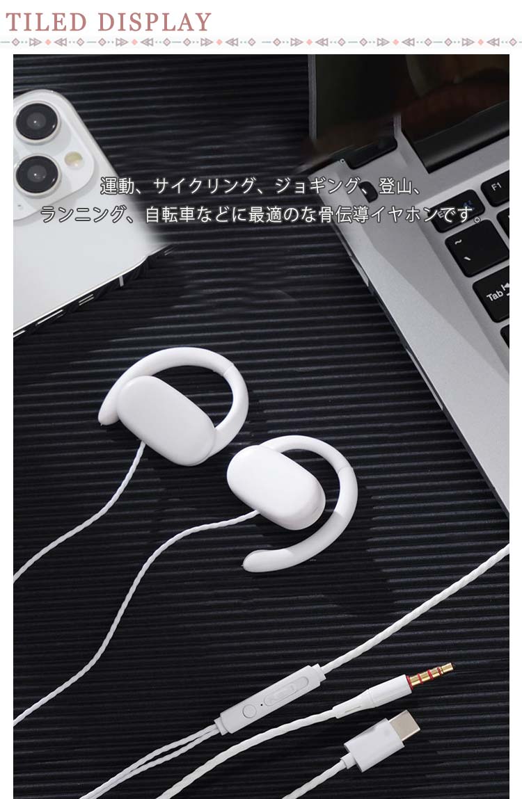 耳を塞がない・マイク付き・有線骨伝導イヤホン耳をふさがずに使用できるから、そばにいる家族の呼びかけ、ペットの鳴き声にもすぐに気づけて安心。イヤホンをつけたままでも自然な会話が可能です。鼓膜をふるわせずに聞けるので、長時間使用しても耳が疲れにくく、耳をふさがないので圧迫感を感じません。オープンイヤー型デザインで、着けていることを忘れるほどの軽いフィット感、長時間の使用でも疲れません。通話用マイクも搭載したイヤホンだから自分の声がこもらずに話しやすく、長時間続くリモートワークやオンライン会議でも、ストレスフリーに過ごせます。運動、サイクリング、ジョギング、登山、ランニング、自転車などに最適のな骨伝導イヤホンです。