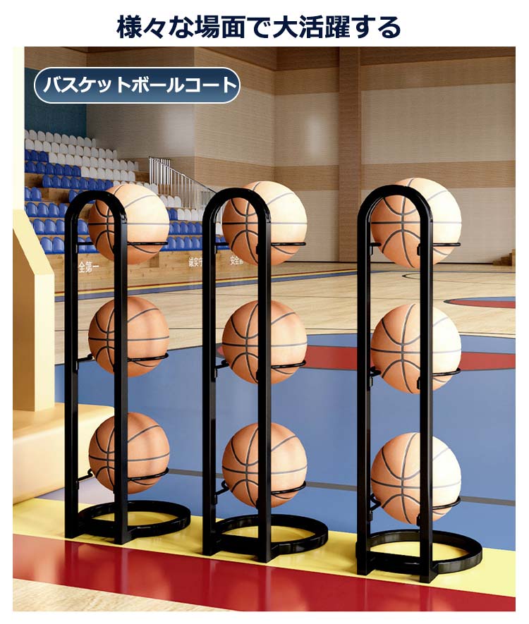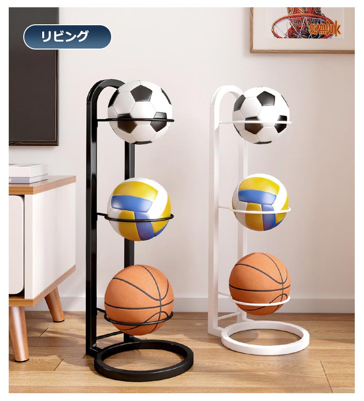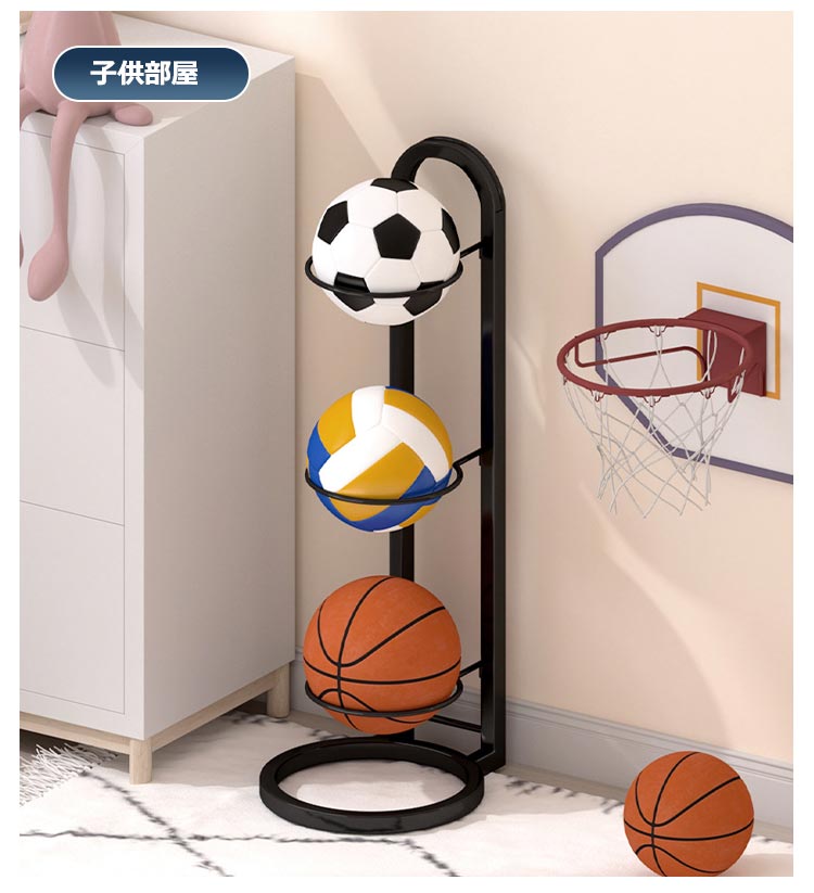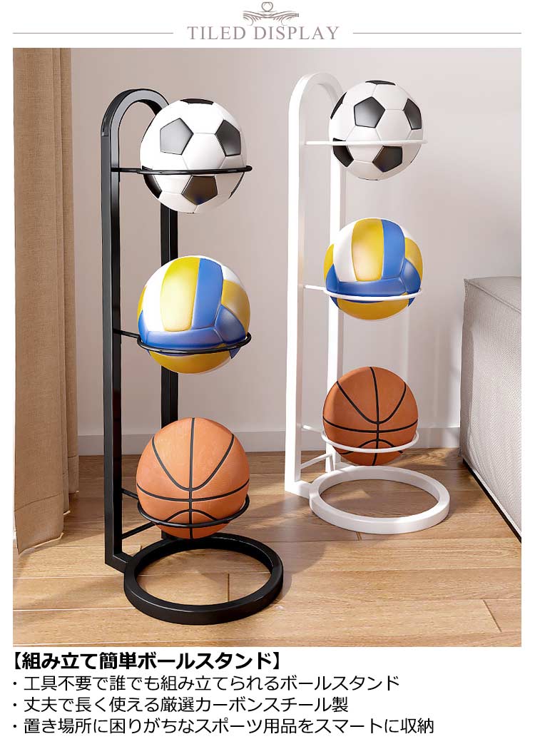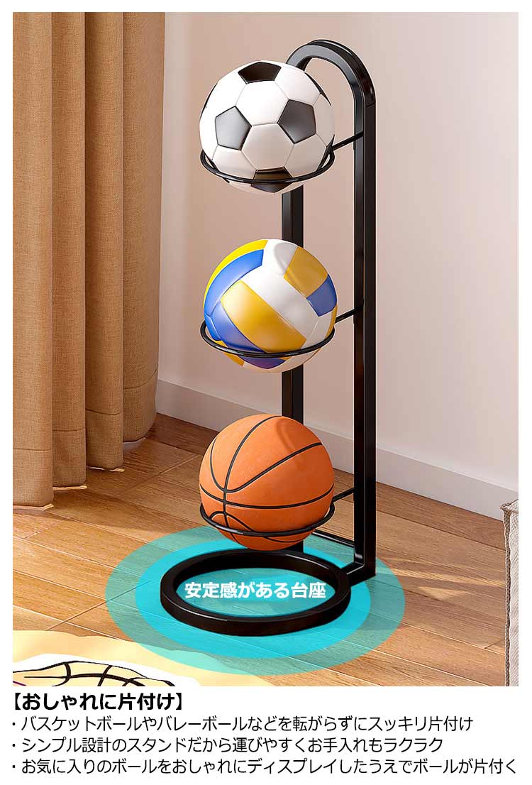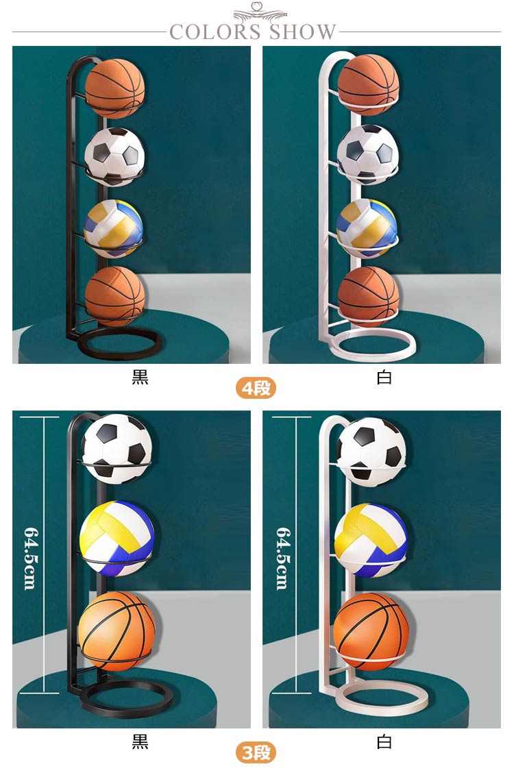 2段 3段 4段【組み立て簡単ボールスタンド】・工具不要で誰でも組み立てられるボールスタンド・丈夫で長く使える厳選カーボンスチール製・置き場所に困りがちなスポーツ用品をスマートに収納【おしゃれに片付け】・バスケットボールやバレーボールなどを転がらずにスッキリ片付け・シンプル設計のスタンドだから運びやすくお手入れもラクラク・お気に入りのボールをおしゃれにディスプレイしたうえでボールが片付く【置き場所を選ばない】・(玄関収納)狭い玄関でもスリムに置ける縦型収納・落ち着きのある色合いだから自分の部屋にも置ける・ガレージに置いてスッキリ収納もおすすめ