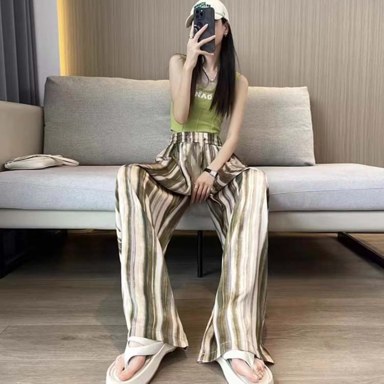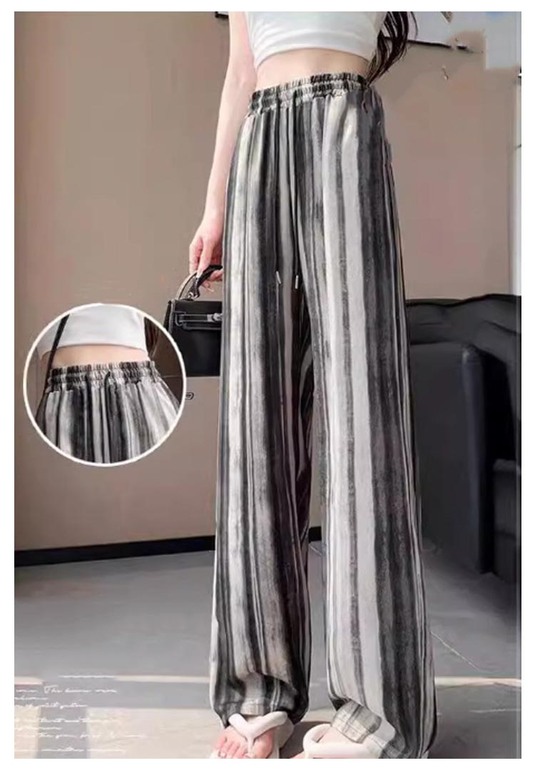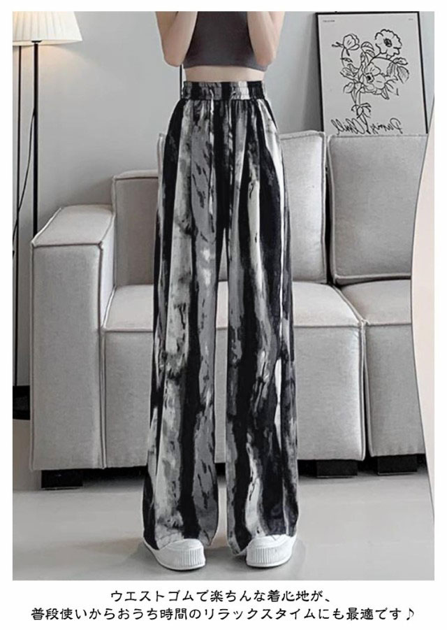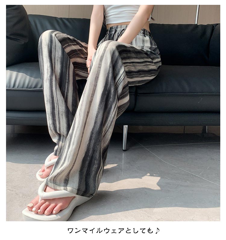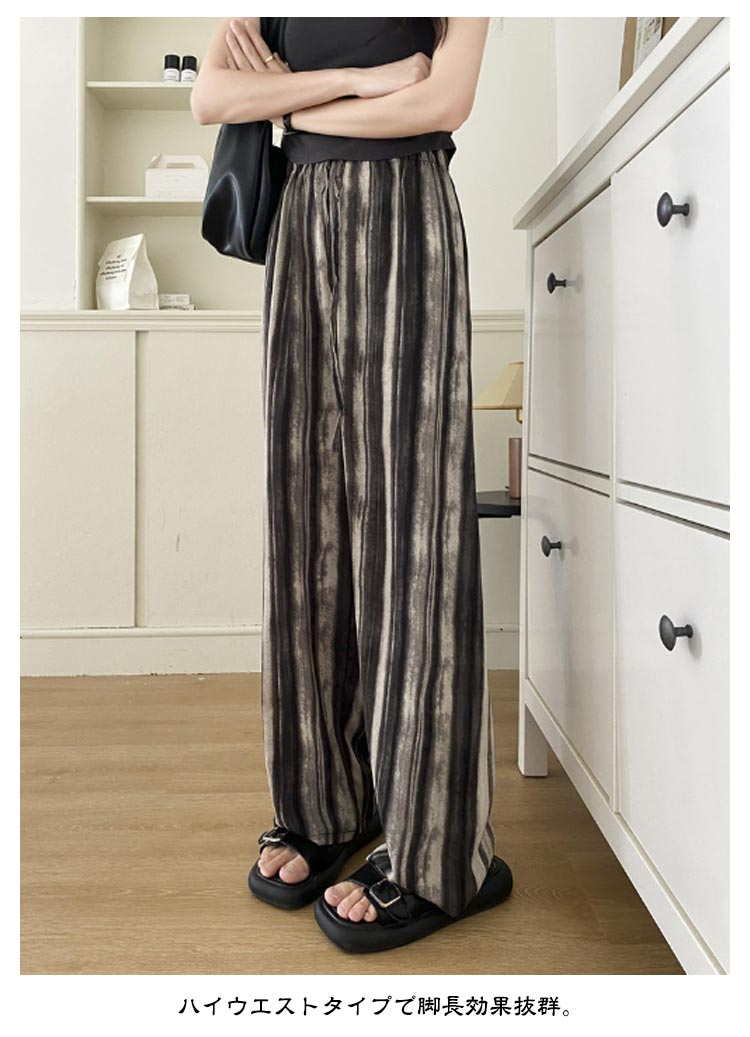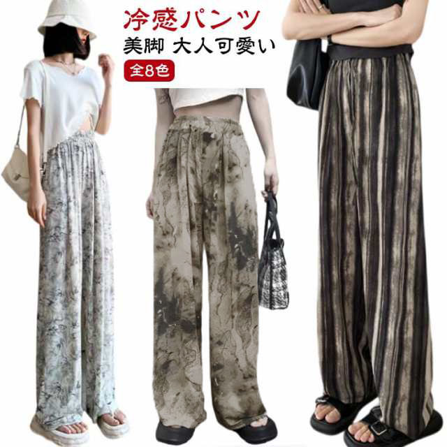 冷感 パンツ ワイドパンツ レディース 美脚 涼しい ストライプ さらてろ UVカット 春夏 イージーパンツ ウエストゴム ボトムス ズボン ハイウエスト 楽ちん ゆったり 体型カバー 流行 大人可愛い カジュアル