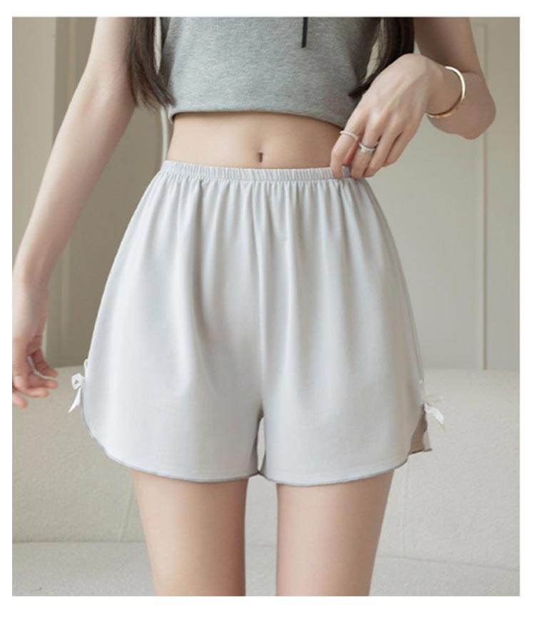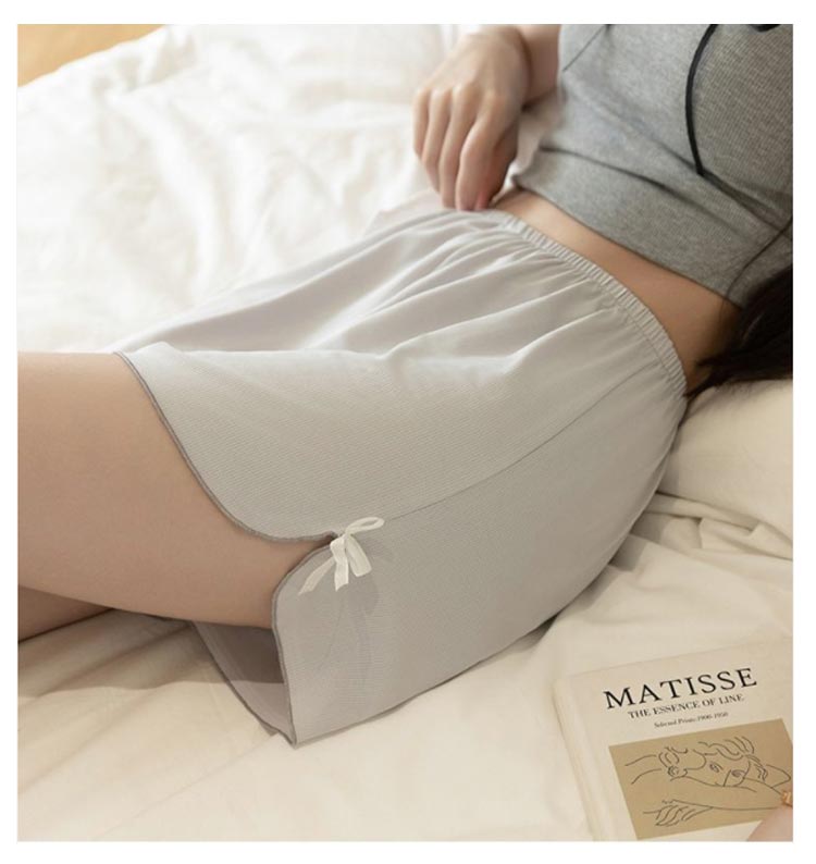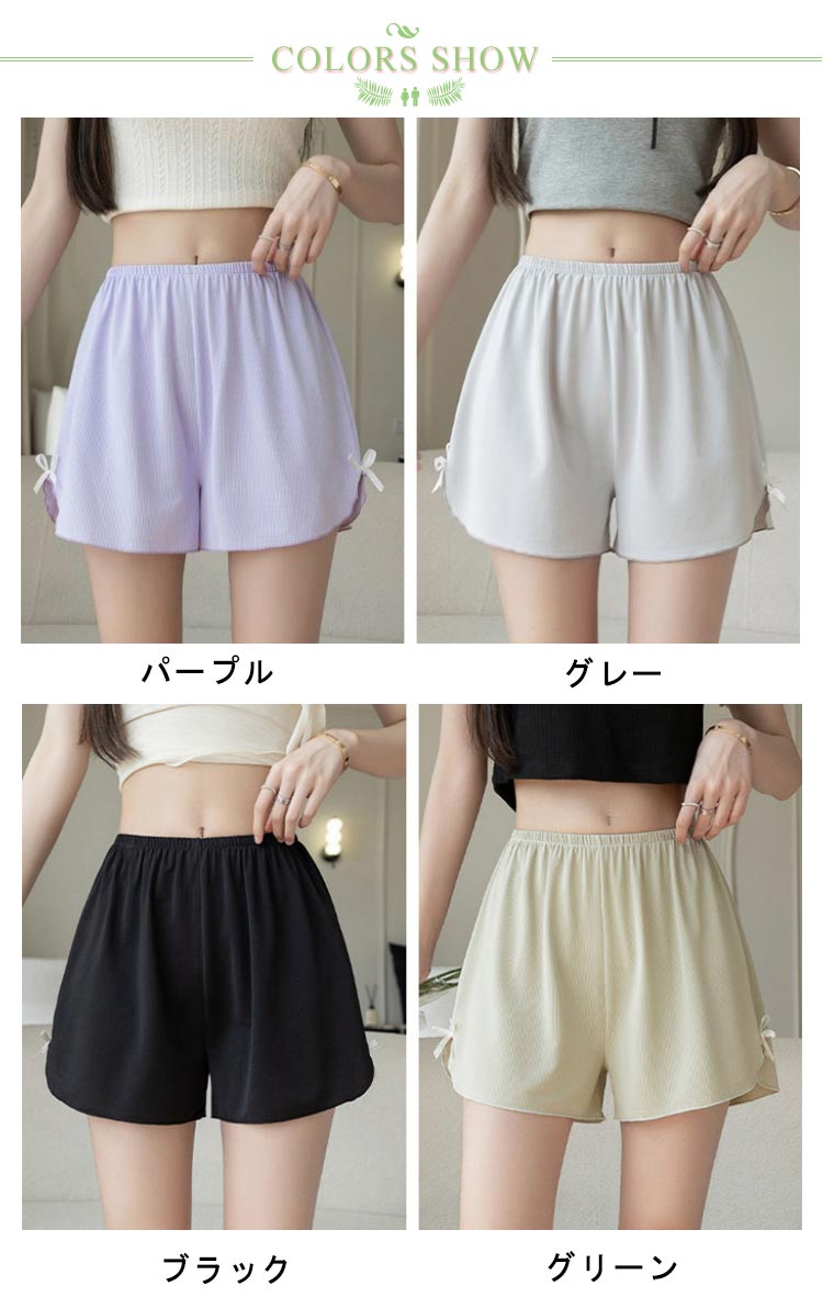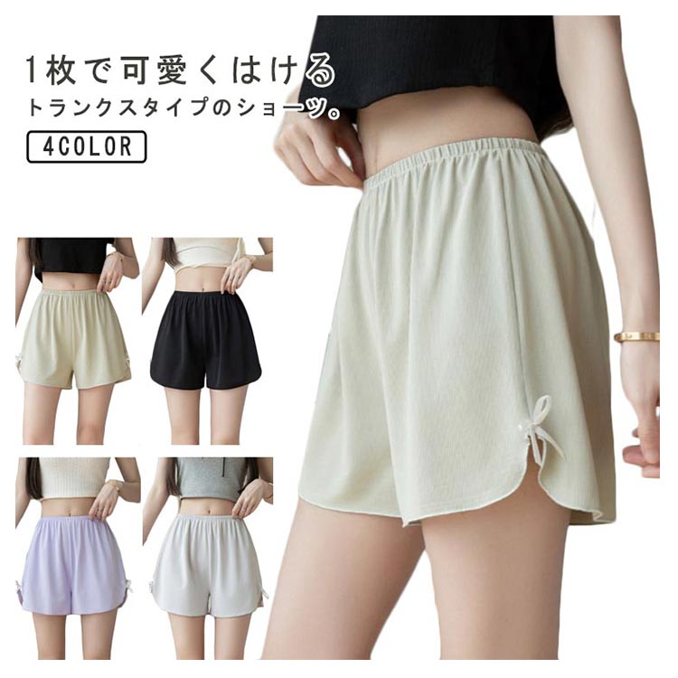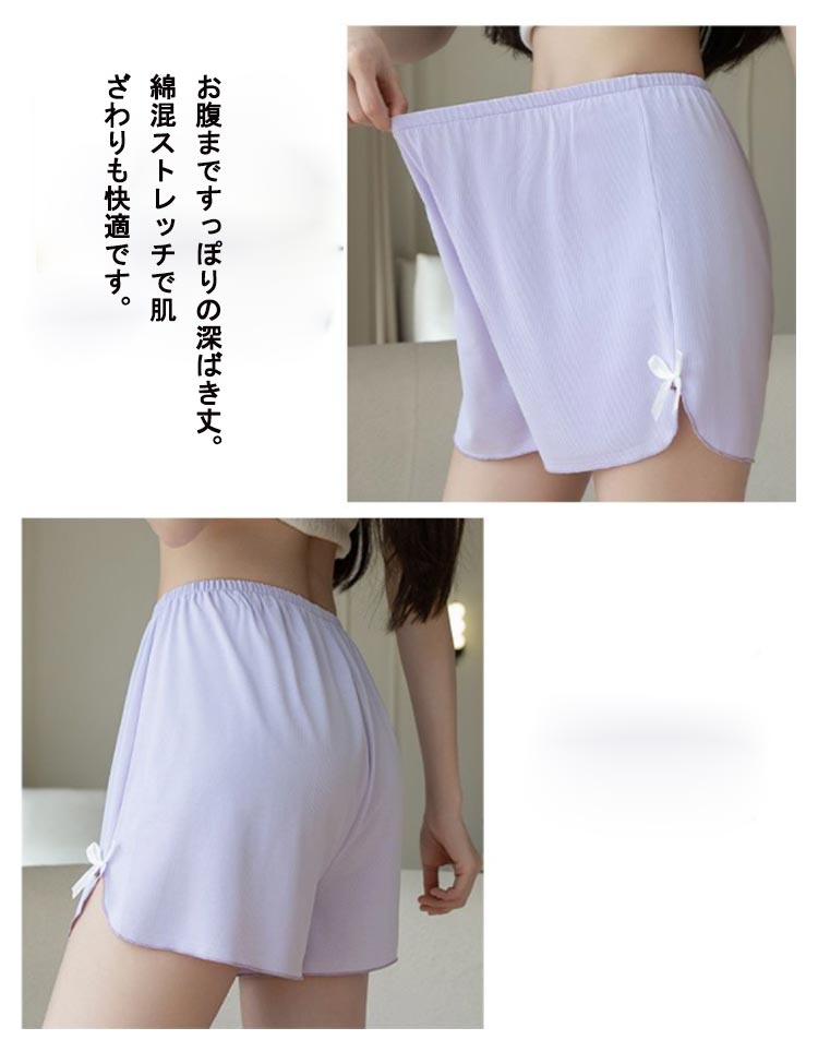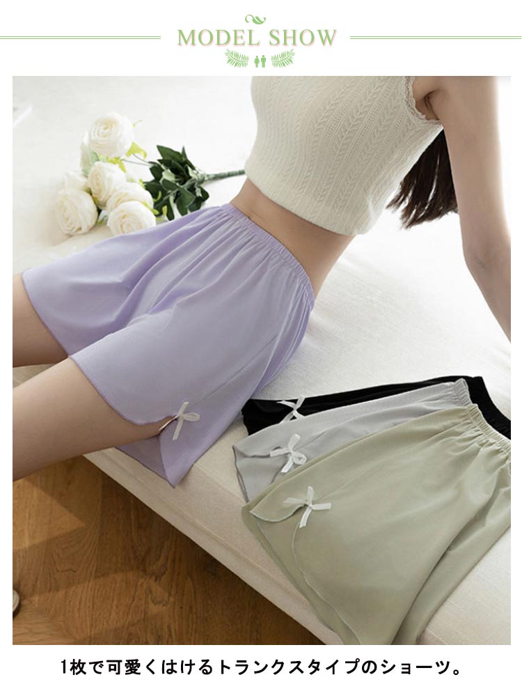 1枚で可愛くはけるトランクスタイプのショーツ。裾リボン仕様で太ももを締めつけないからゆったりラクちん。お腹まですっぽりの深ばき丈。綿混ストレッチで肌ざわりも快適です。滑らかな風合いで肌に優しく、シルクライクな肌触りが特徴。ルーズなシルエット、締め付け感なく、おうちでのリラックスタイムに最適。ワンピースやワイドパンツなど広がりのあるボトムスのペチパンツとしてもお勧め。