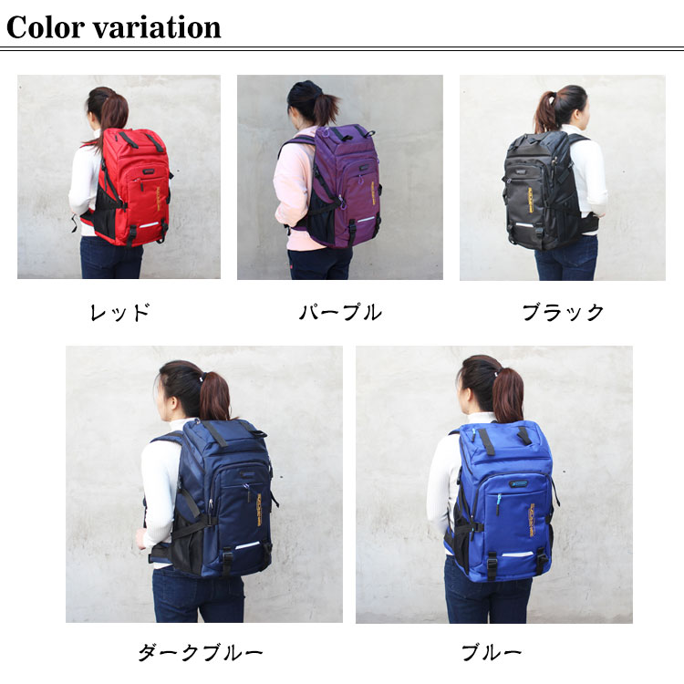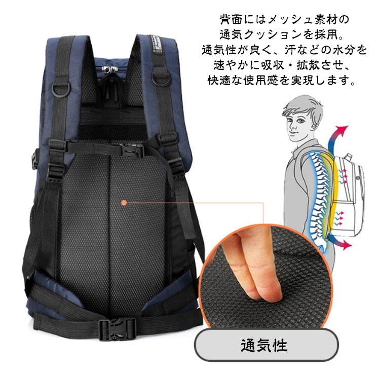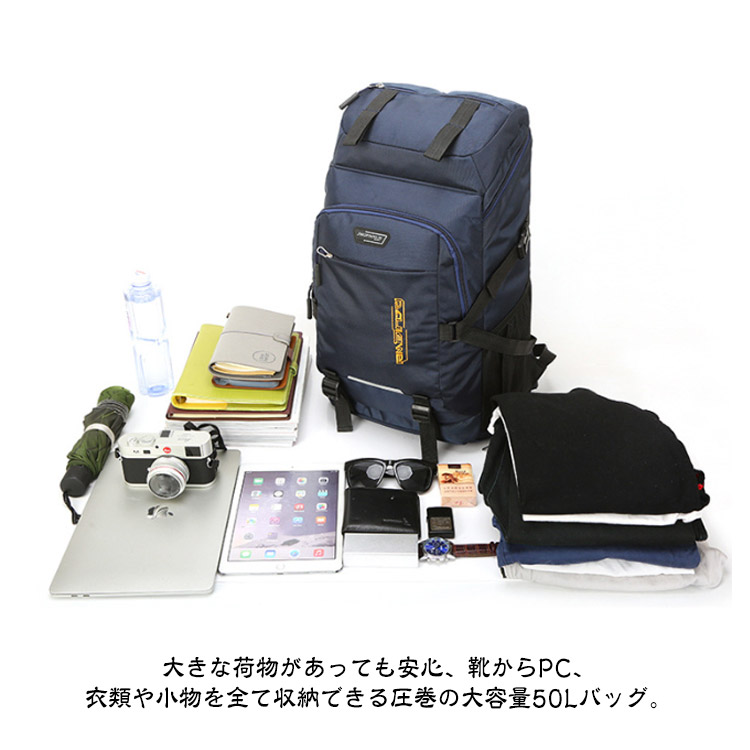 【7color】【撥水加工】【50L大容量】【リュックサック】大きな荷物があっても安心、靴からPC、衣類や小物を全て収納できる圧巻の大容量50Lバッグ。ウエストベルトとチェストベルトの2つのベルトで安定的にリュックを体に固定補強したショルダーストラップで耐荷重性能が高く耐久性があり重い荷物をもってもほつれや破れに強くなっています。背面にはメッシュ素材の通気クッションを採用。通気性が良く、汗などの水分を速やかに吸収・拡散させ、快適な使用感を実現します。撥水加工がされた防水のリュックサック多少の雨であれば水を弾く撥水性。アウトドアや登山、旅行用だけでなく、通勤通学などにも使える大容量リュックです!