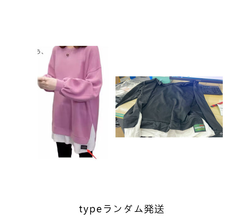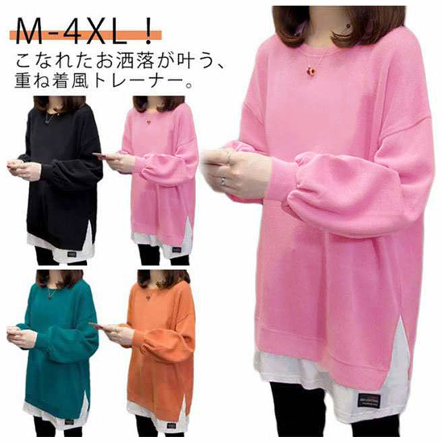 M-4XL!レイヤードスタイルがこれ1枚で完成!こなれたお洒落が叶う、重ね着風トレーナー。お腹まわりが気にならないシルエットで、細見えが期待できます。ゆったりしたサイズ感なので、うれしい体型カバー効果も!裾の重ね着風デザインがキュートな一枚です。ルームウェアとして着て頂いても楽ちんで可愛いですね♪デニムを合わせる定番コーデはもちろん、ミニボトムを合わせてワンピ風に着てもかわいい♪裾スリットがこなれ感と細魅せを演出!トレンドのレイヤードコーデが1枚で完成する重ね着風トップス!